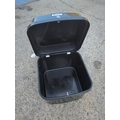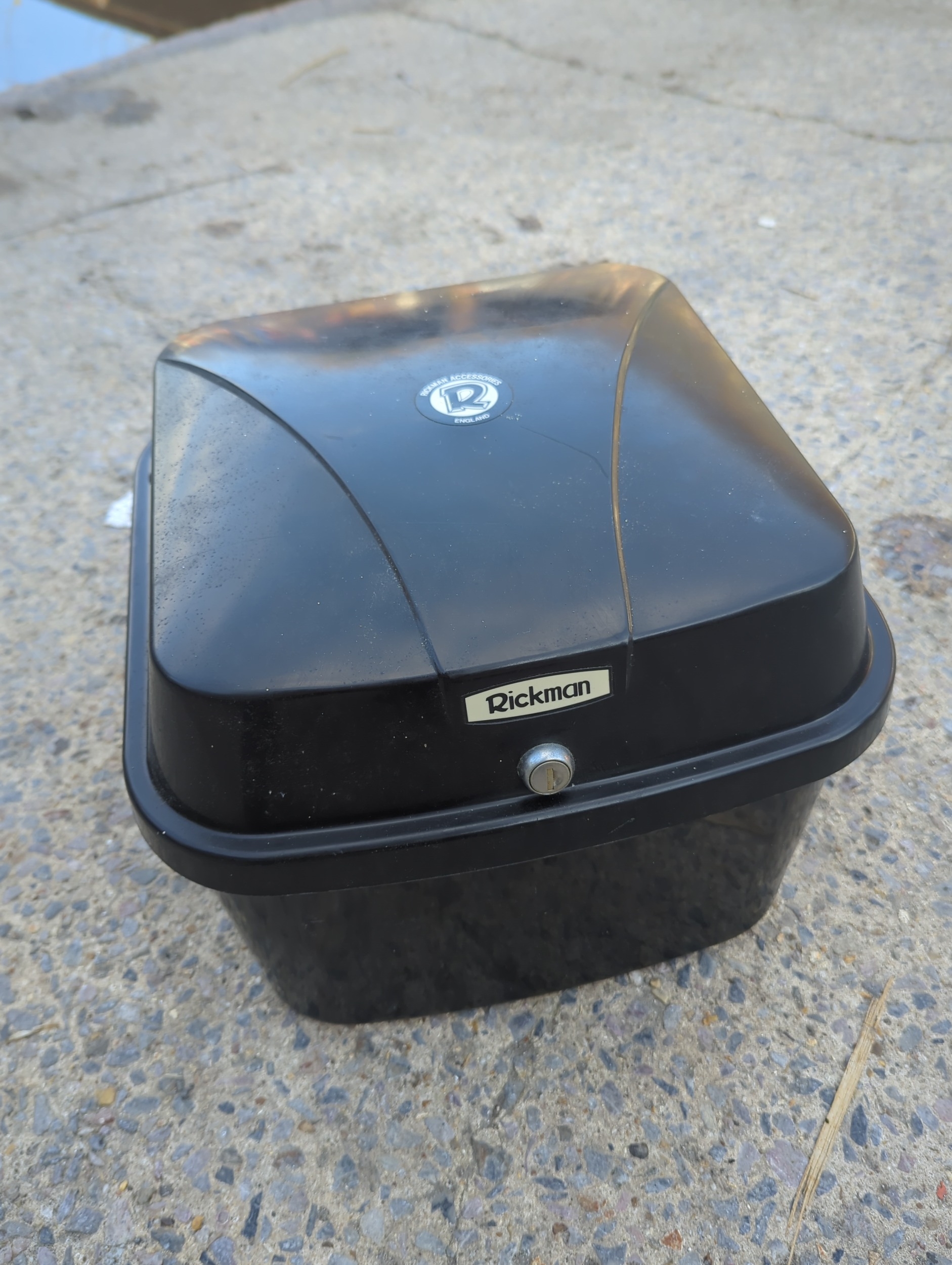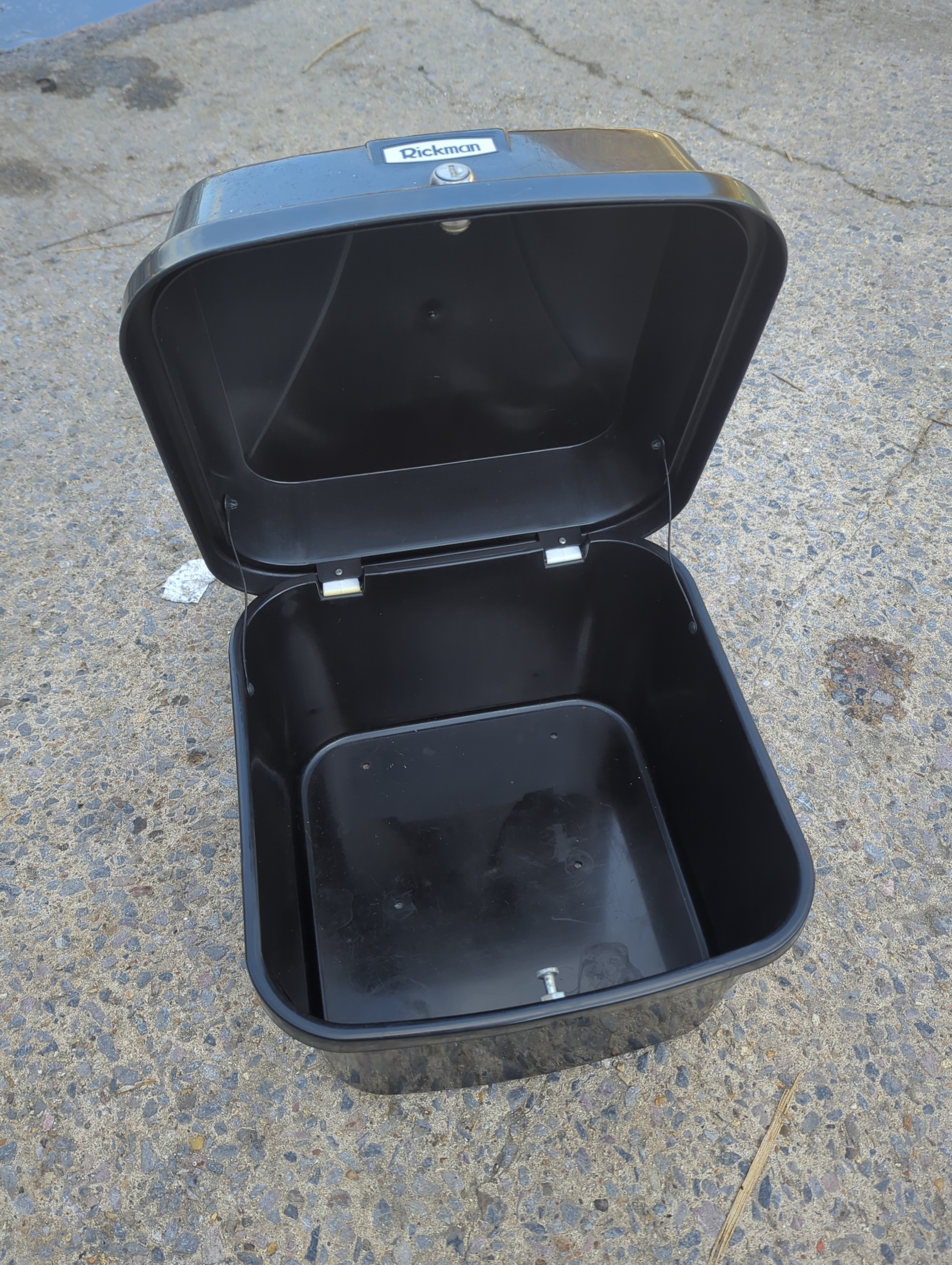 This black Rickman motorcycle top case features a spacious interior suitable for outdoor storage. The case has a lockable mechanism for added security and is marked with the Rickman branding. It is designed to be durable and weather-resistant, ideal for attaching to a motorcycle for extra storage capacity on the move.