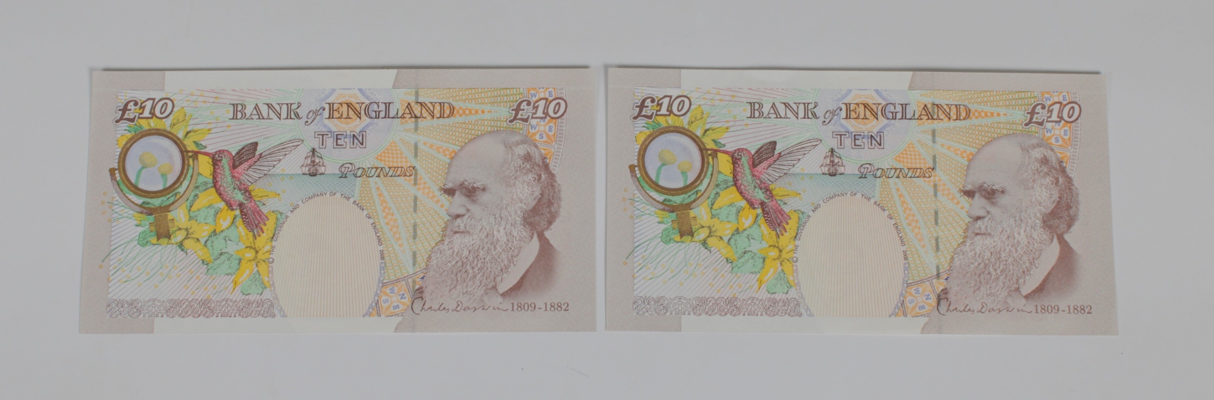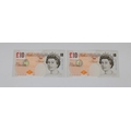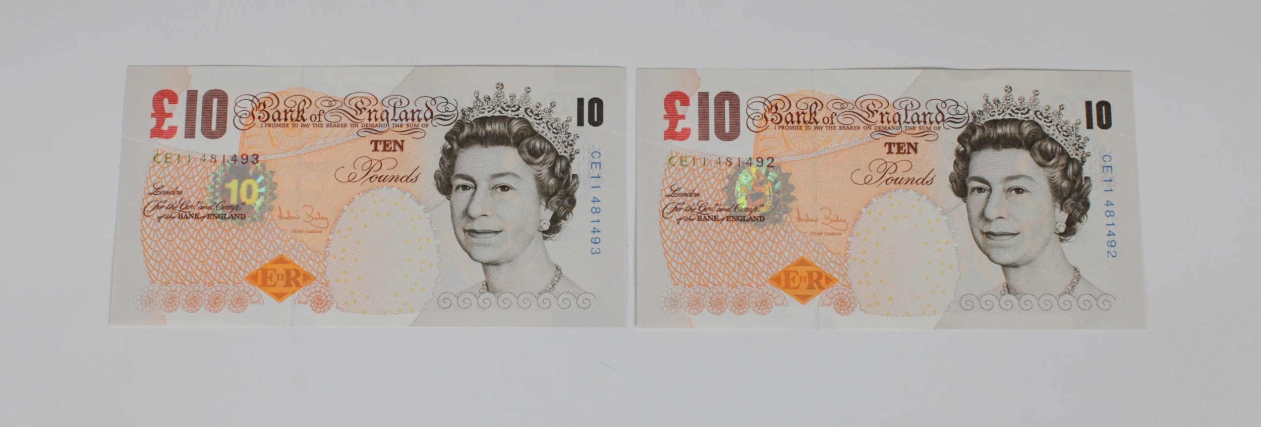 British Banknotes - Bank of England Ten Pounds consecutive pair c.2004, Signatory Andrew Bailey, serial numbers CE11 481492 & CE11 481493, about uncirculated to UNC. (2)
