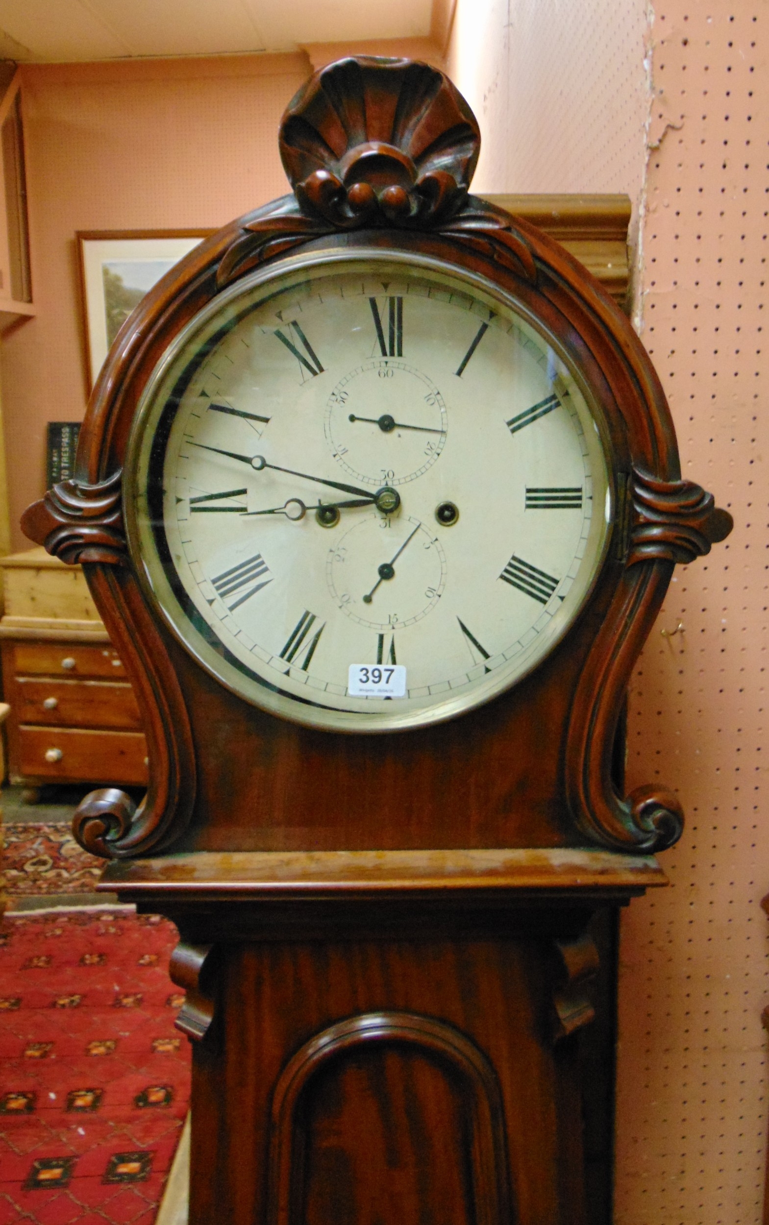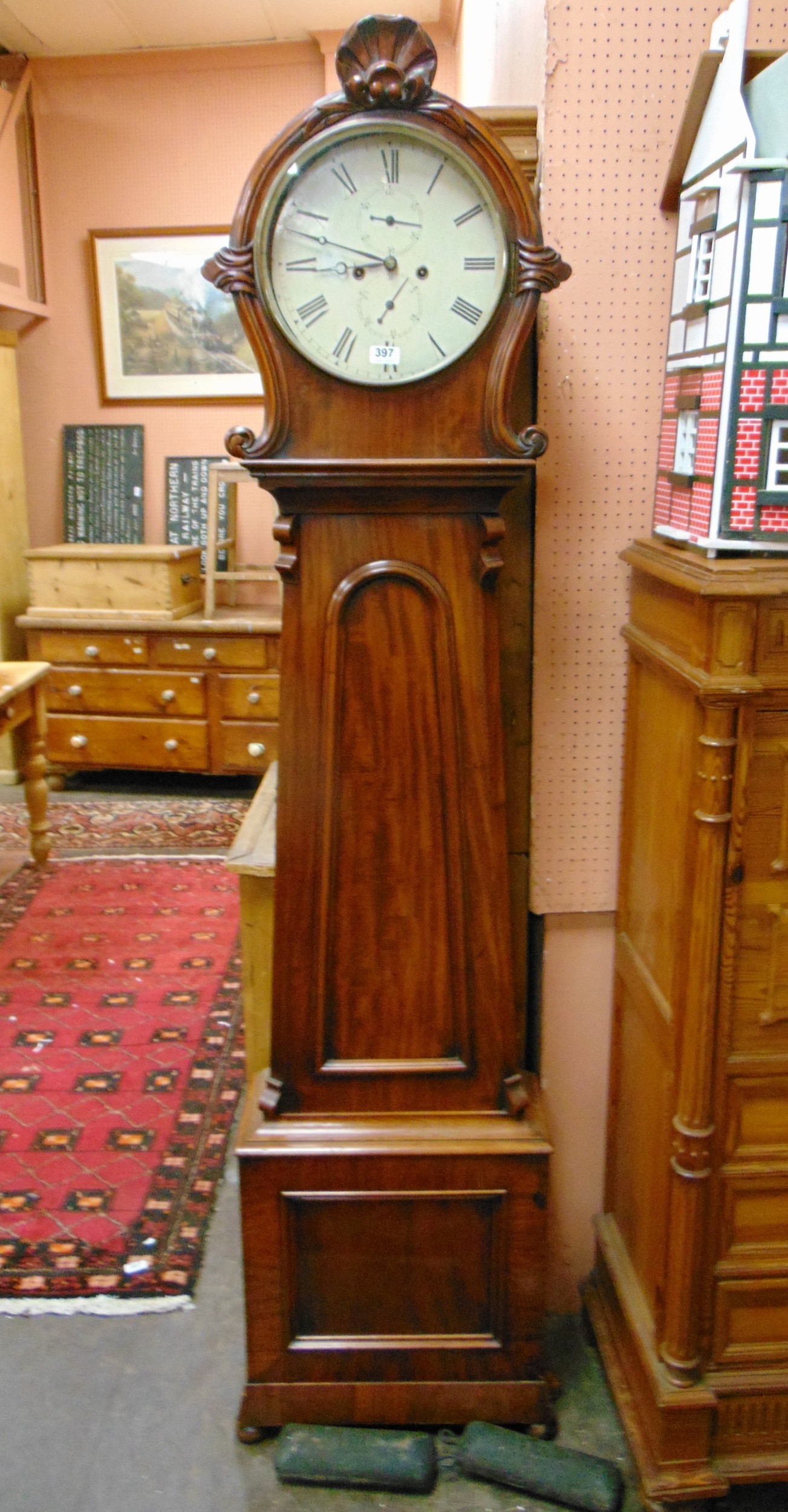 Antique Scottish mahogany 8 day longcase clock, circular enamel dial with Roman numerals, 80.5" high.