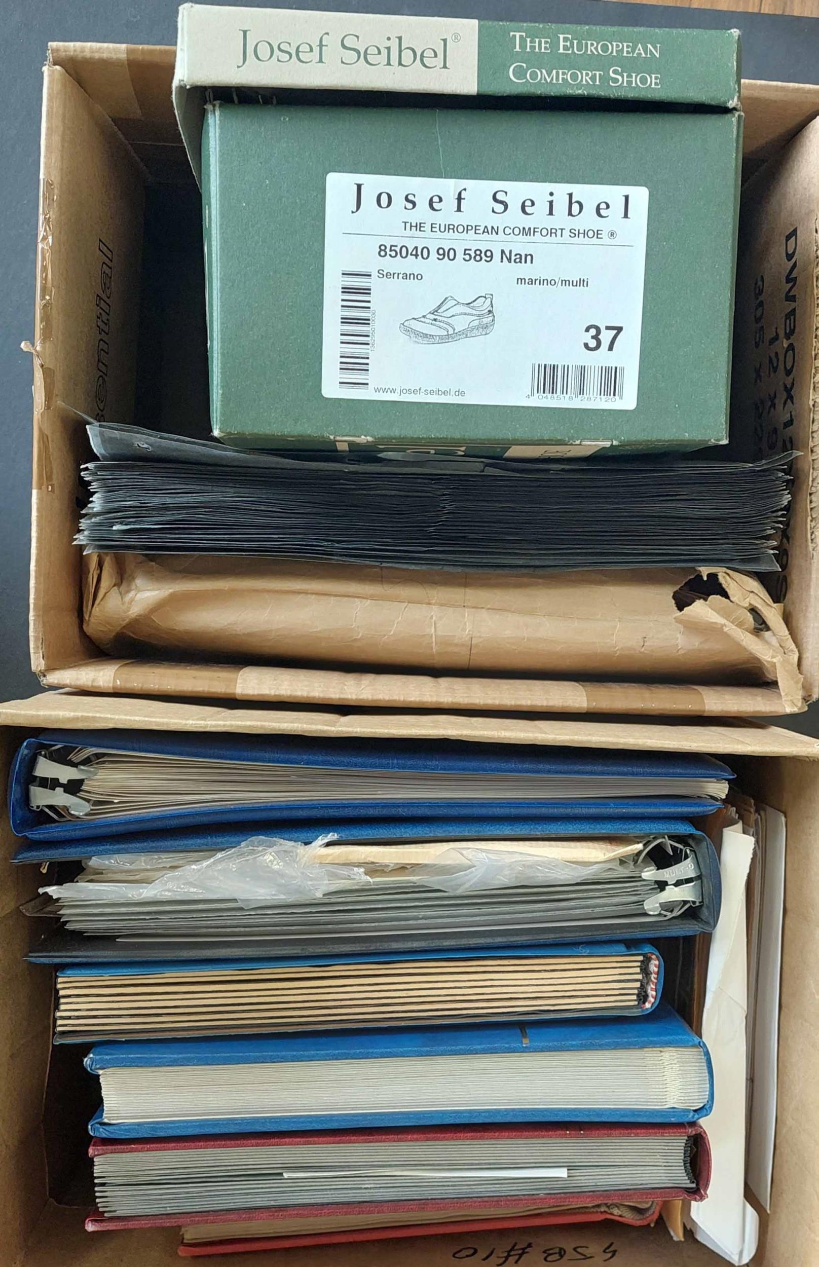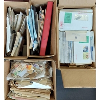 ECLECTIC ACCUMULATION: Two boxes containing 5 albums/stock books with a mix of mint & used GB, commonwealth & foreign stamps inc. QEII mint pre-decimal collection. Also an album, shoebox, large envelope, and stock book pages of world mix postal history (mostly modern). A good lot for sorting. (qty) Cross Reference: GREAT BRITAIN