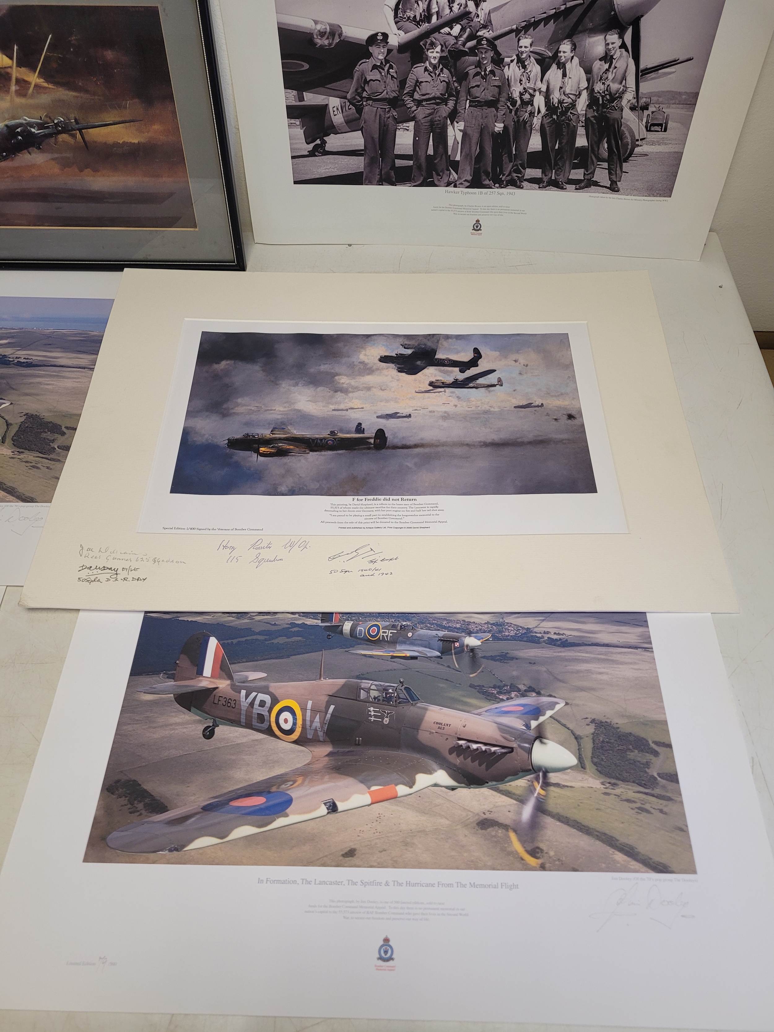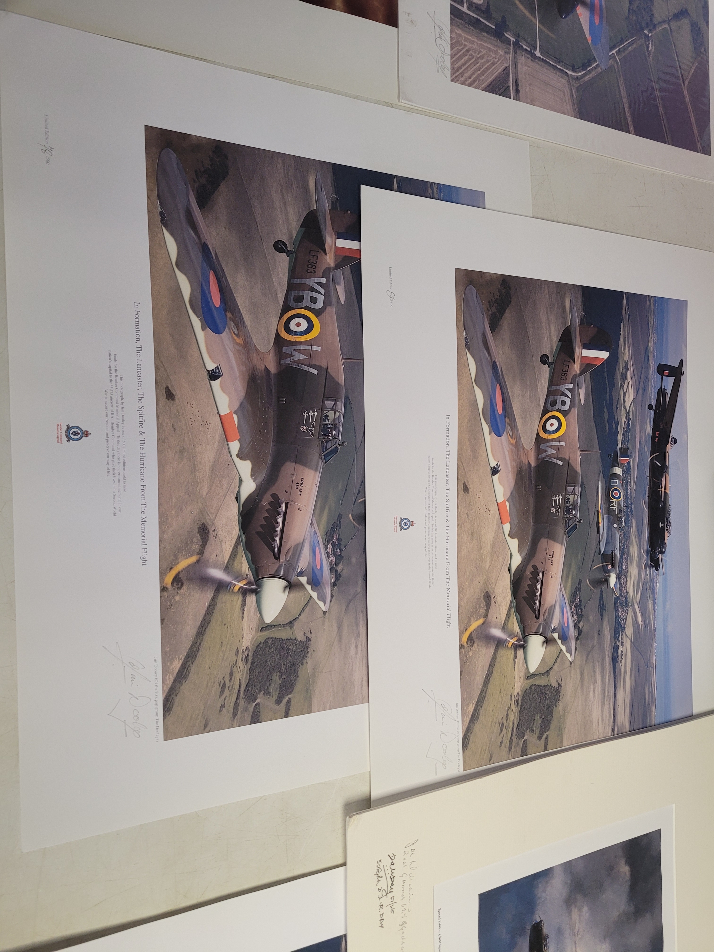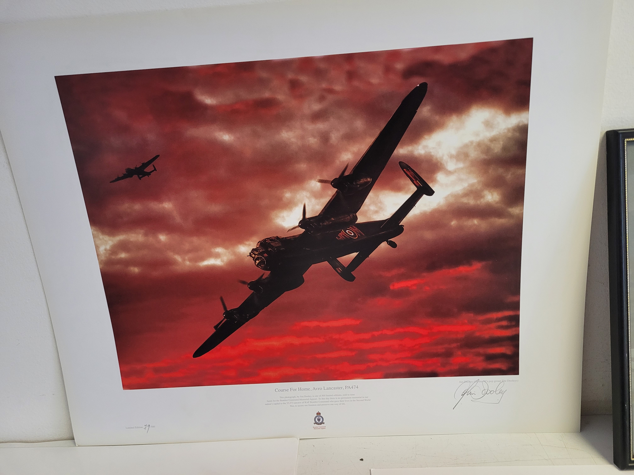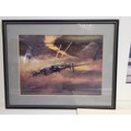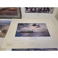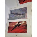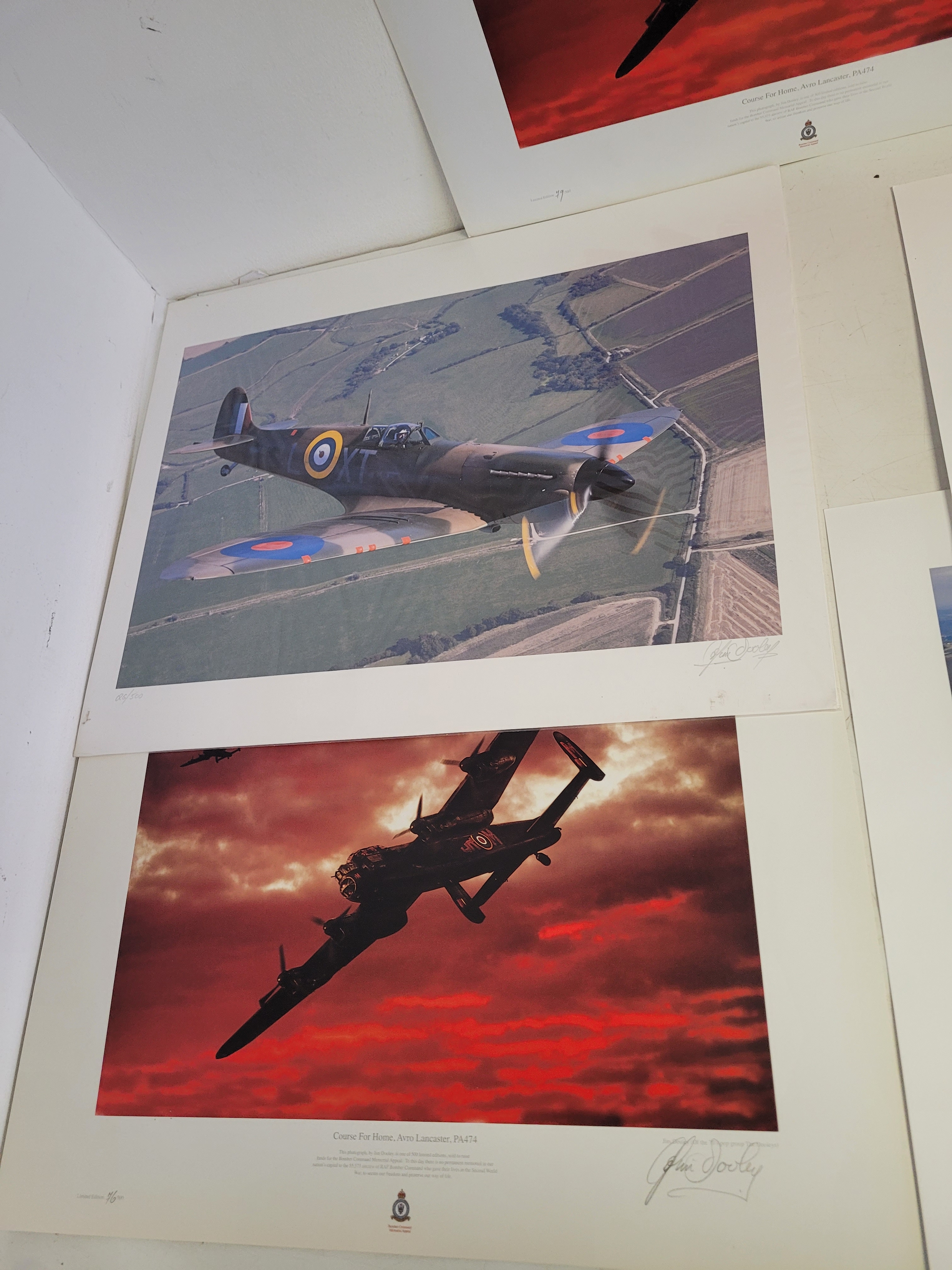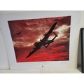 Collection of WWII Aviation Prints by James Dooley + Spitfire Oil Painting This lot features a curated selection of commemorative aviation art, prominently featuring the work of James Dooley. These prints are part of a series celebrating the Battle of Britain Memorial Flight (BBMF) and the legendary aircraft of the RAF Under the Moon": The striking silhouette of an Avro Lancaster bomber against a vivid, fiery orange and red sunset. This is one of Dooley's most iconic "night patrol" compositions.
