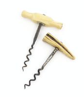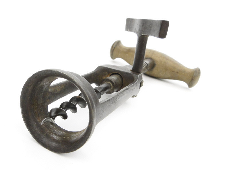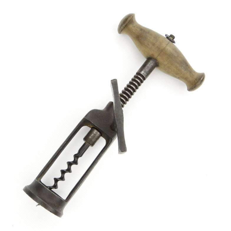 Antique lever action corkscrew with turned wooden handle, 18cm in length