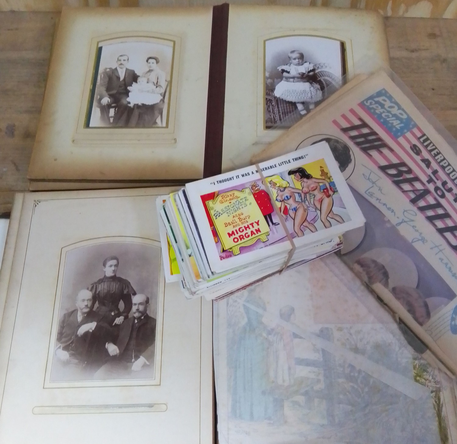Two antique photograph albums, a collection of approx. 173 seaside postcards and a Liverpool Echo supplement 'Salute to the Beatles 1964.