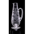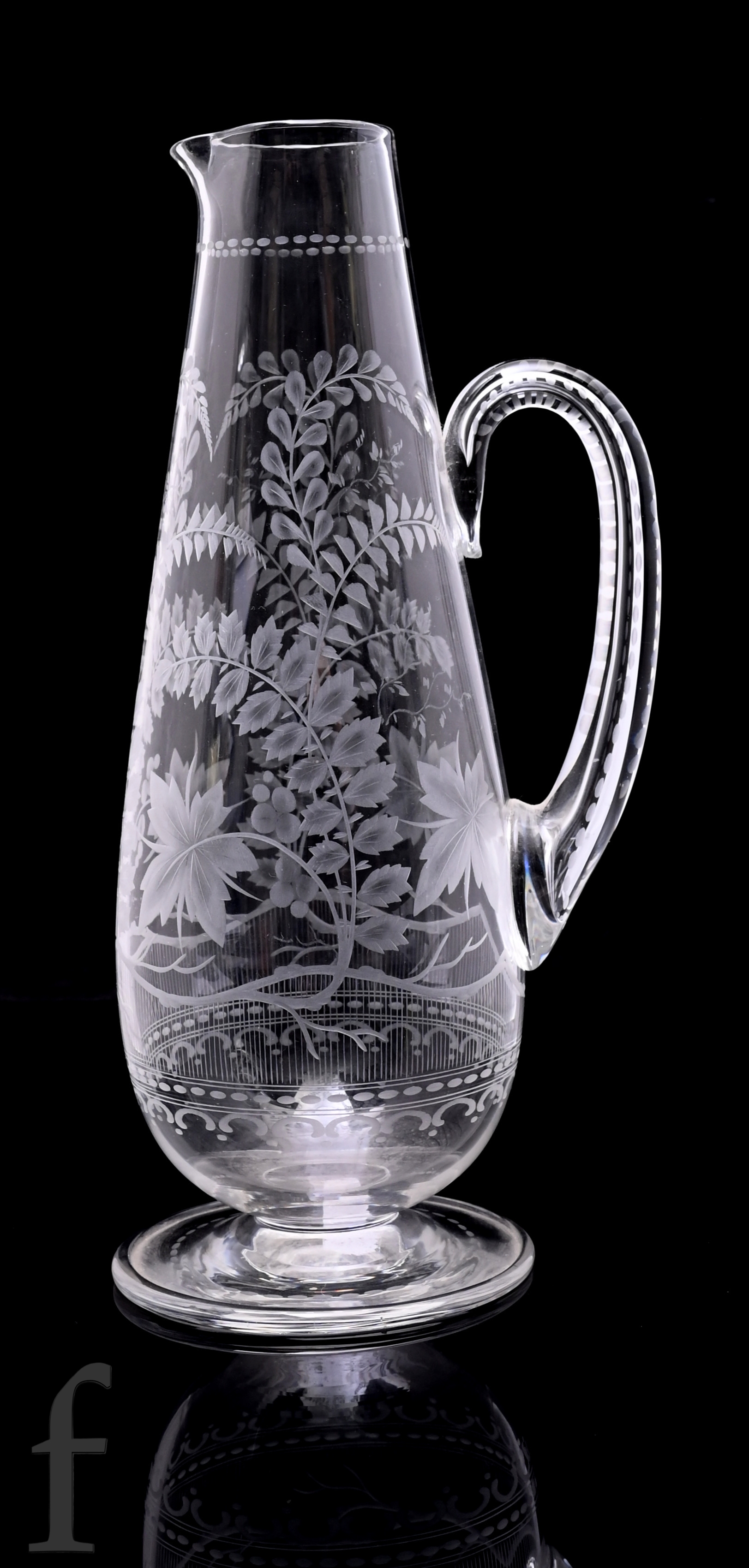 A late 19th Century Stourbridge clear crystal claret jug of footed tapered sleeve form with applied hollow blown handle, the body engraved with botanical fern studies above repeat line borders, height 27cm.