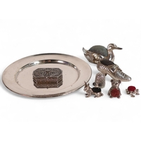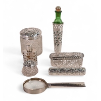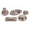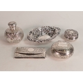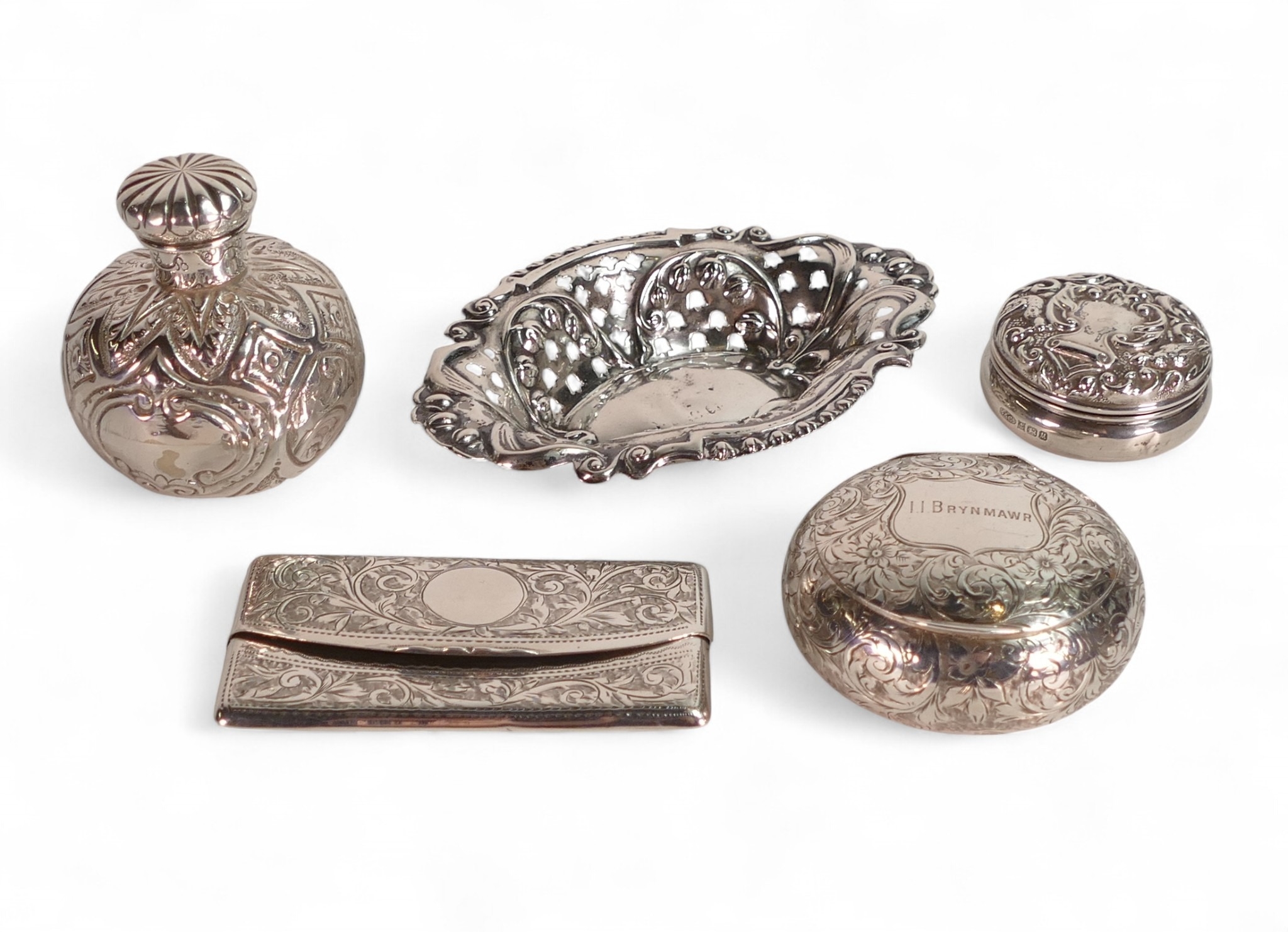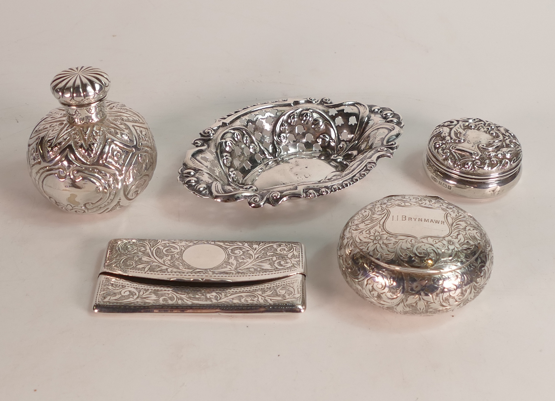 Five hallmarked silver items, including perfume bottle, card case, snuff box, pill box & pierced dish, 160.9g