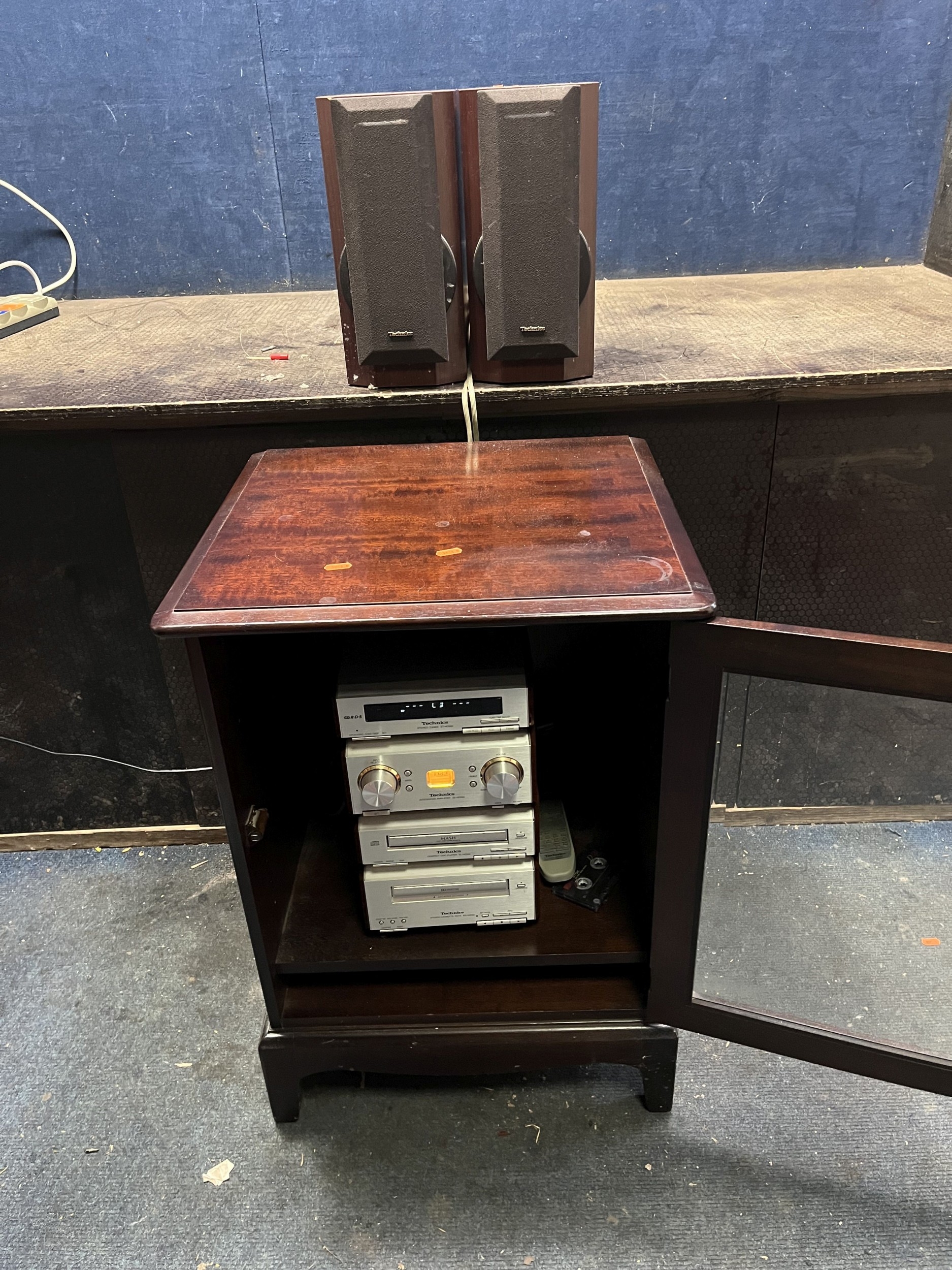A TECHNICS HD-560 HI FI IN A STAG MINSTREL CABINET and speakers (PAT pass, amp, tuner and speakers working, but CD and tape drawers don't open)