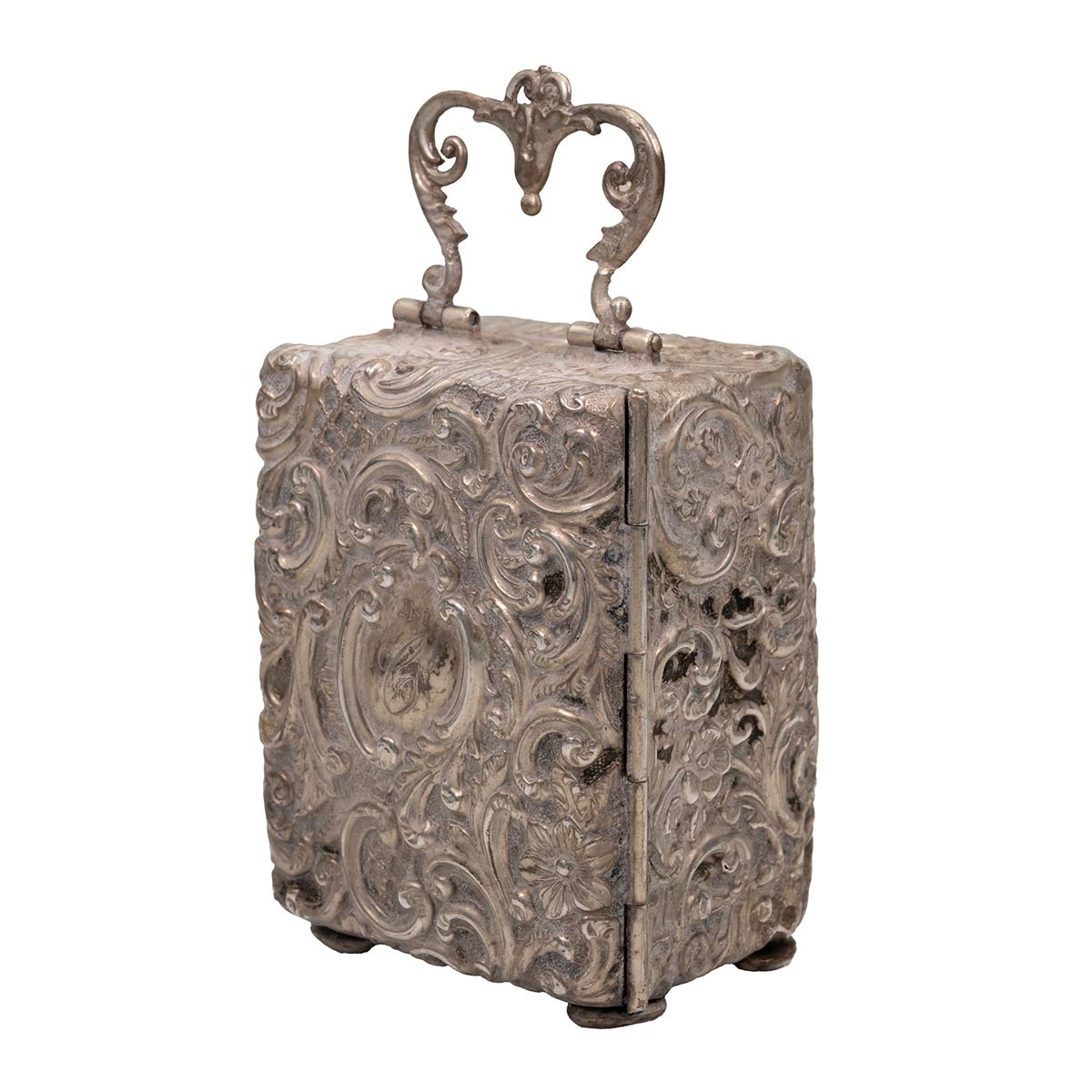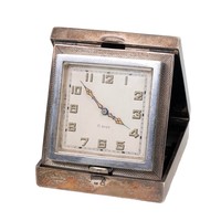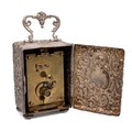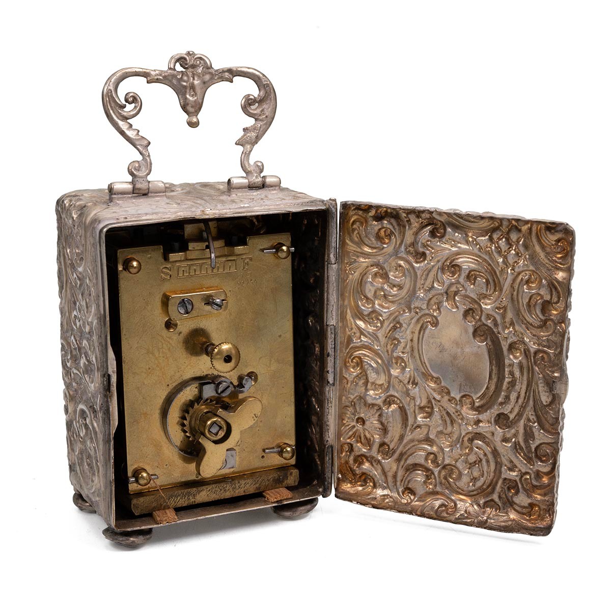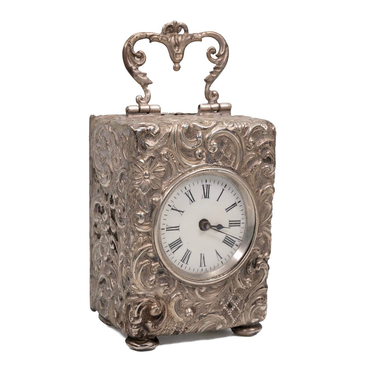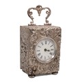 Silver cased carriage clock with all-over embossed decoration, with carrying handle and monogrammed cartouche to the rear panel, maker Henry Mathews, stamped 55, H7.5cm.