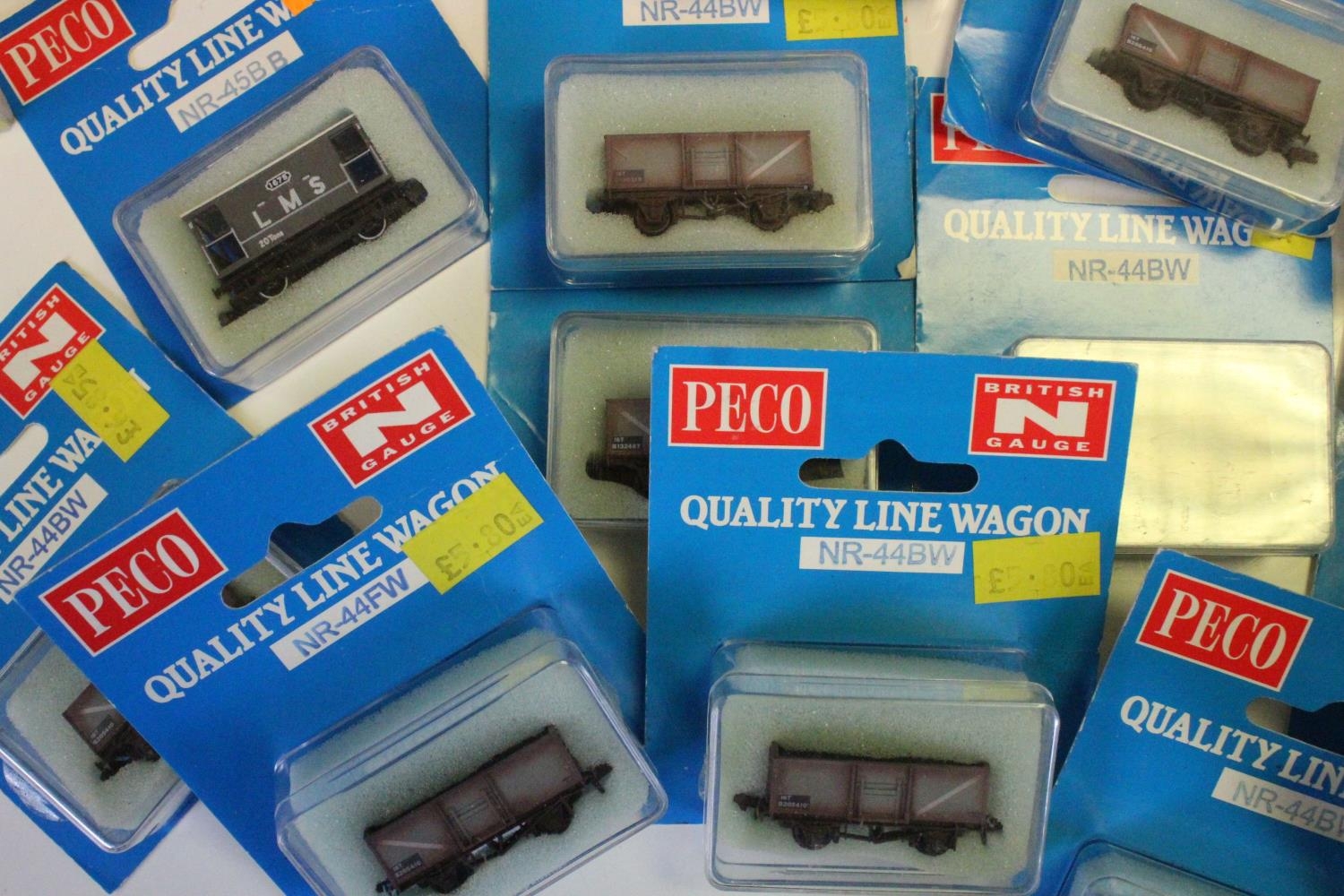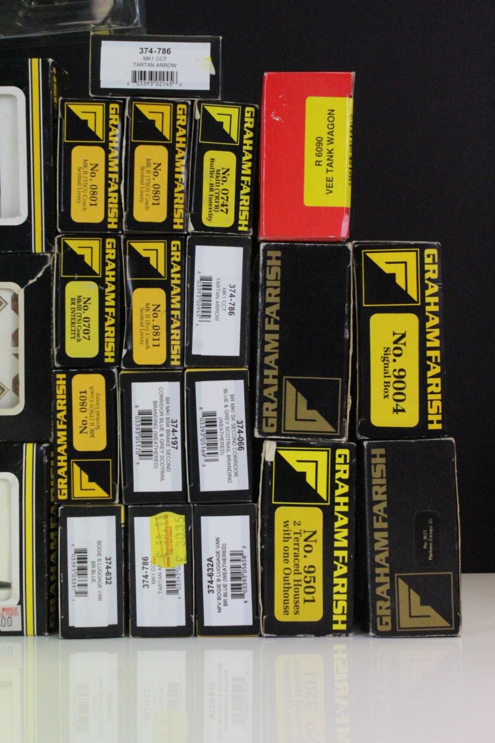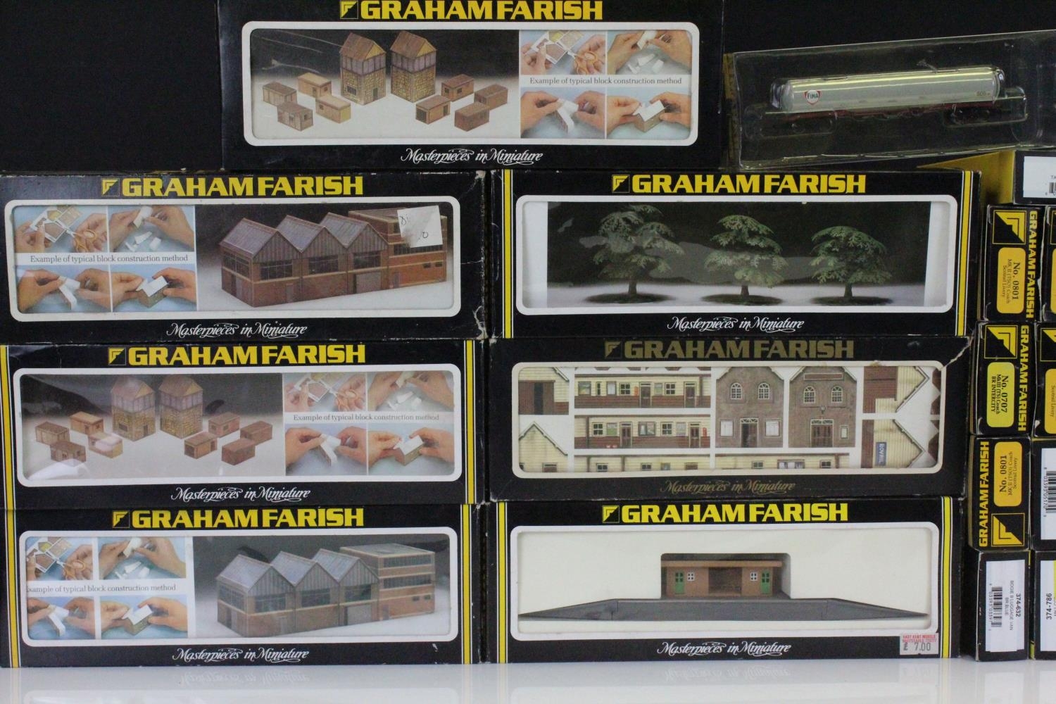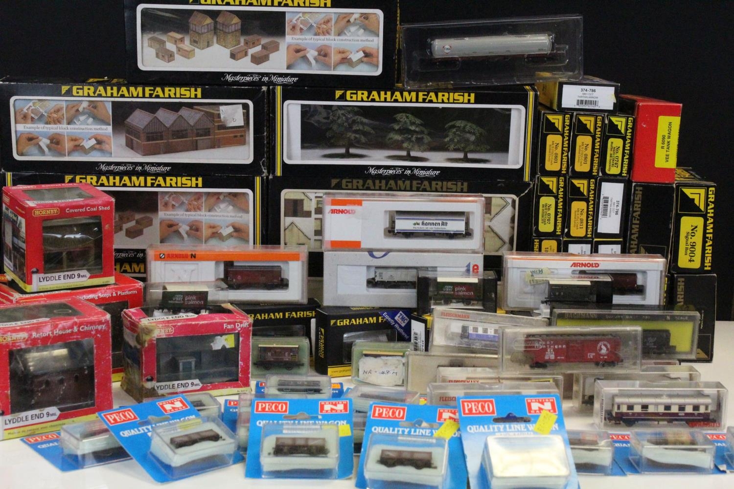 54 Boxed / cased N gauge items of rolling stock to include 22 x Graham Farish, 4 x Arnold, 8 x Fleischmann, 18 x Peco & 1 x Bachmann plus boxed 15 x trackside buildings featuring 11 x Graham Farish & 4 x Hornby, the Hornby items have tatty boxes (69 items)