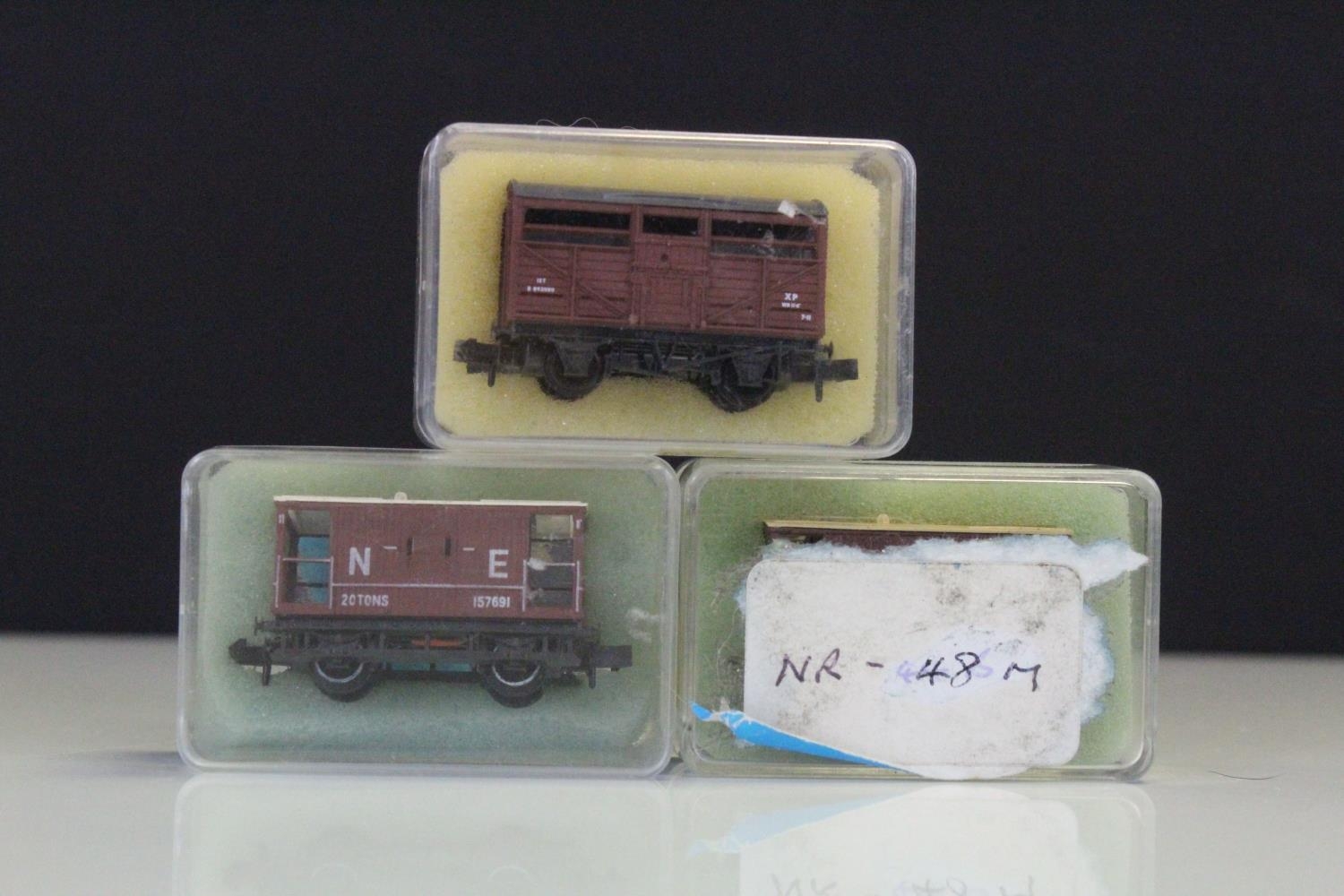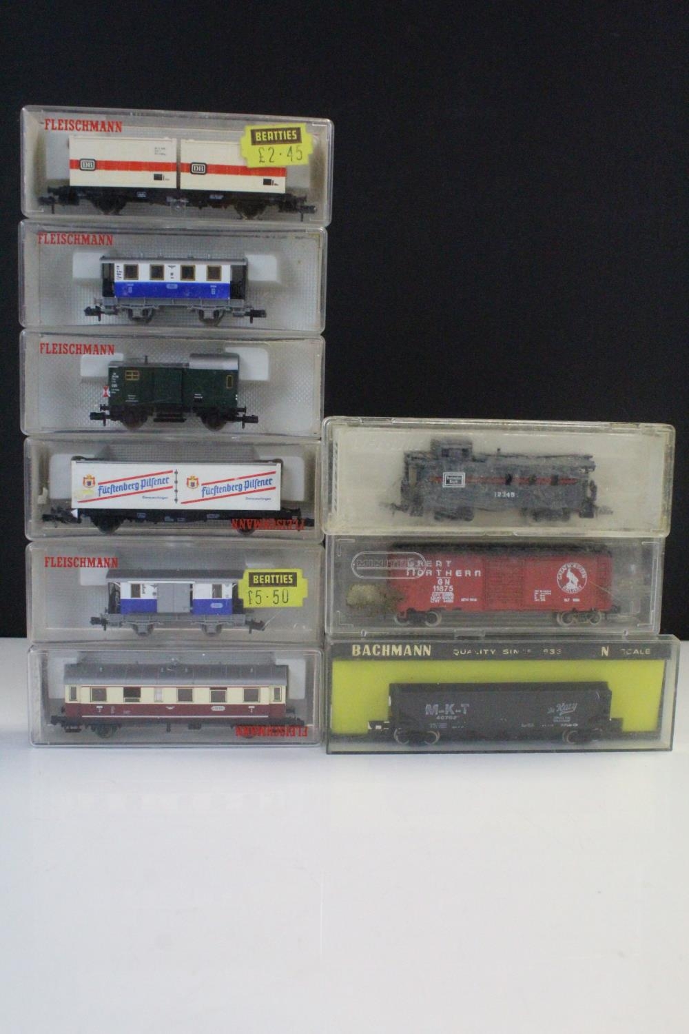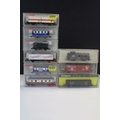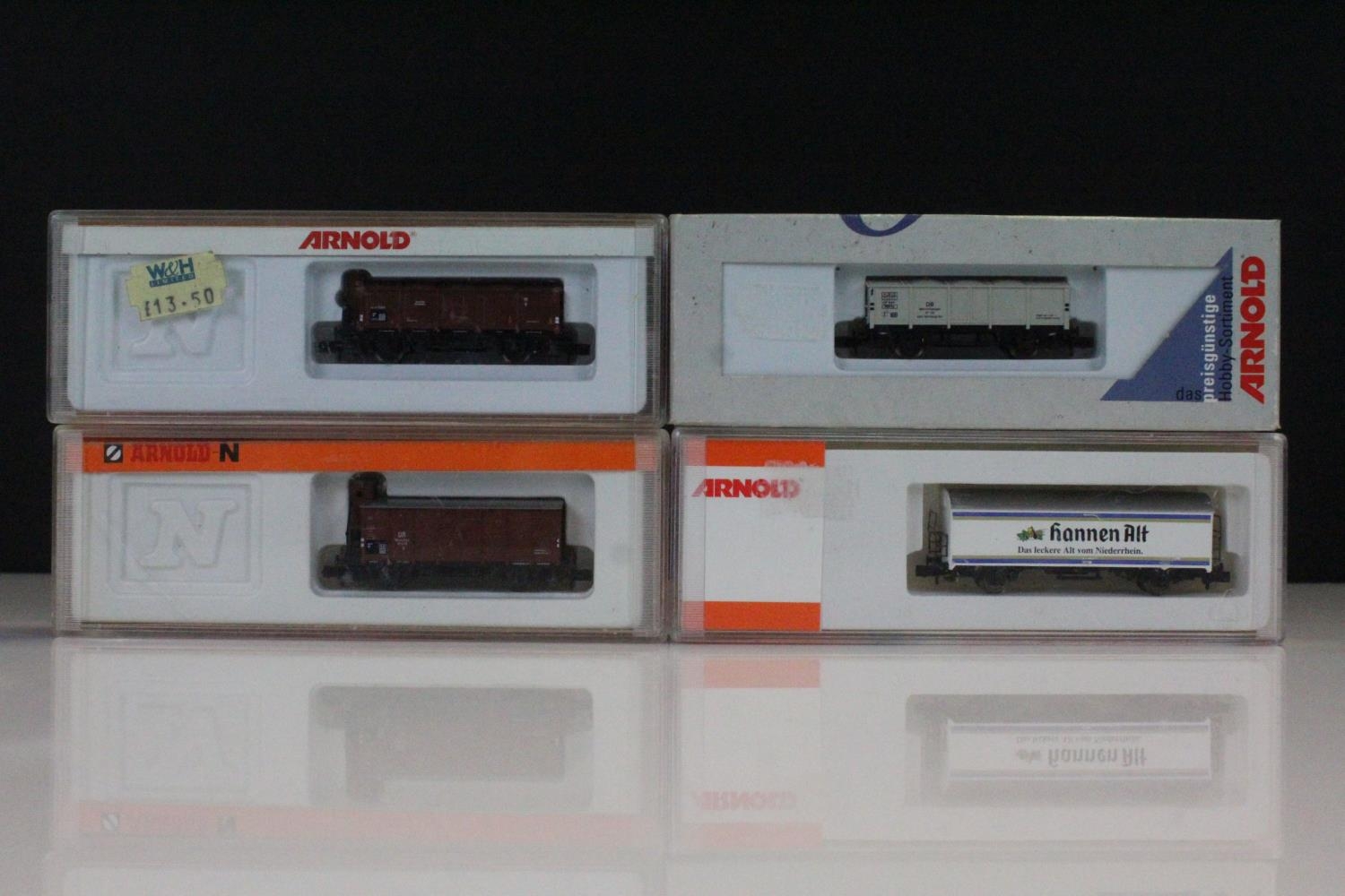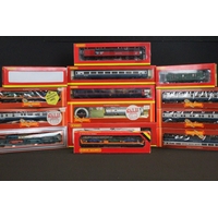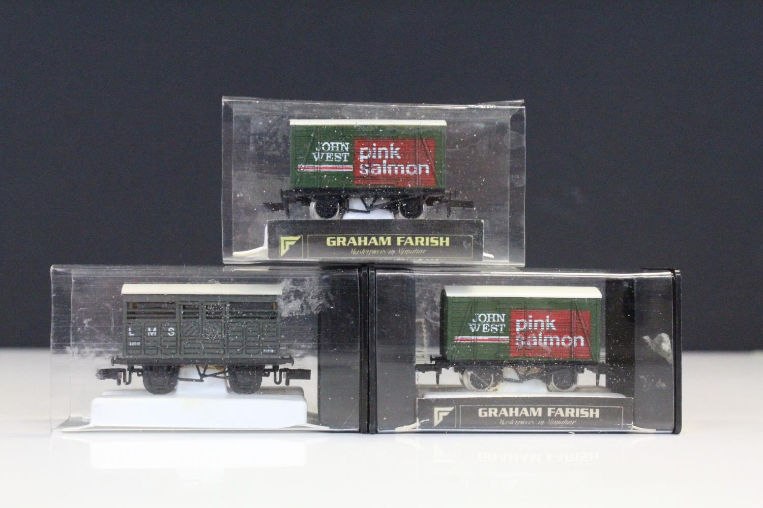 54 Boxed / cased N gauge items of rolling stock to include 22 x Graham Farish, 4 x Arnold, 8 x Fleischmann, 18 x Peco & 1 x Bachmann plus boxed 15 x trackside buildings featuring 11 x Graham Farish & 4 x Hornby, the Hornby items have tatty boxes (69 items)