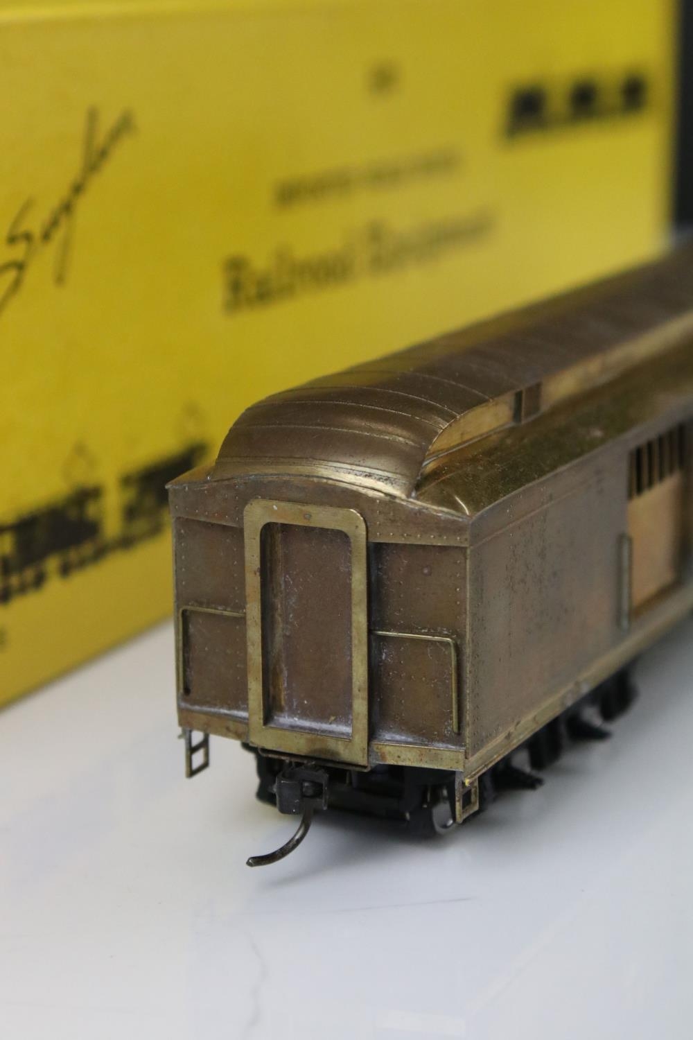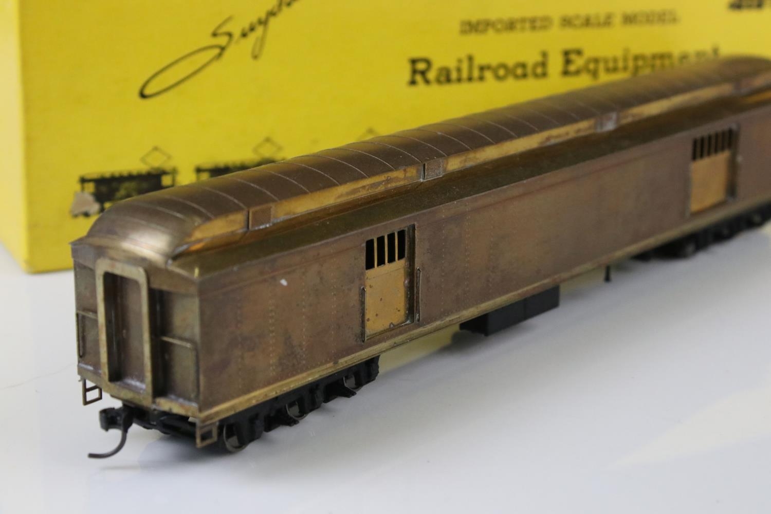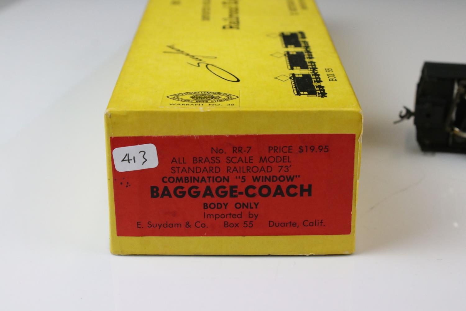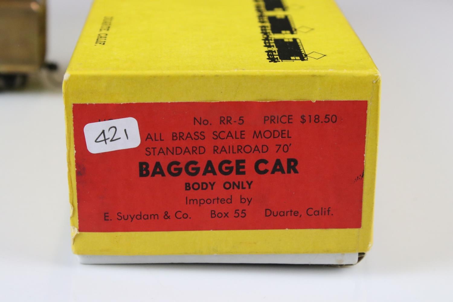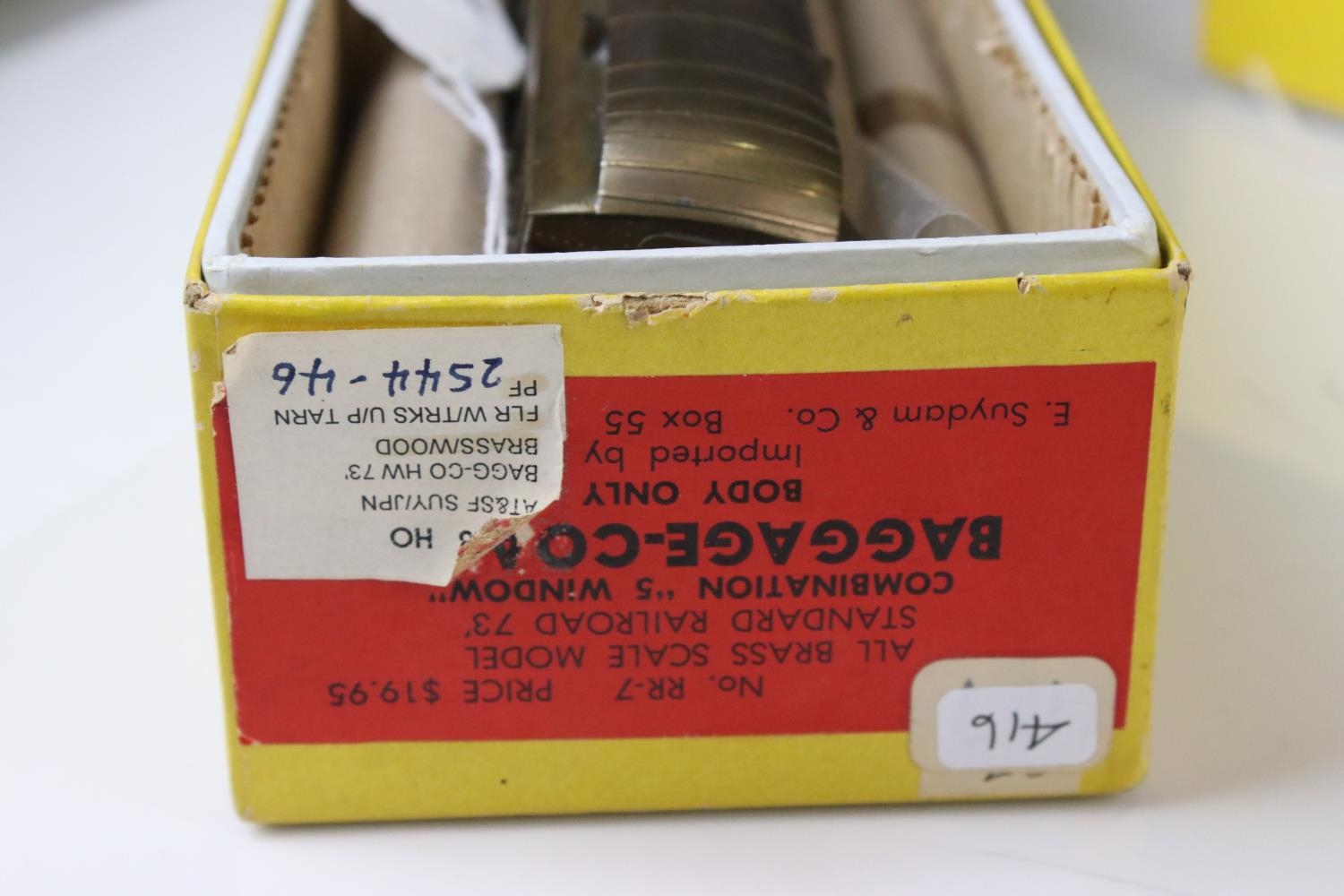 Three boxed E Suydam & Co HO Railroad Equipment Baggage Car brass models to include 2 x RR-7 (one painted) and 1 x RR-5, appearing good, boxes gd
