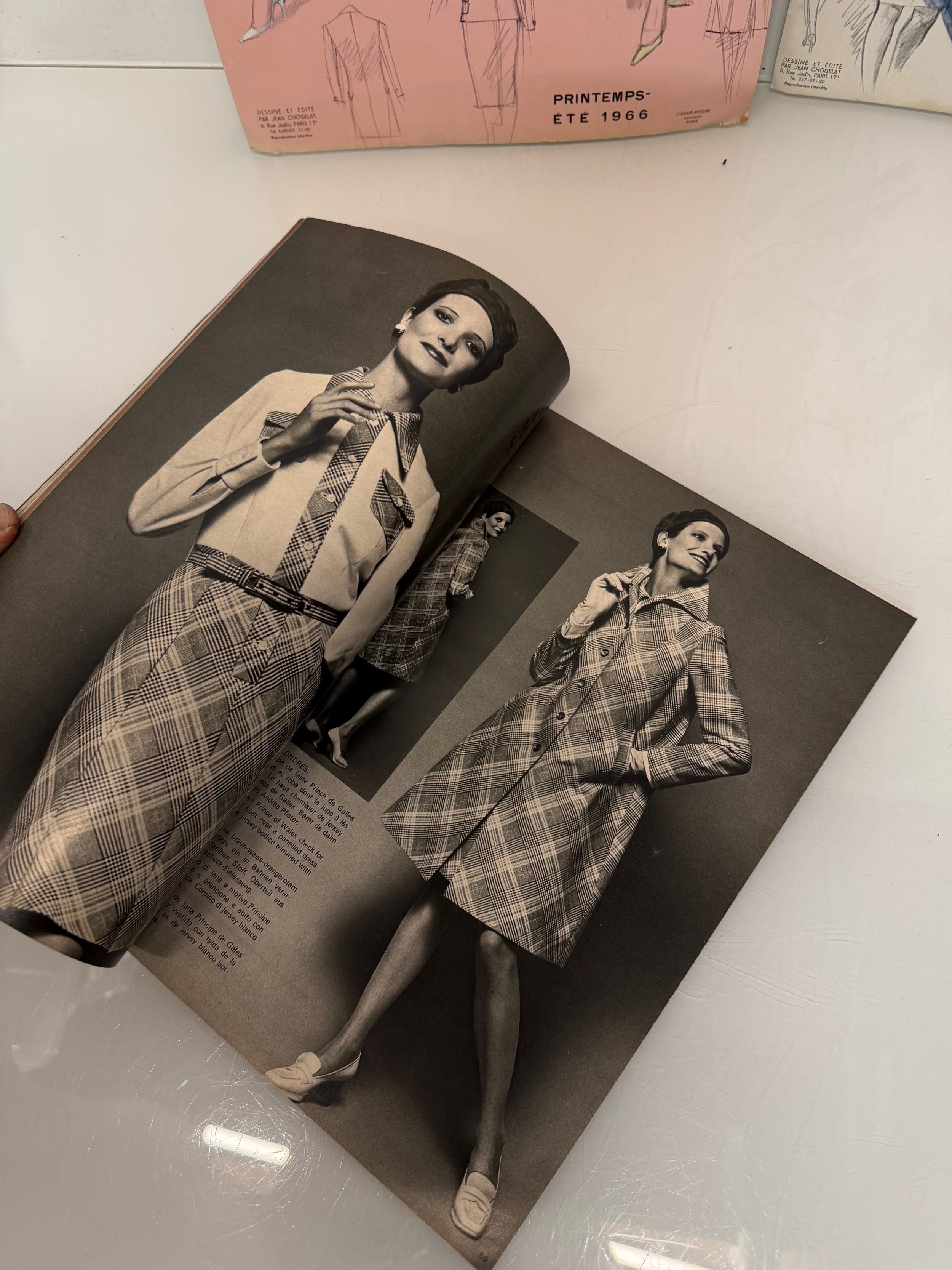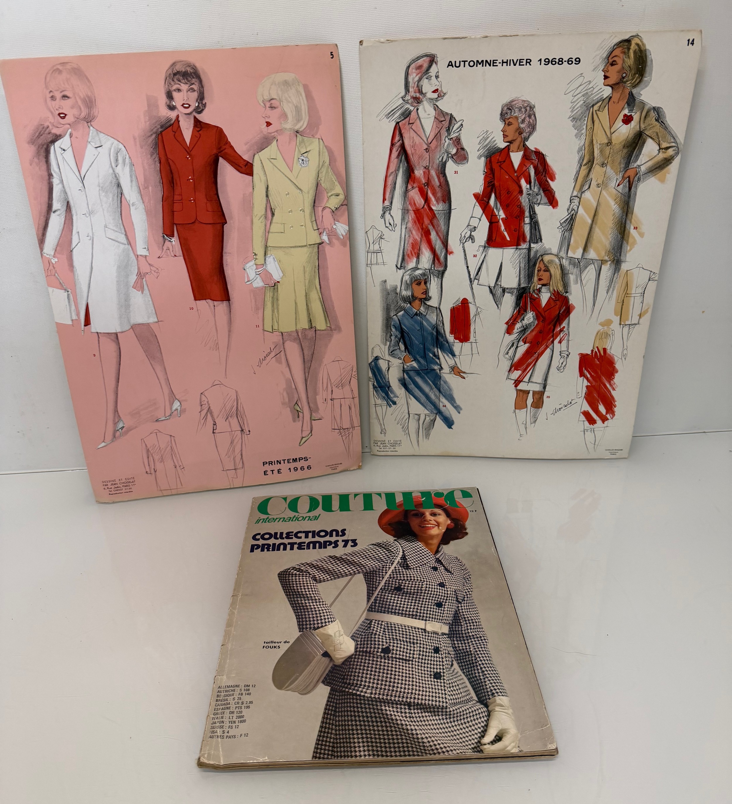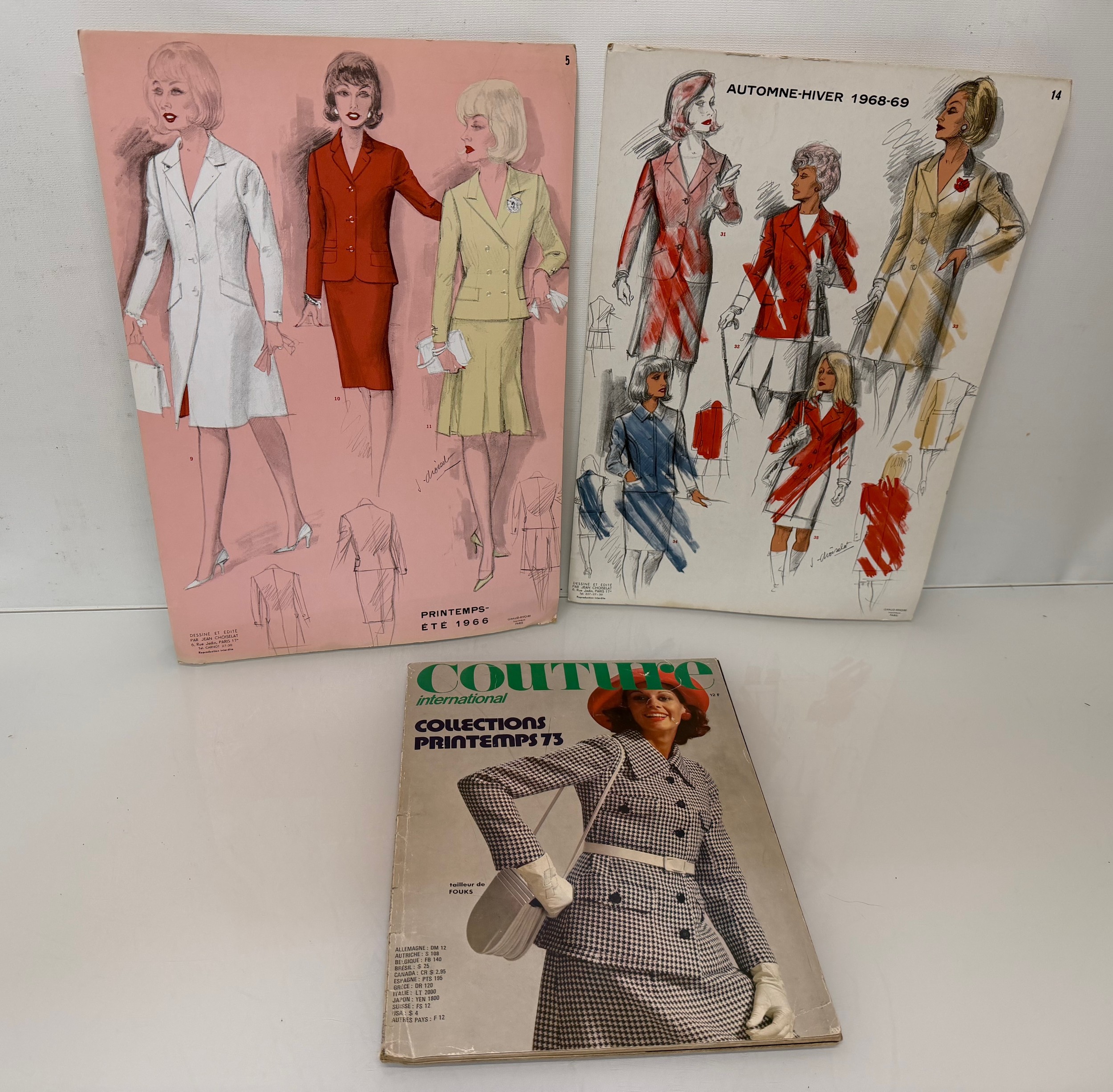 Vintage Fashions, a manufactuers posters on board for 1960 ladies clothing, with a 1973 brochure.