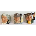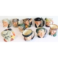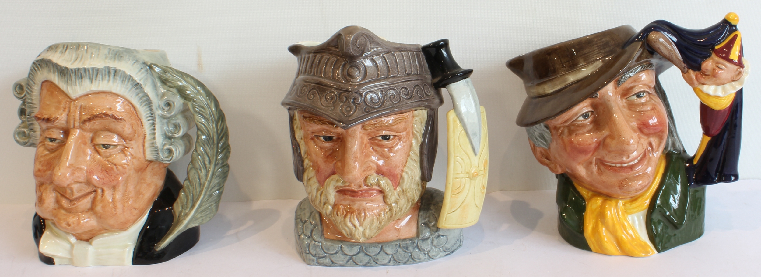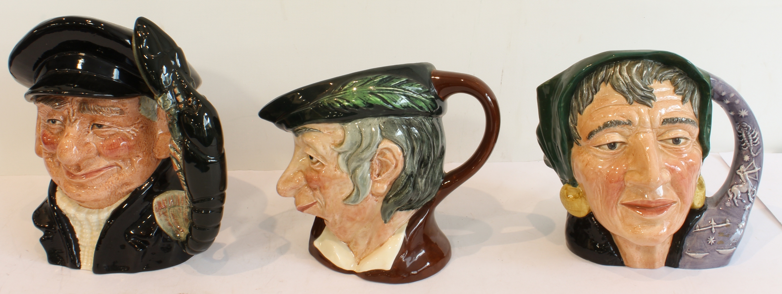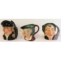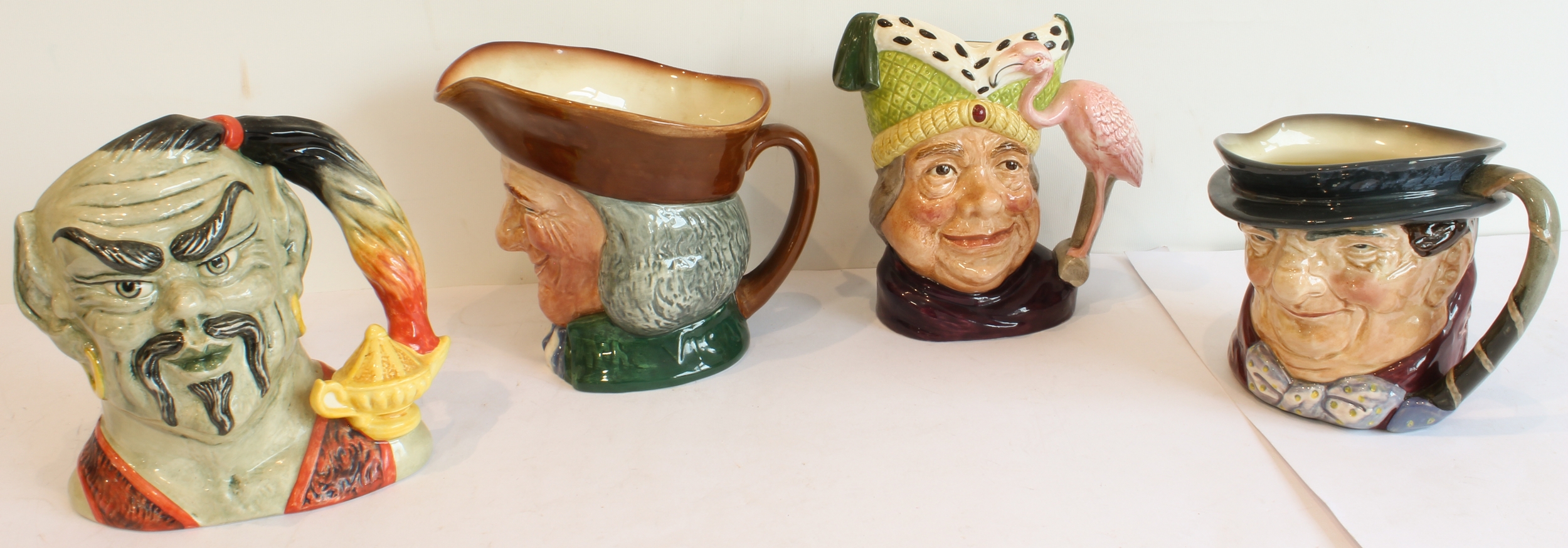 The Ugly Duchess has restoration to conceal a crack on the base, with peeling varnish over the repainting. The Fortune Teller has a tiny glaze frit to the front edge of the hood. The Genie has a large piece off the base, which even when put back in place leaves a hole. The Vicar of Bray has a drip of clear glue or varnish inside the rim – this appears to be an accident from home decorating! The other jugs are all in VG condition