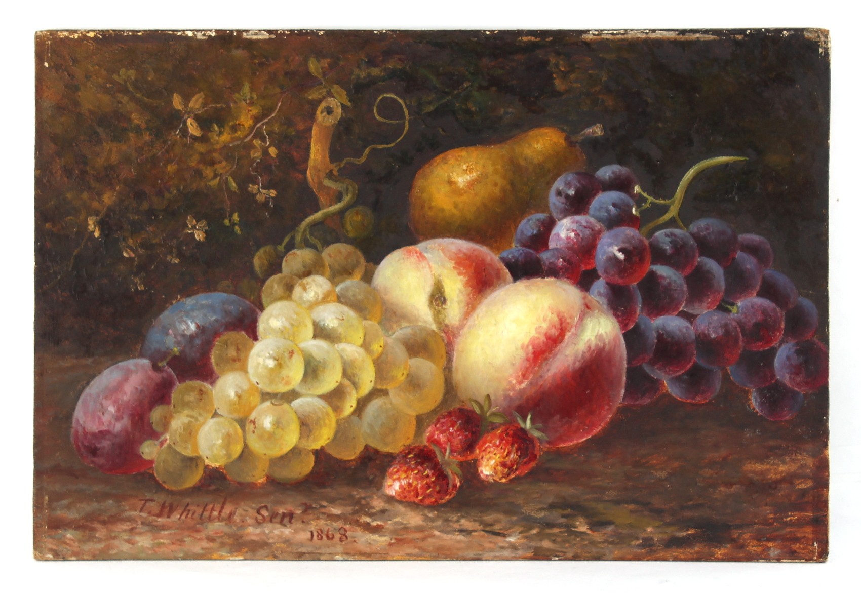 Property of a deceased estate - Thomas Whittle Senior (act.1854-1879) - 'ENGLISH FRUIT', A STILL LIFE - oil on board, 8 by 12ins. (20.3 by 30.5cms.), unframed - signed lower left & dated 1868 (with manuscript presentation label from the artist verso).