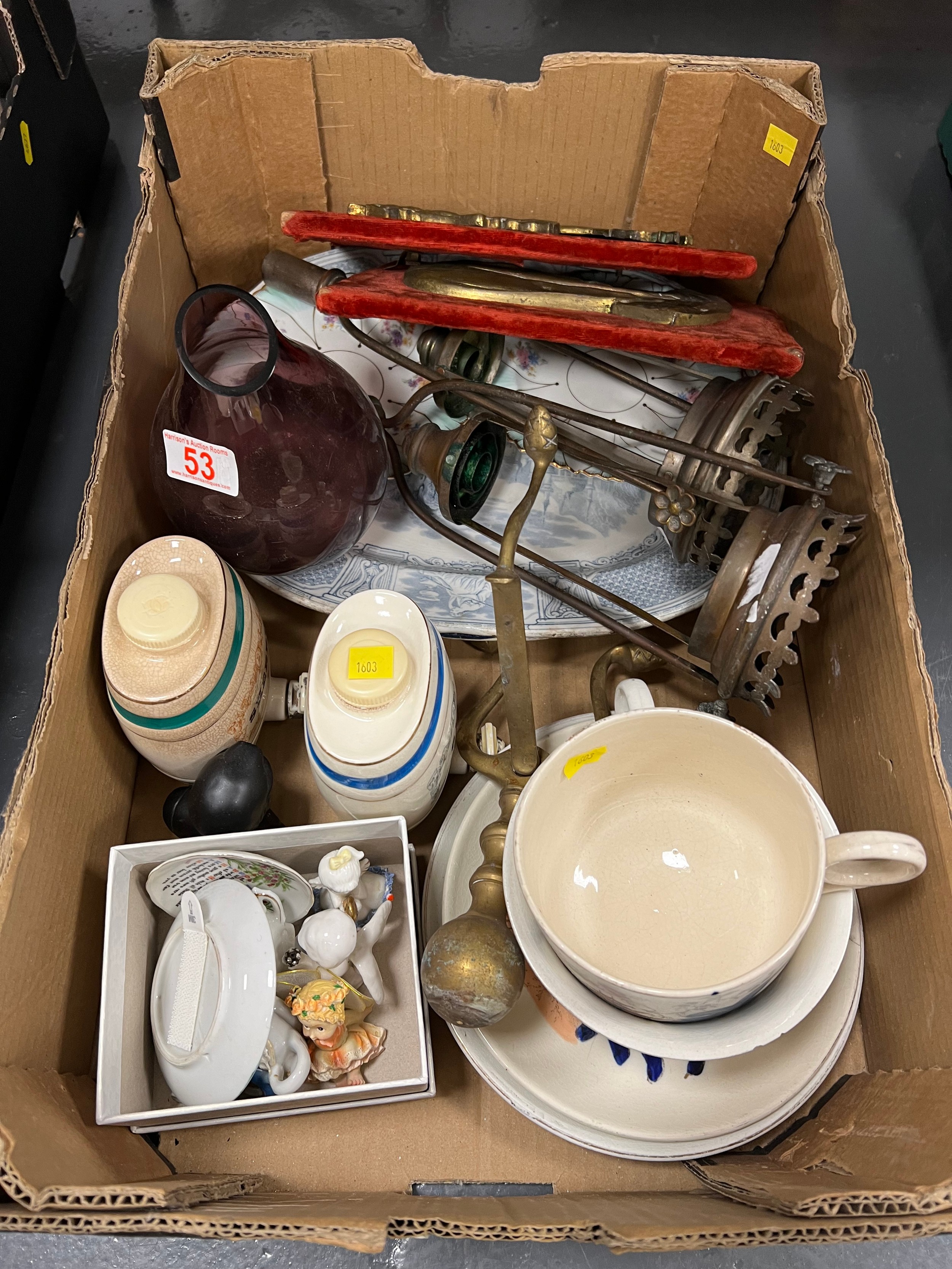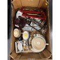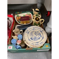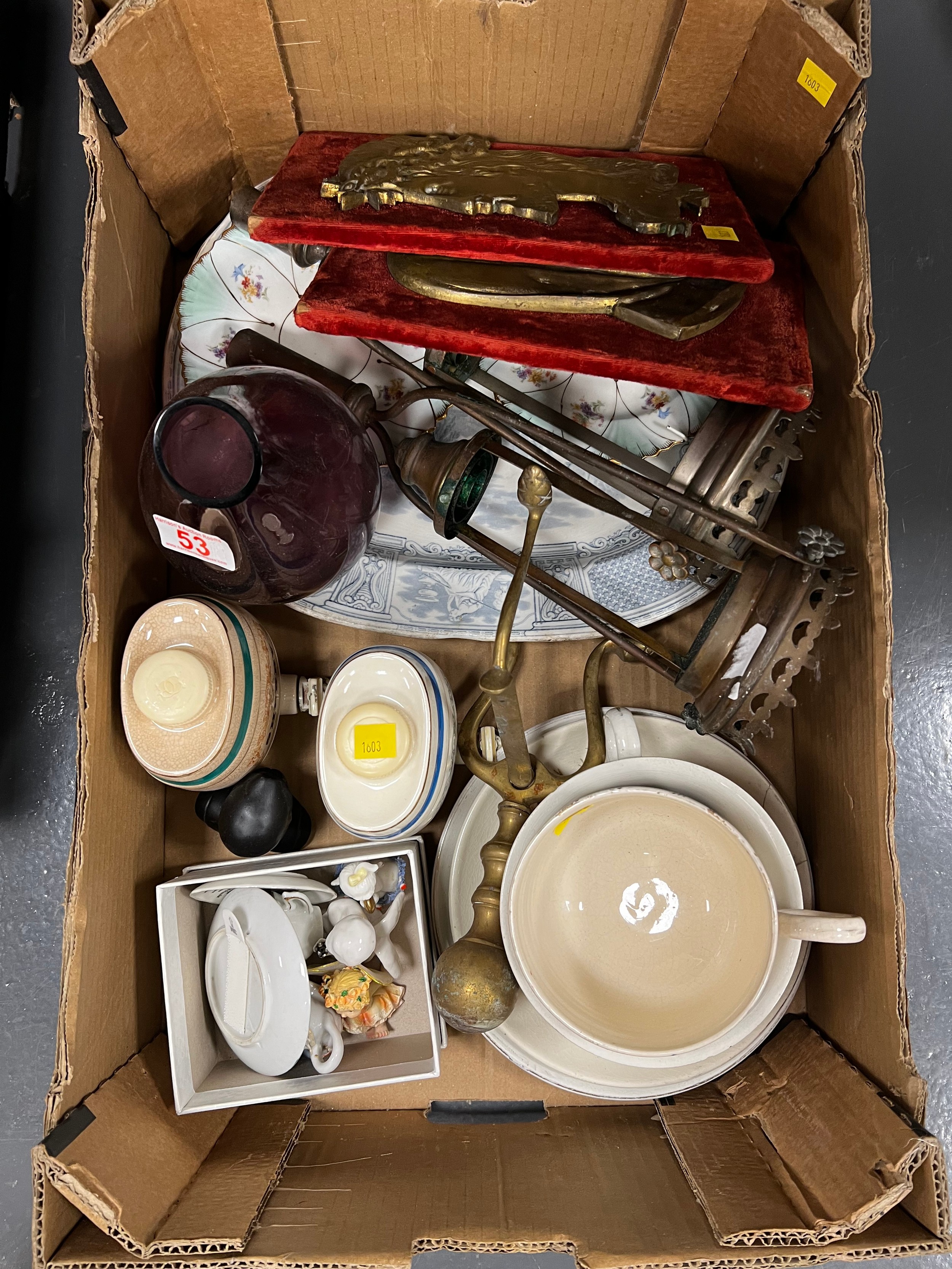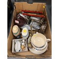 1 Box pottery wade, brass plaques etc