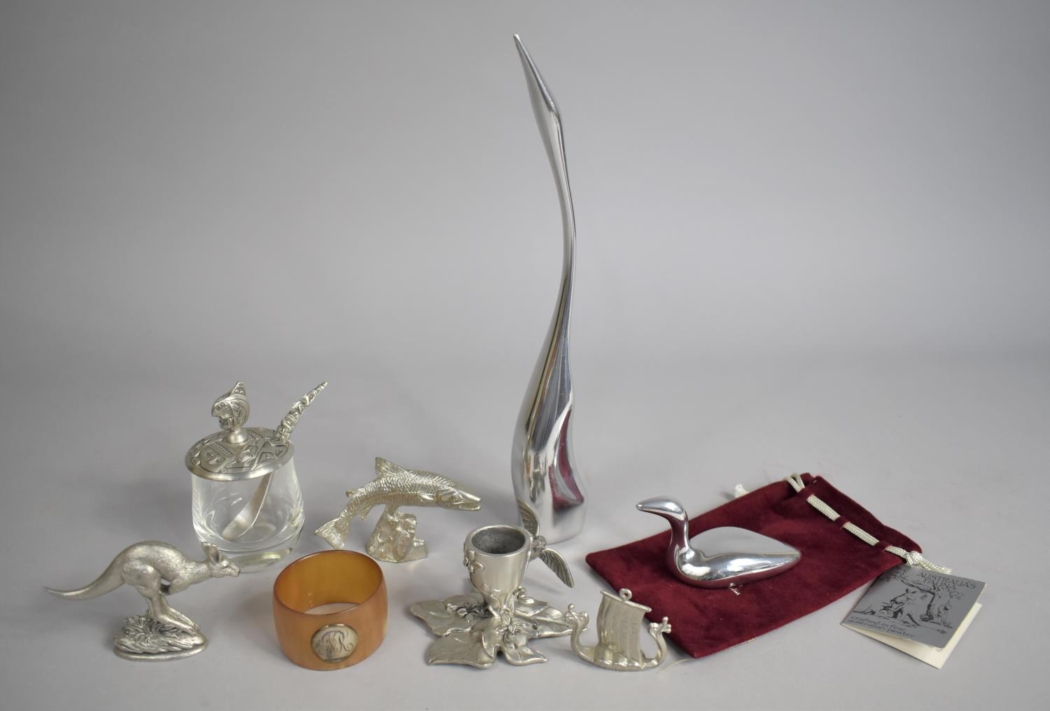 A Collection of Various Pewter Items to include Humming Bird Candlesticks, Kangaroo, Salmon Etc