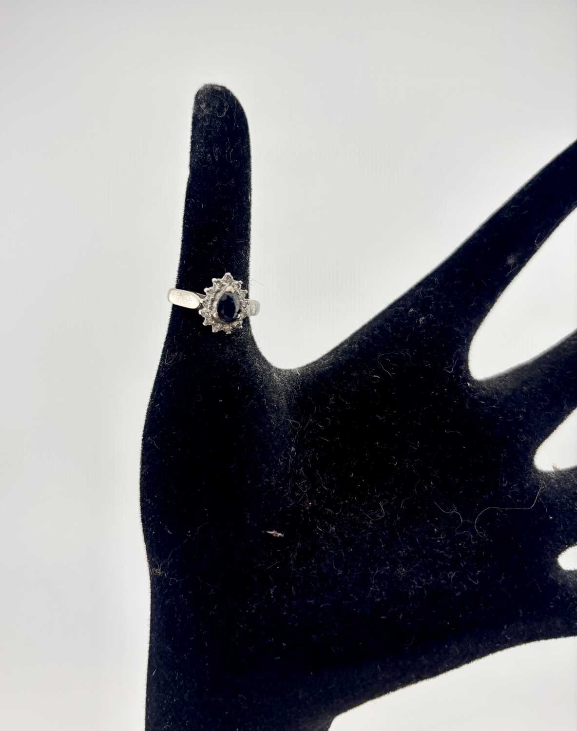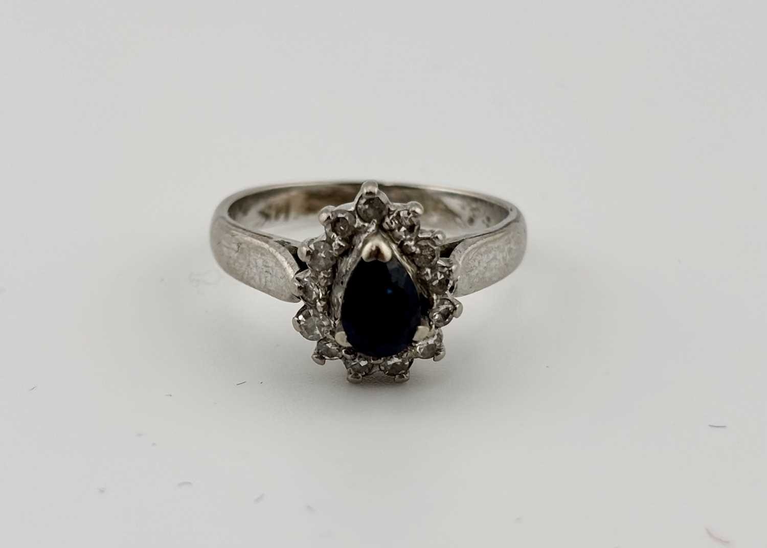 A pear-shape sapphire and single-cut diamond cluster ring, estimated total diamond weight 0.25ct, stamped 14K, ring size K1/2, 3.3g.