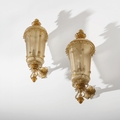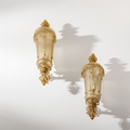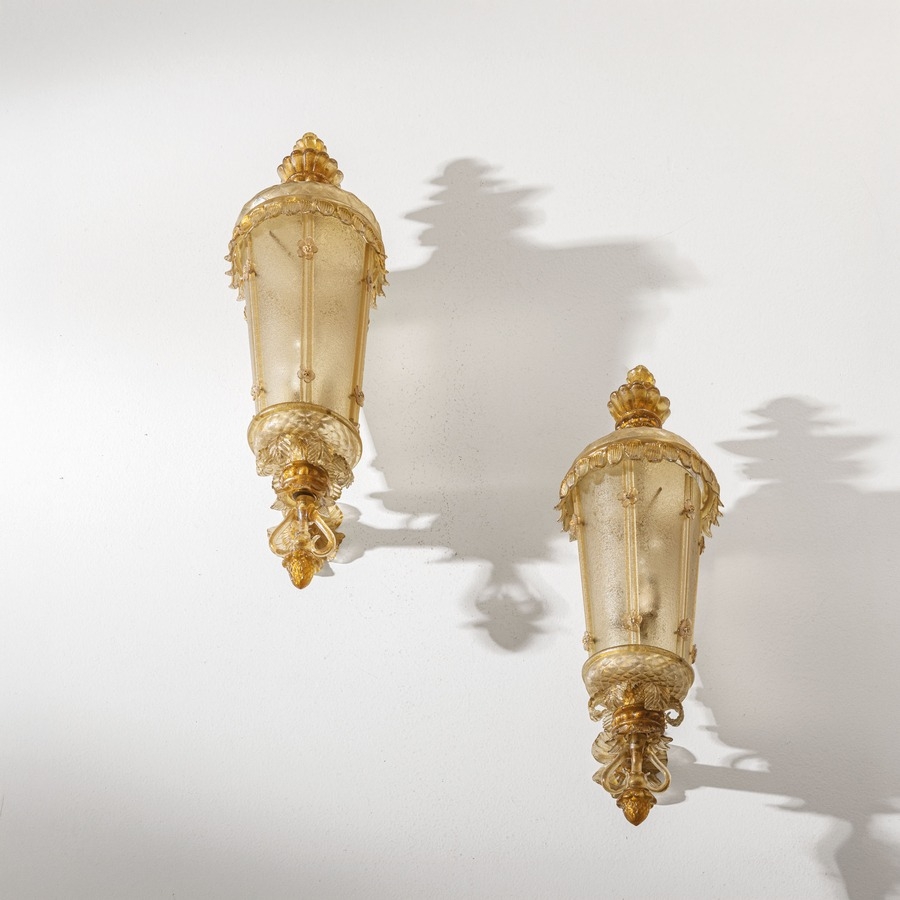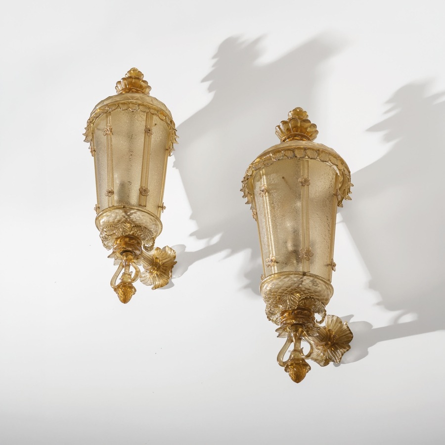 Coppia di lampade da parete. Ottone, vetro lavorato a caldo. Produzione Seguso Vetri d'Arte anni '30.