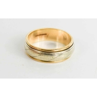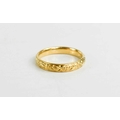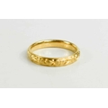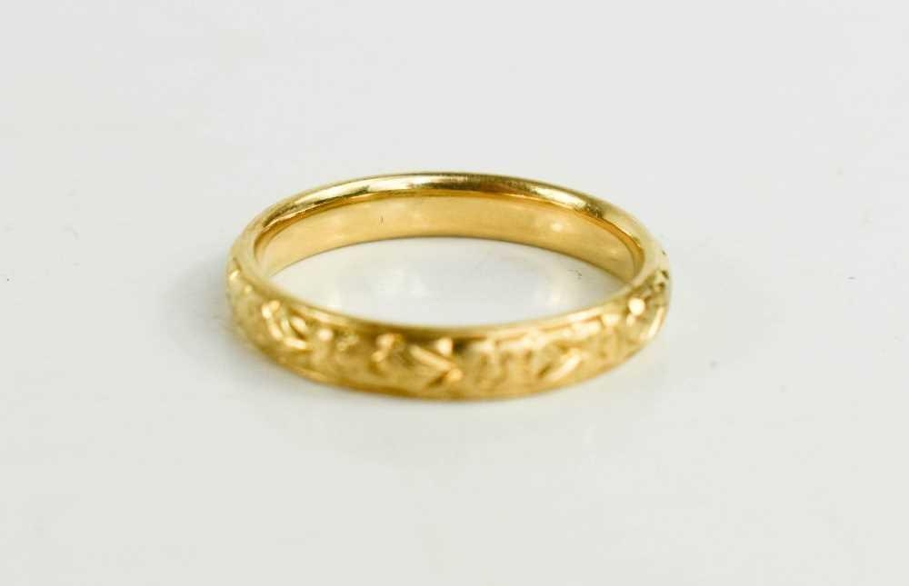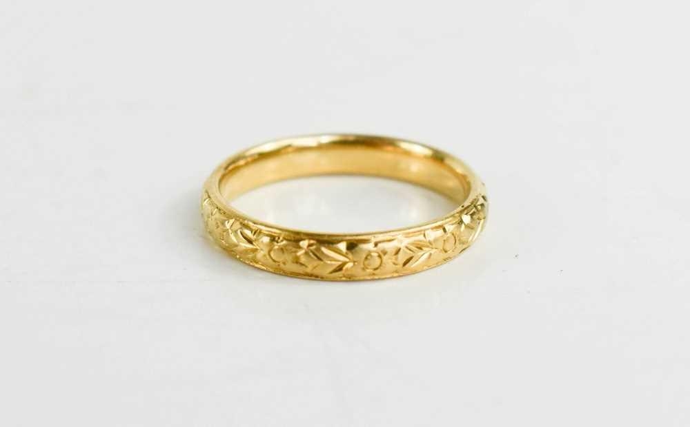 An 18ct gold wedding band, foliate engraved, size K, 3.1g.