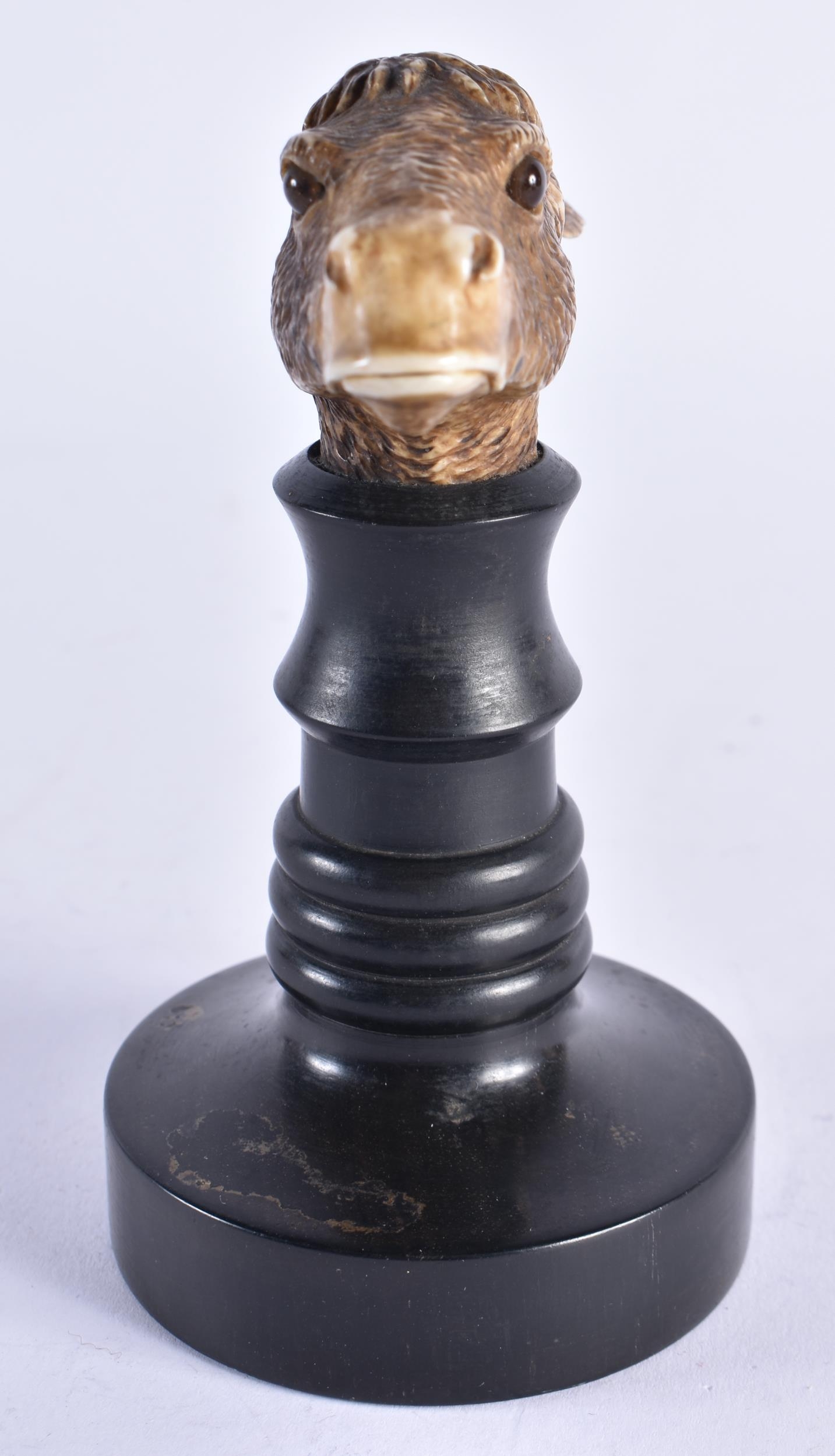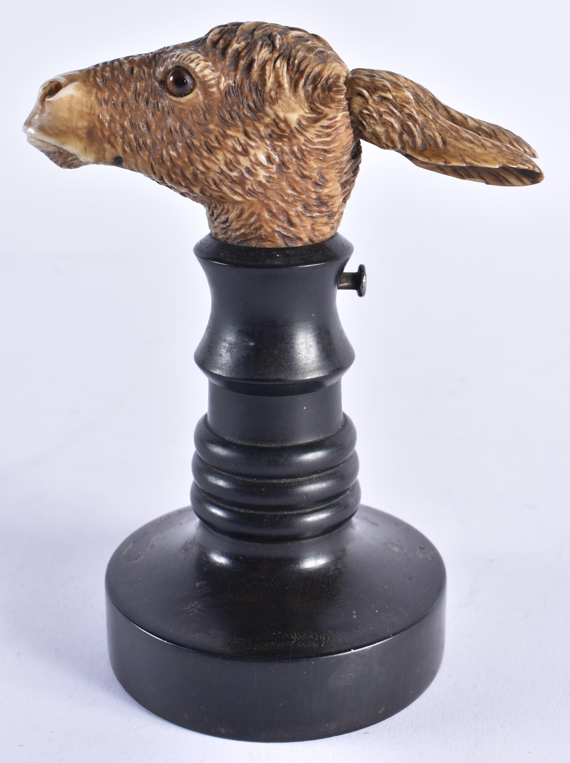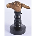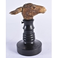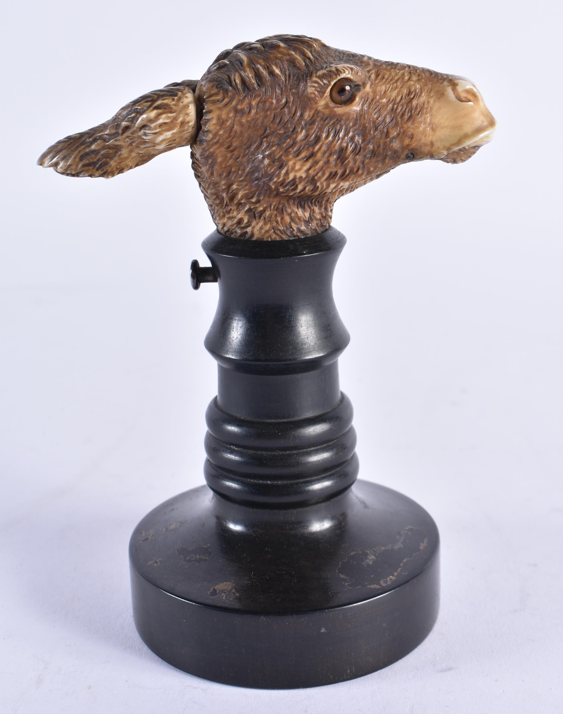 A VERY RARE 19TH CENTURY EUROPEAN CARVED ARTICULATED DONKEY HEAD formed upon an ebonised base, naturalistically modelled, the button pressing to open the mouth and rotate the ears. 14 cm x 9 cm.