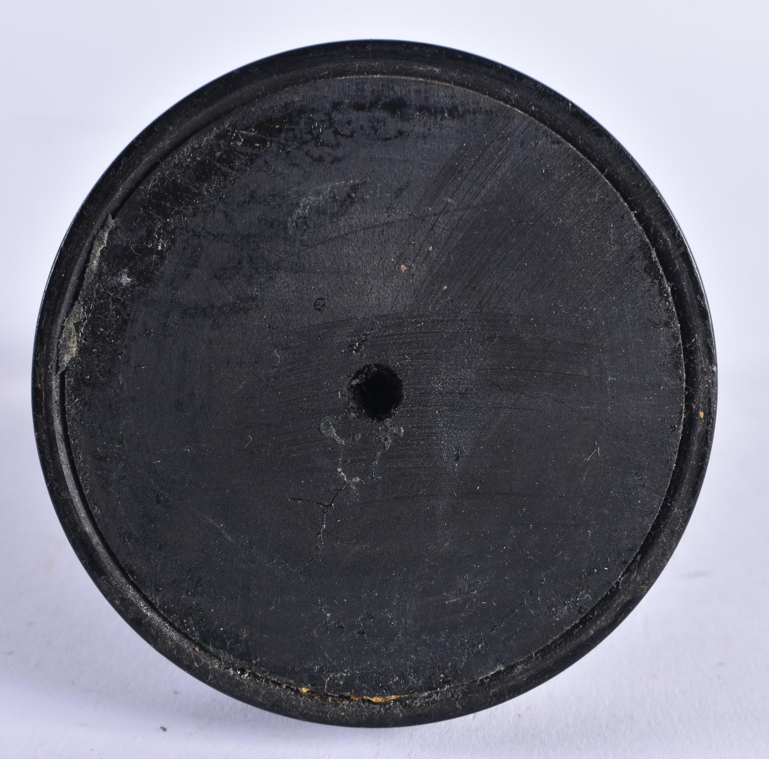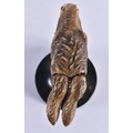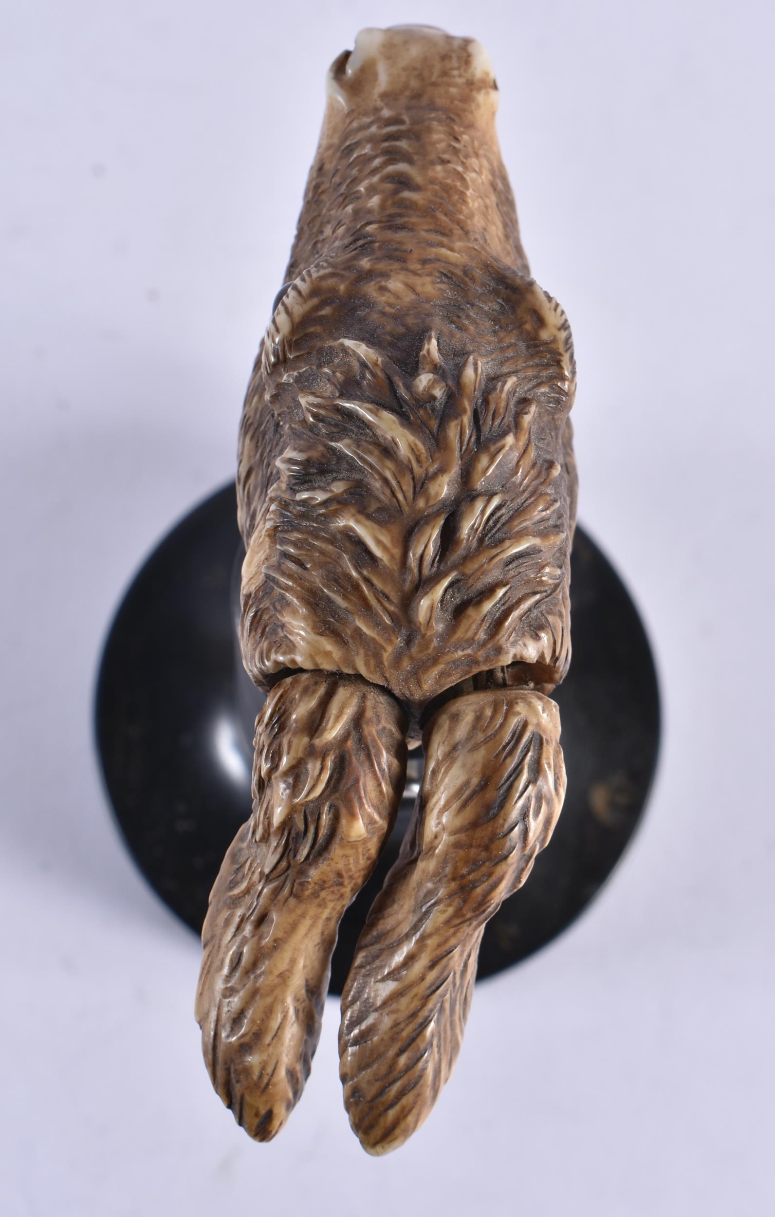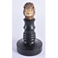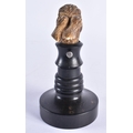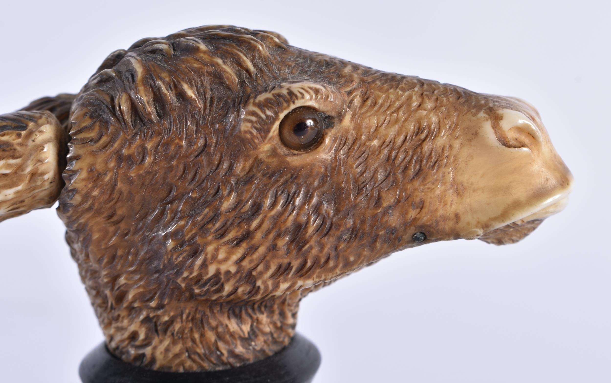 A VERY RARE 19TH CENTURY EUROPEAN CARVED ARTICULATED DONKEY HEAD formed upon an ebonised base, naturalistically modelled, the button pressing to open the mouth and rotate the ears. 14 cm x 9 cm.