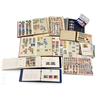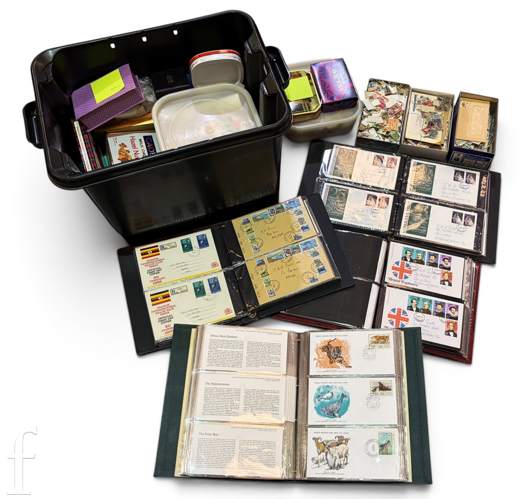 A green album containing the Collection of World Wildlife First Day Covers, one hundred and forty four in total with cancellation date stamps ranging from 1976 to 1979, together with three other albums of First Day Covers, loose stamps in tins and boxes and a small quantity of trade cards. (qty)