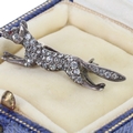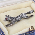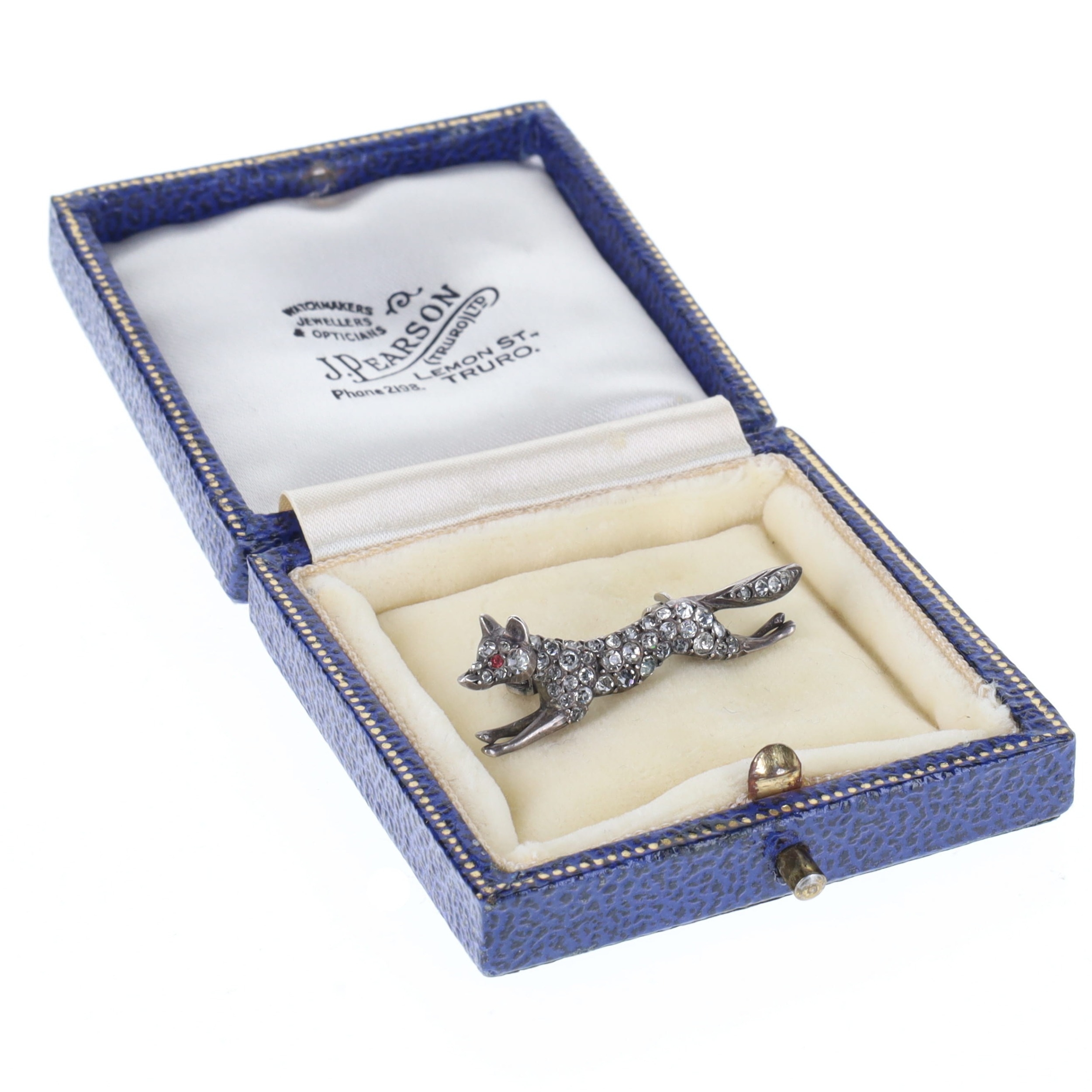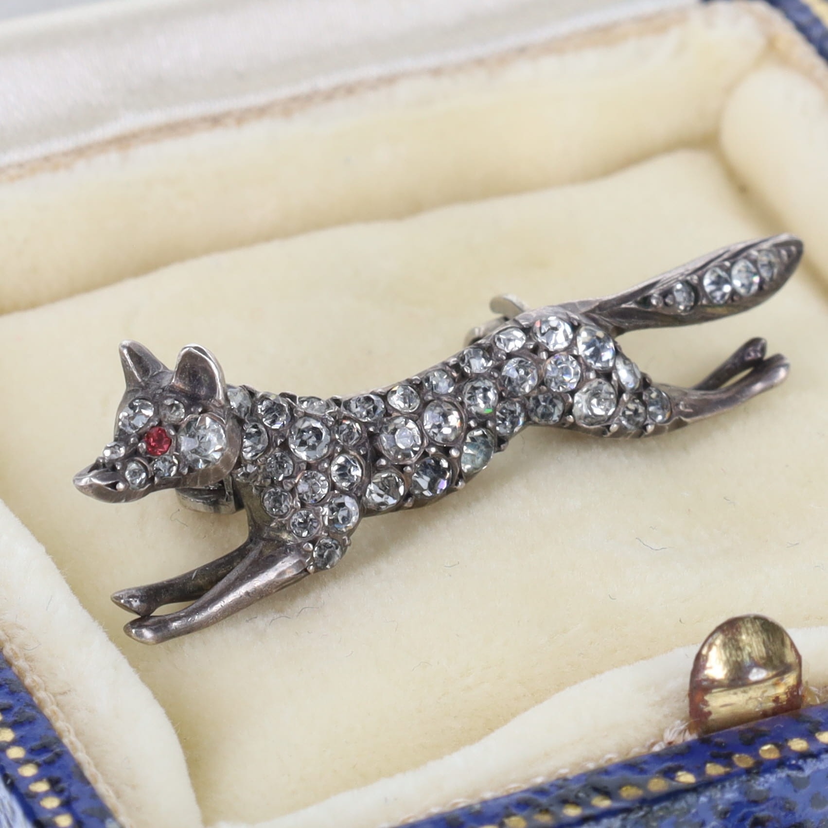 Antique Paste Silver Fox Brooch. Tested as 900 silver. All stones intact with minor stone discolouration, clasp is in working order. Comes with non-original antique box. Measures approx. 3.8cm. Weighs in total 4.9g.