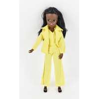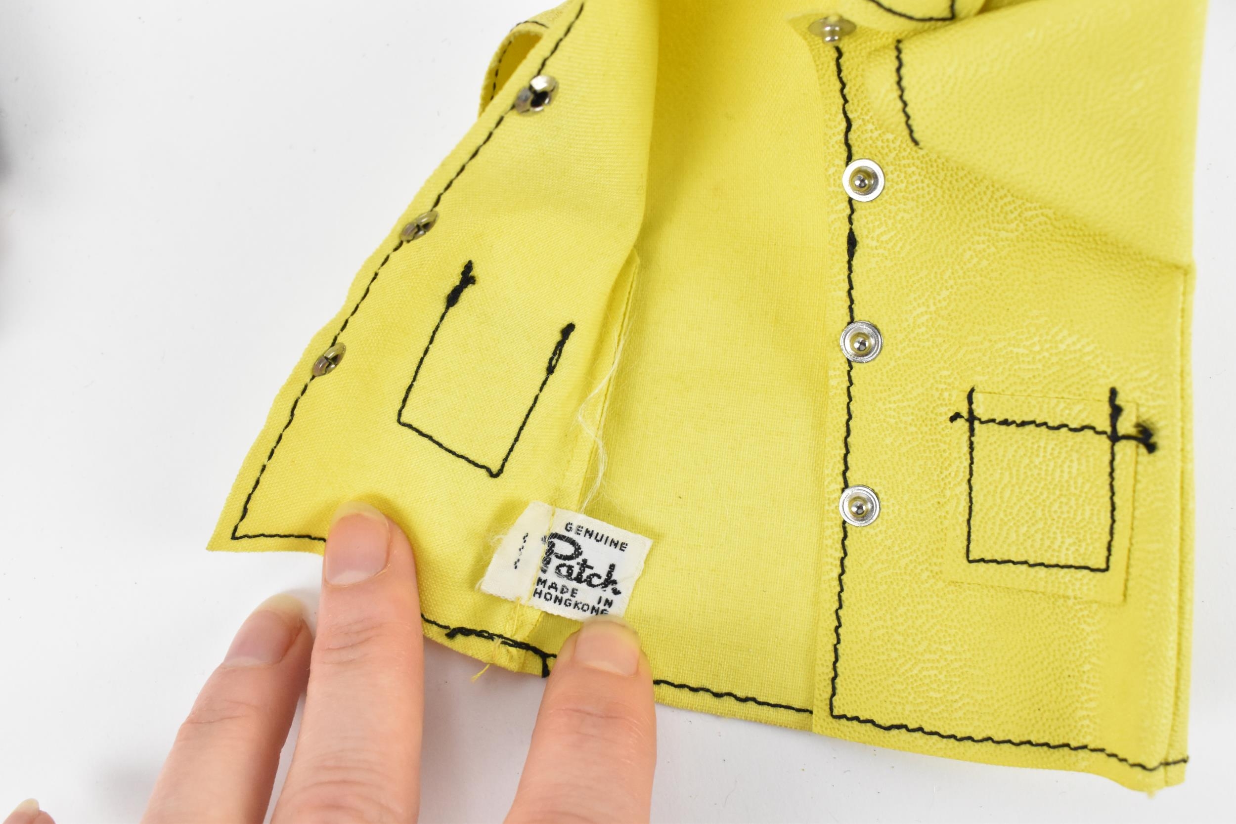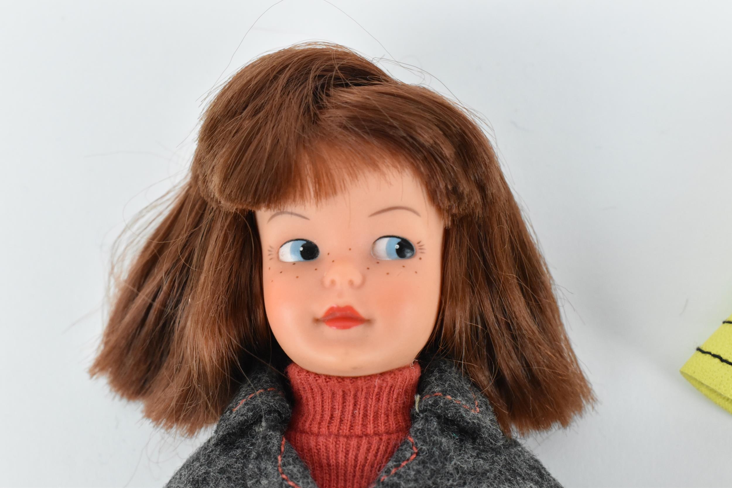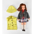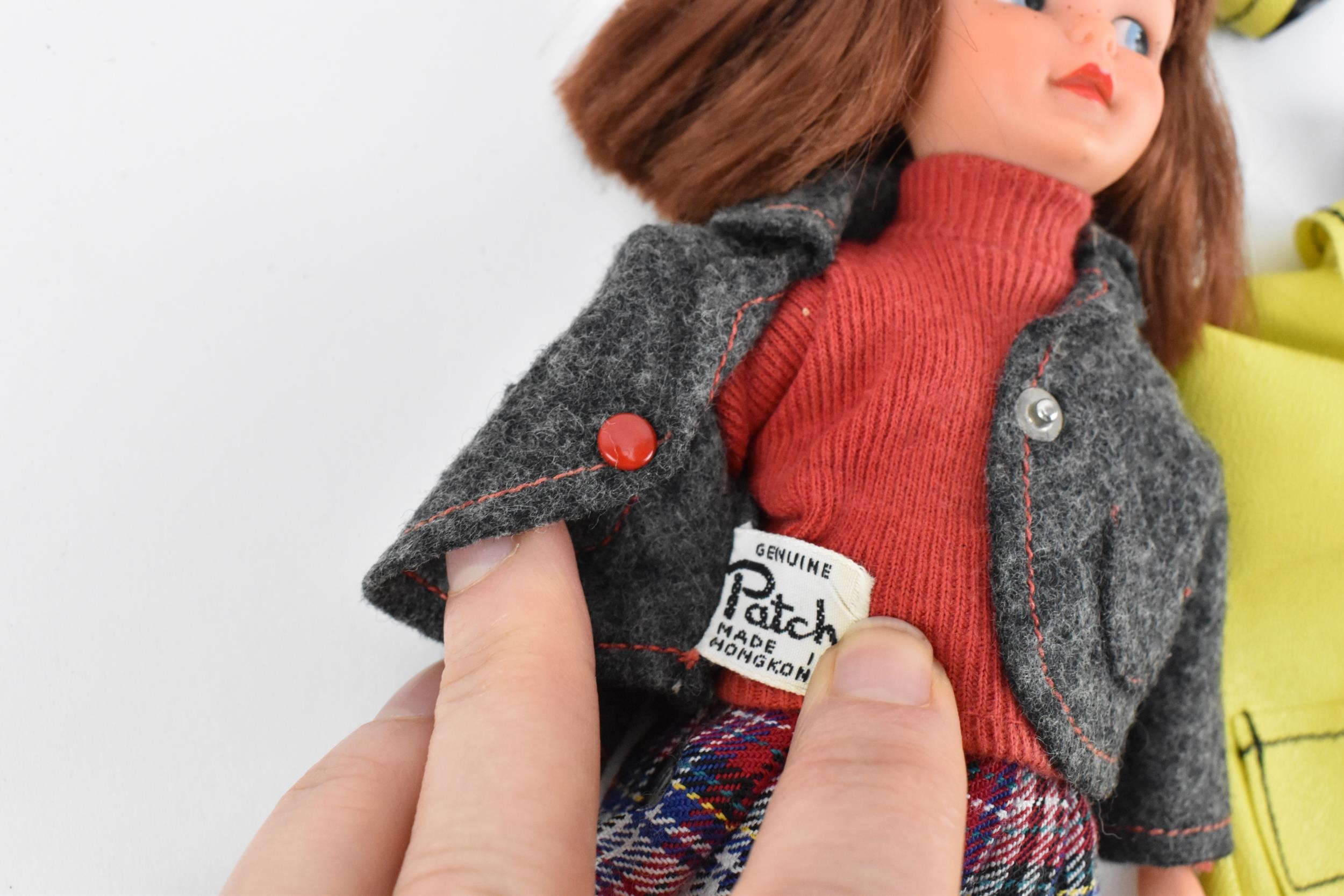 A Pedigree Sindy early Patch brunette doll with painted eyebrows, eyes and lips, with freckles, wearing genuine 'Patch' clothes 'school uniform' outfit, together with an additional Patch outfit with raincoat and rainhat