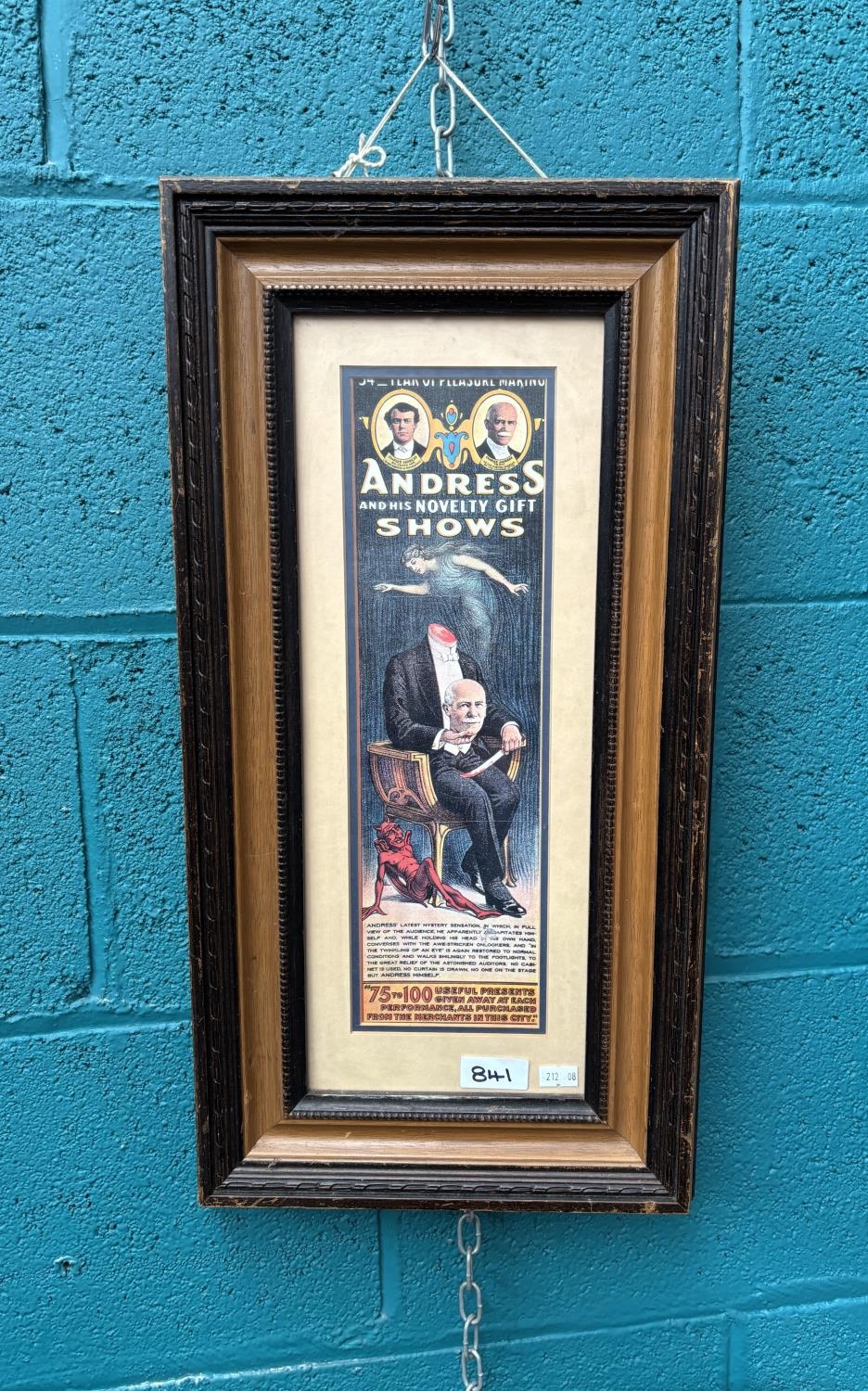 Framed and glazed repro 'Andress And His Novelty Gift Shows' advertisement