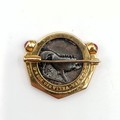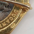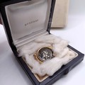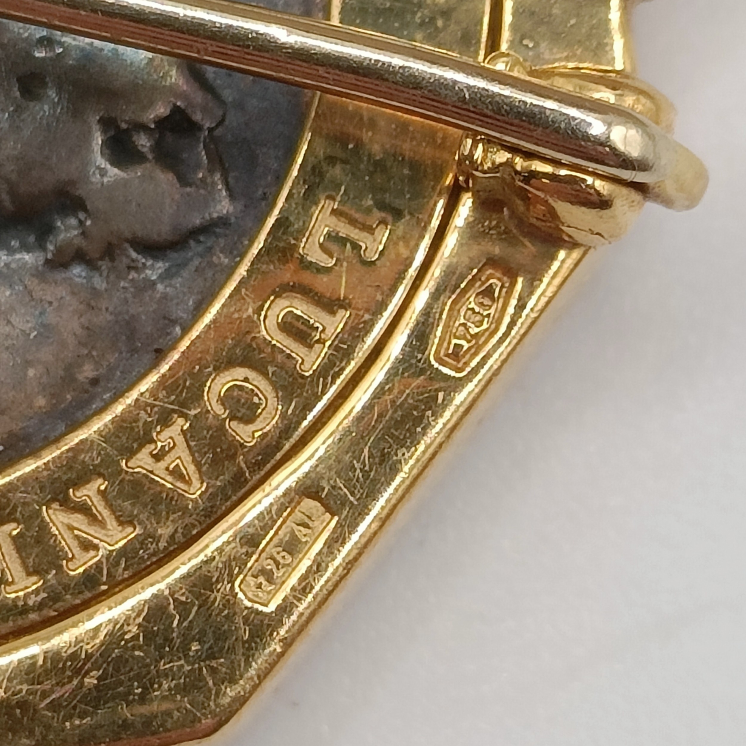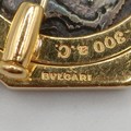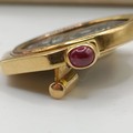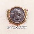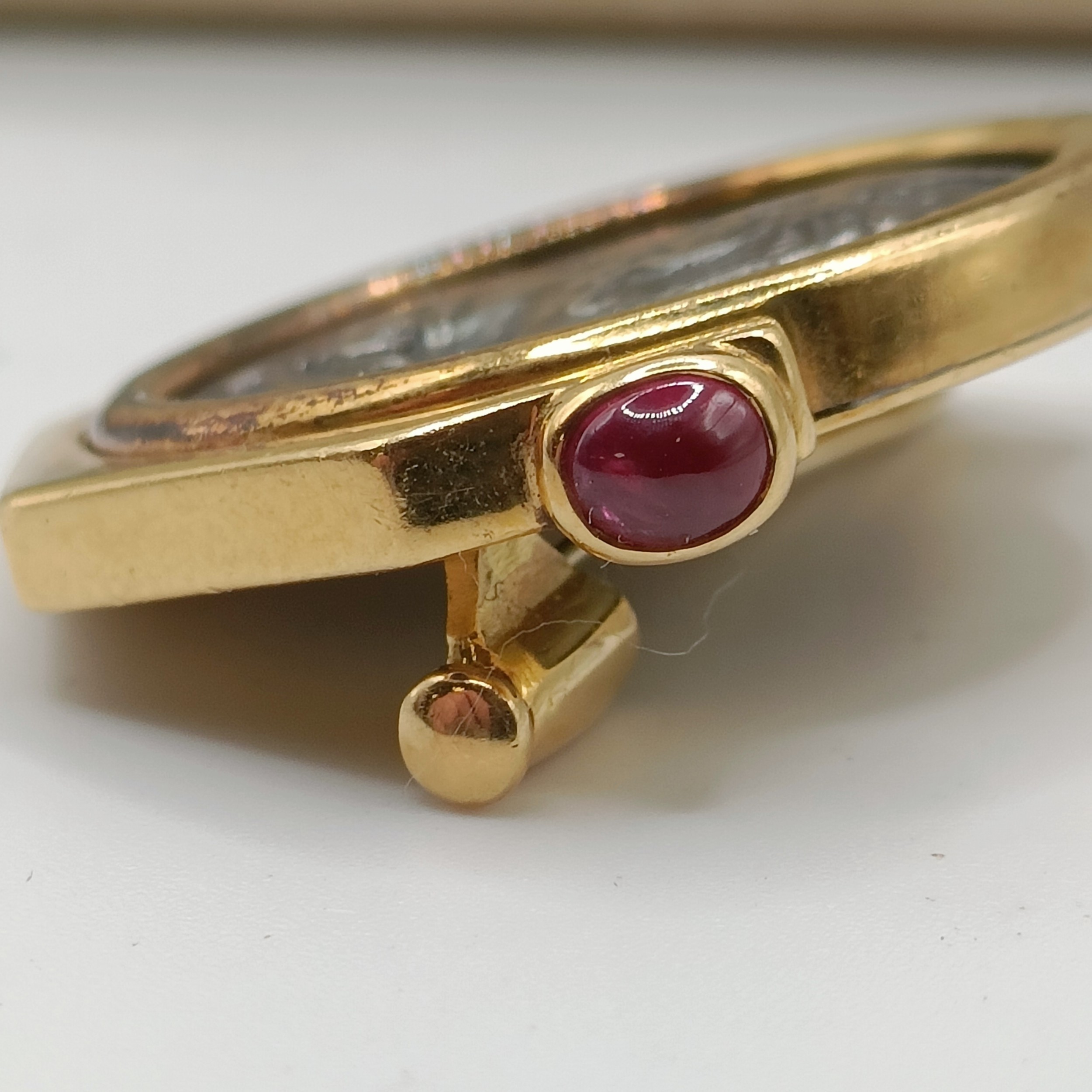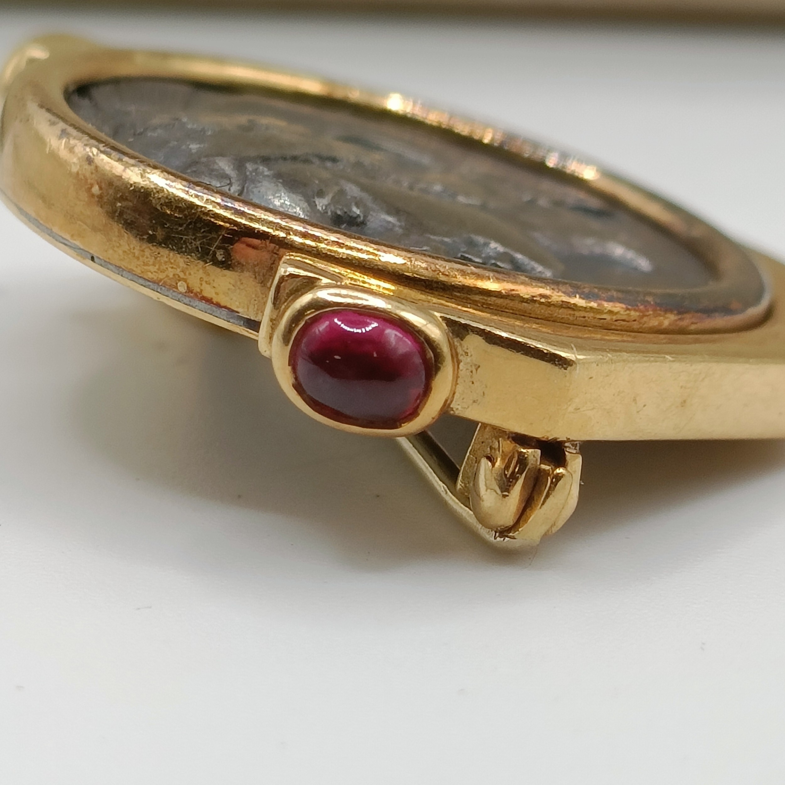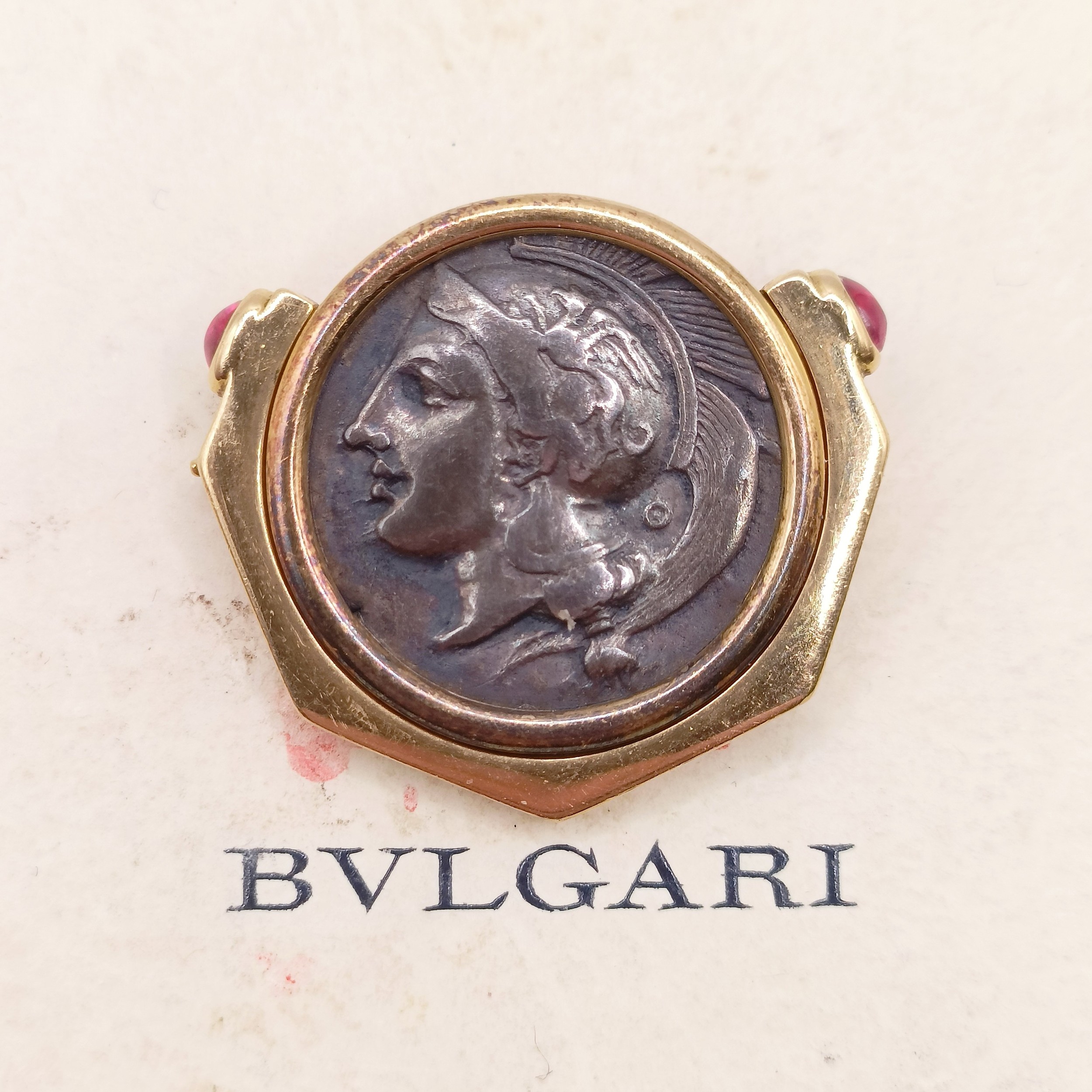 A Bulgari 'Monete' brooch, set a Greek Lucania-Velia (330-300) silver coin, one side with Athena and the other side a lion, in an 18ct gold mount, set with cabochon rubies, 2.5 cm wide, in a Bulgari leather box and a Bulgari cardboard outer box