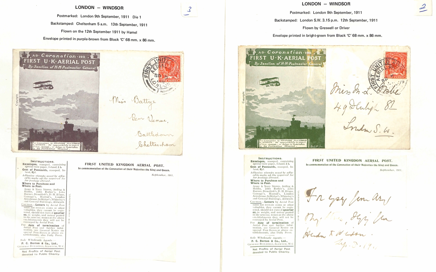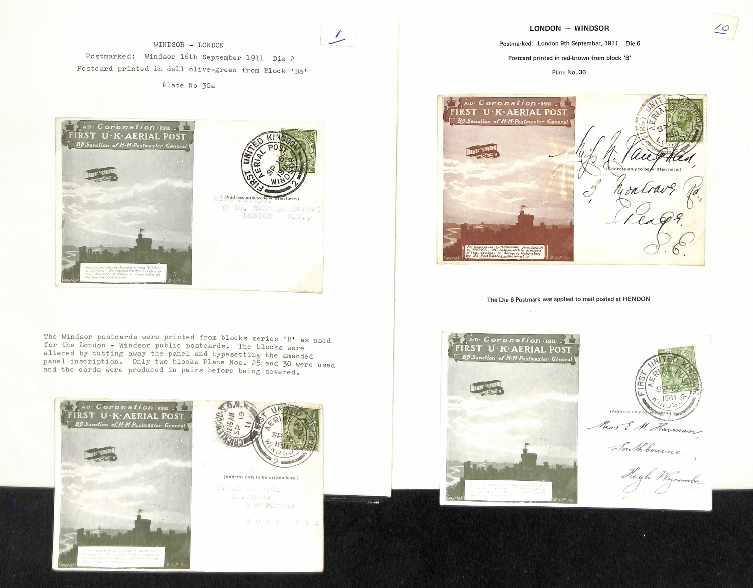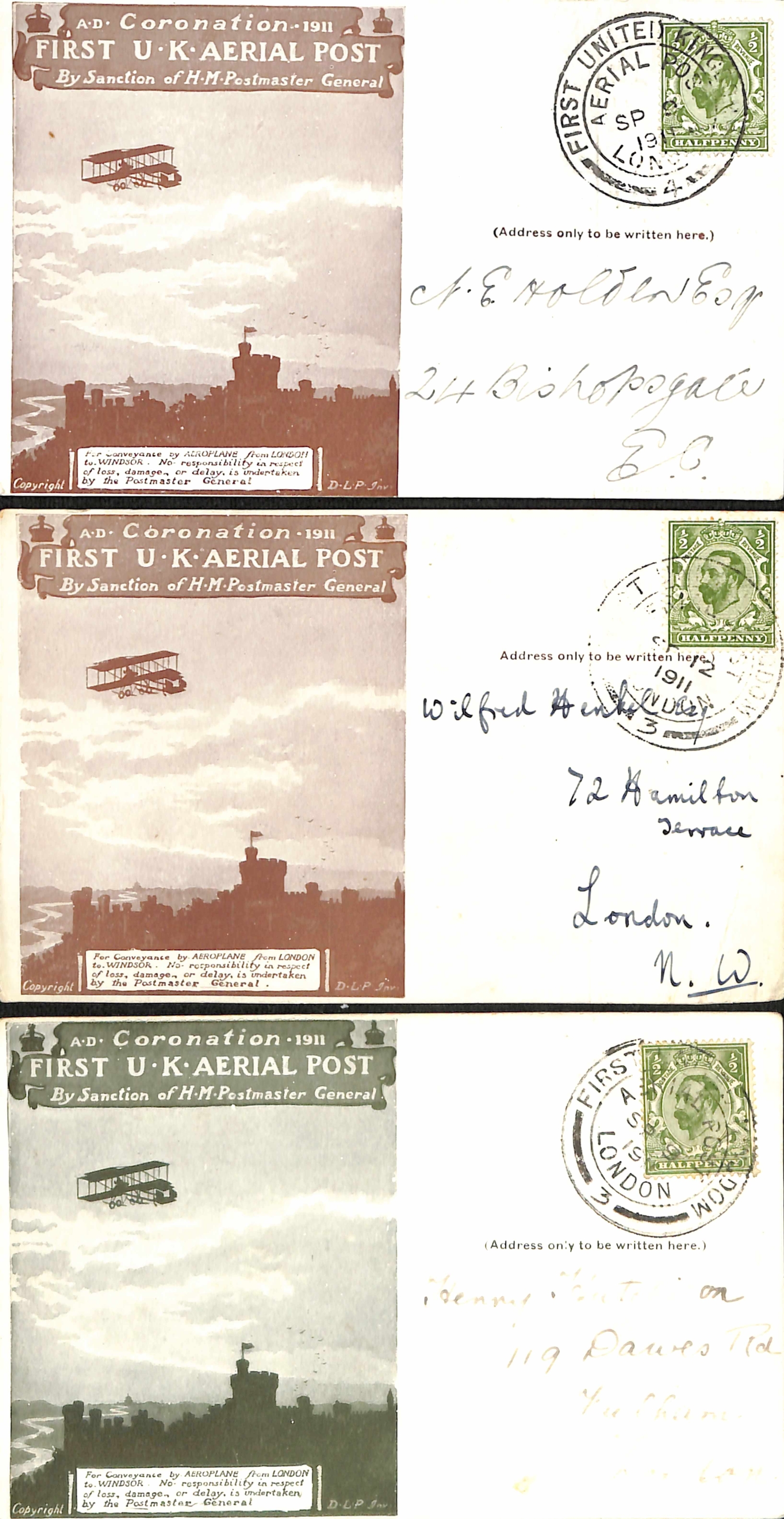 1911 (Sep 9-16) London to Windsor envelopes in green or purple-brown, London to Windsor postcards in brown (5), red-brown (4) or green (3), and Windsor to London postcards (3) all with Aerial Post datestamps (two code "5" or "6" c.d.s of Hendon Aerodrome), several cards with the sheet position identified, two bearing KEVII ½d stamps, one to New Zealand franked by two KGV ½d stamps, all fine. (17).