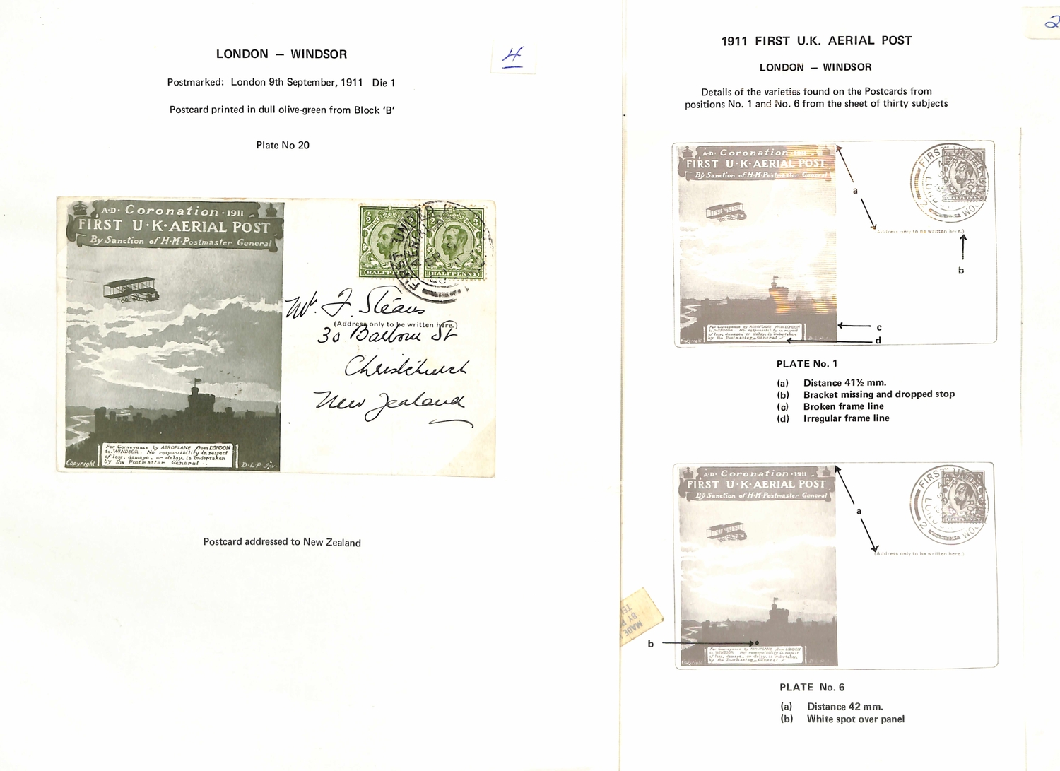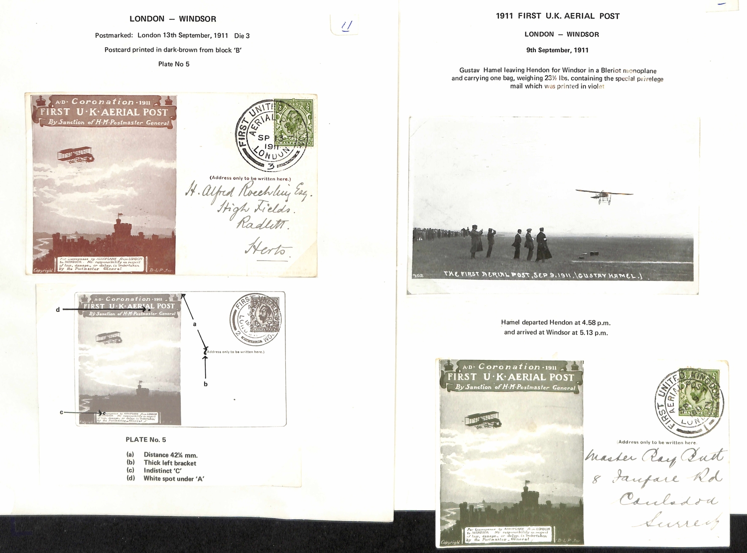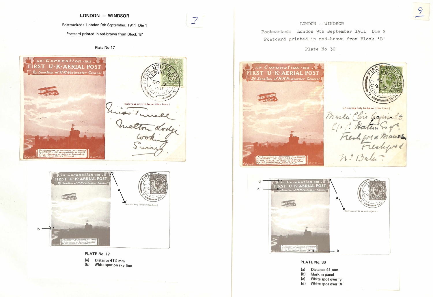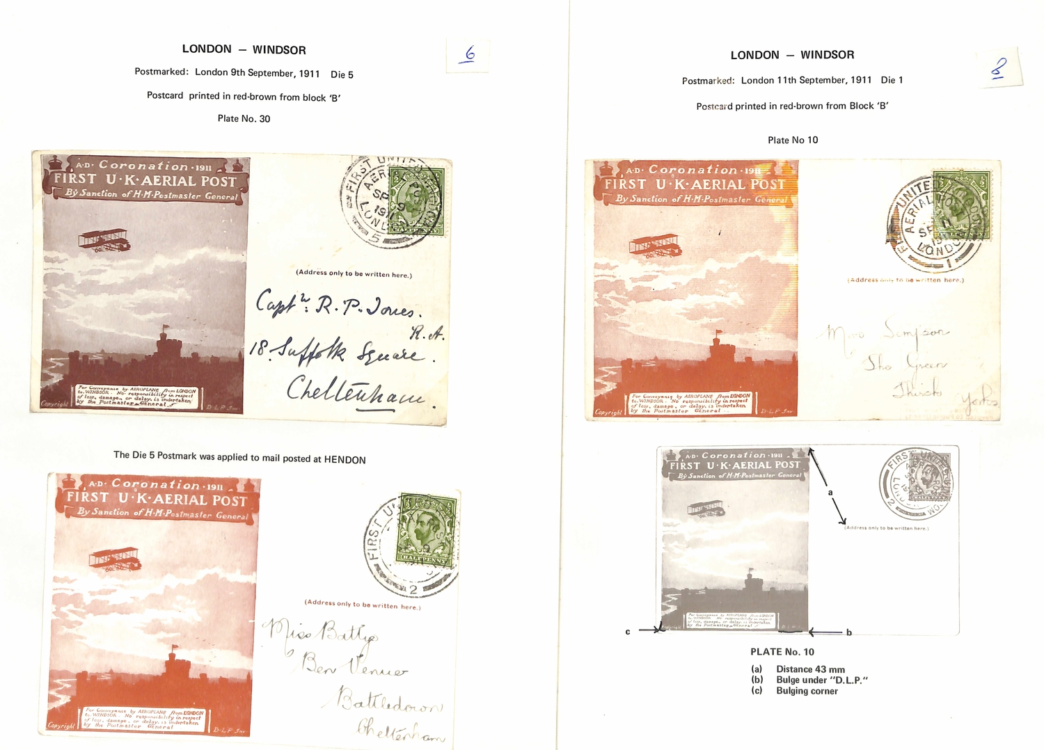 1911 (Sep 9-16) London to Windsor envelopes in green or purple-brown, London to Windsor postcards in brown (5), red-brown (4) or green (3), and Windsor to London postcards (3) all with Aerial Post datestamps (two code "5" or "6" c.d.s of Hendon Aerodrome), several cards with the sheet position identified, two bearing KEVII ½d stamps, one to New Zealand franked by two KGV ½d stamps, all fine. (17).