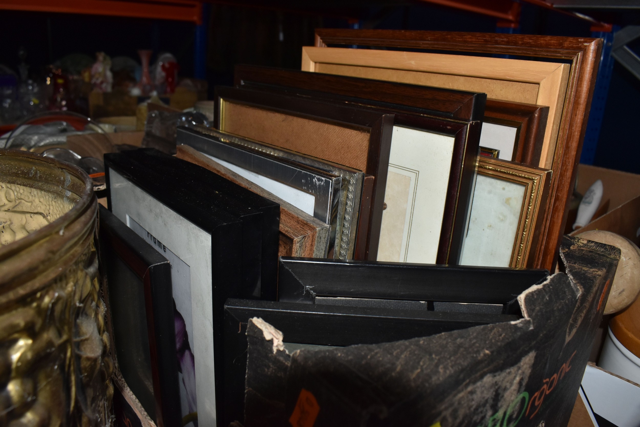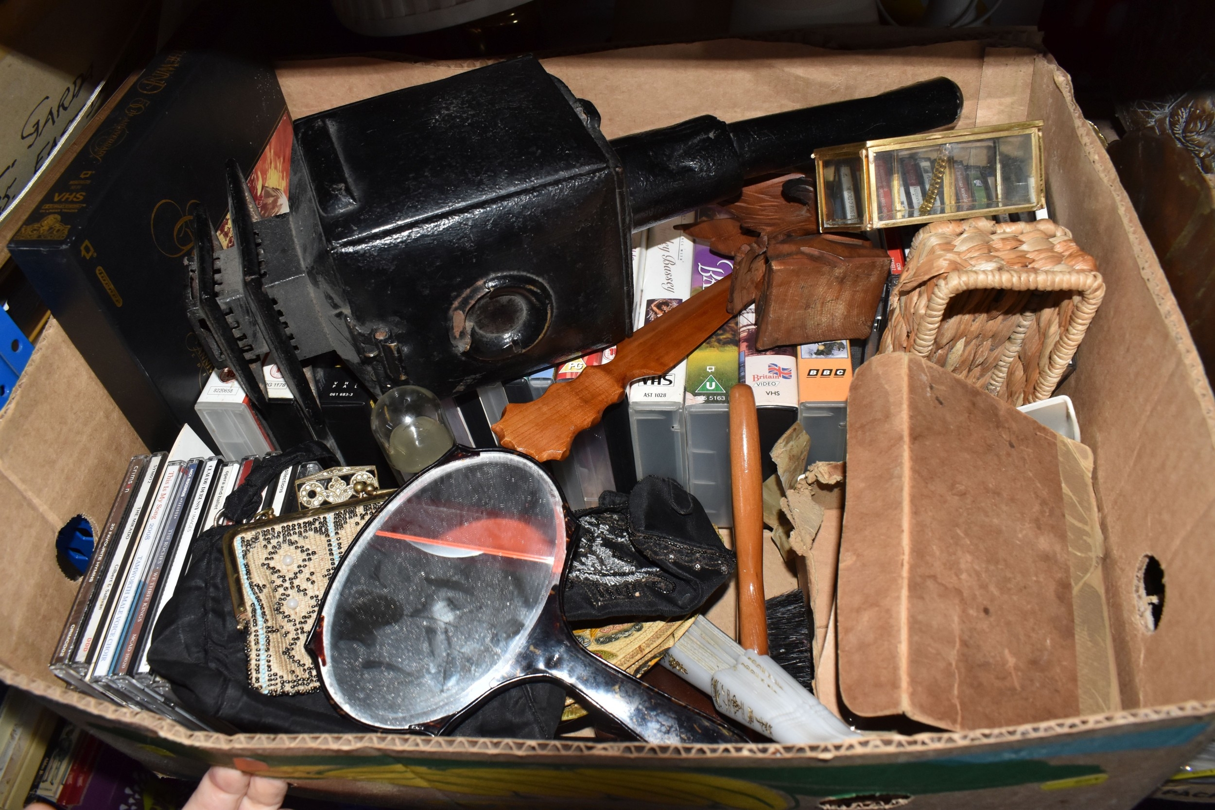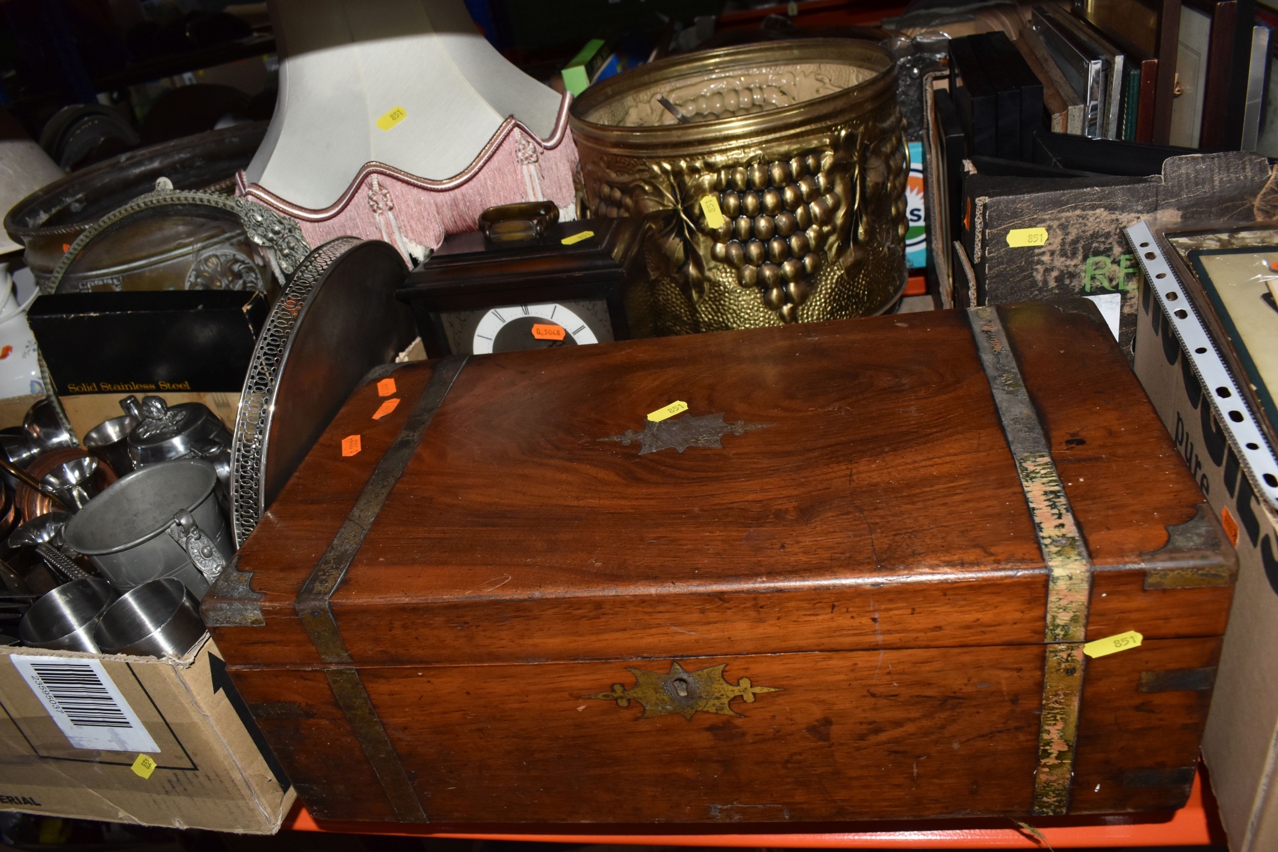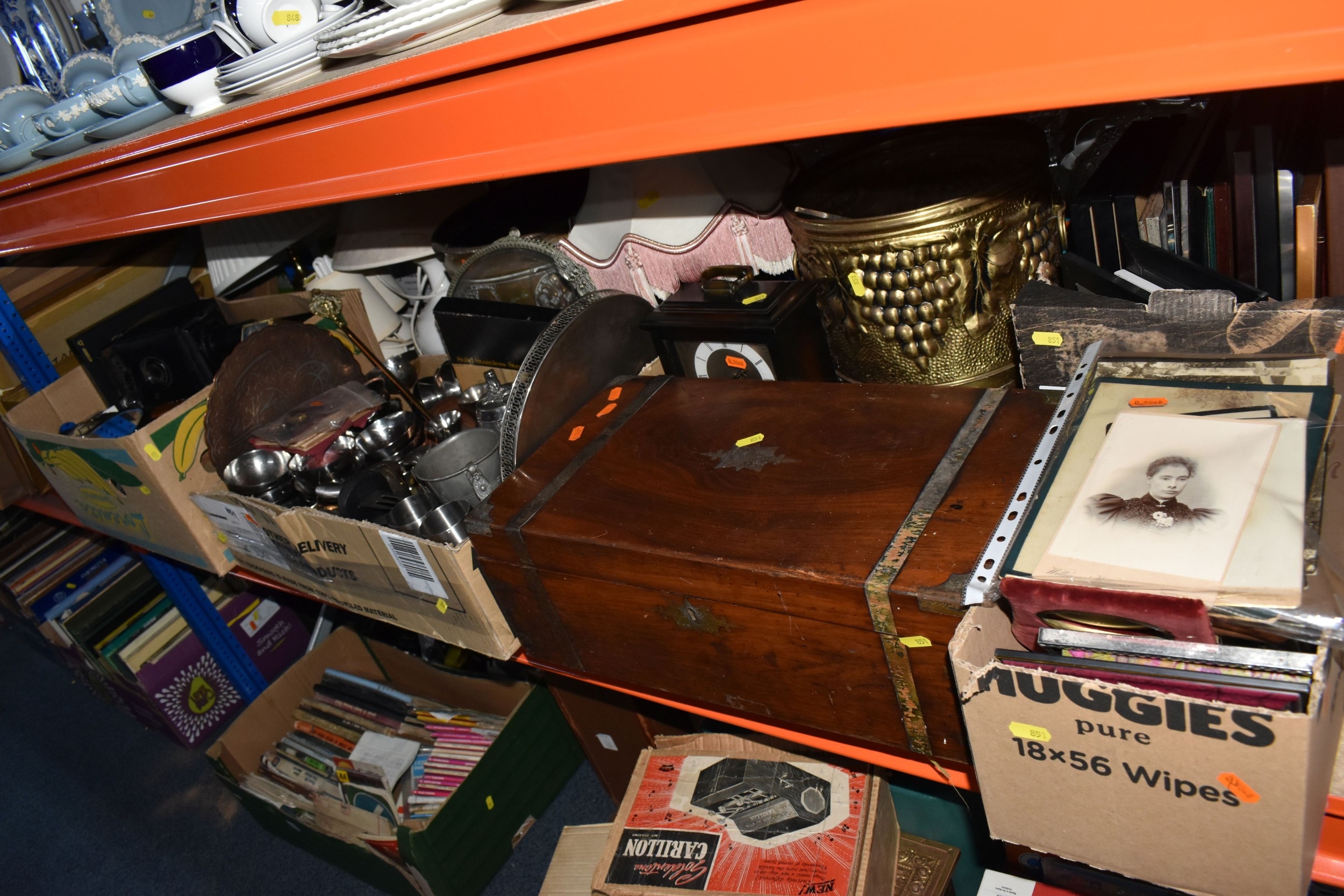 FOUR BOXES AND LOOSE ASSORTED MISCELLANEOUS ITEMS to include two boxes of assorted picture frames etc, a vintage writing slopes (loss, a/f), a small group of vintage photograph portraits, two repousse brass coal scuttles in differing styles, a small group of assorted table lamps, a vintage carriage lamp, a boxed gas mask, assorted stainless steel and pewter dishes and cups, assorted VHS cassettes and CDs, a copper tray bearing the name of Allah in Arabic, etc (4 boxes and loose) (s.d)