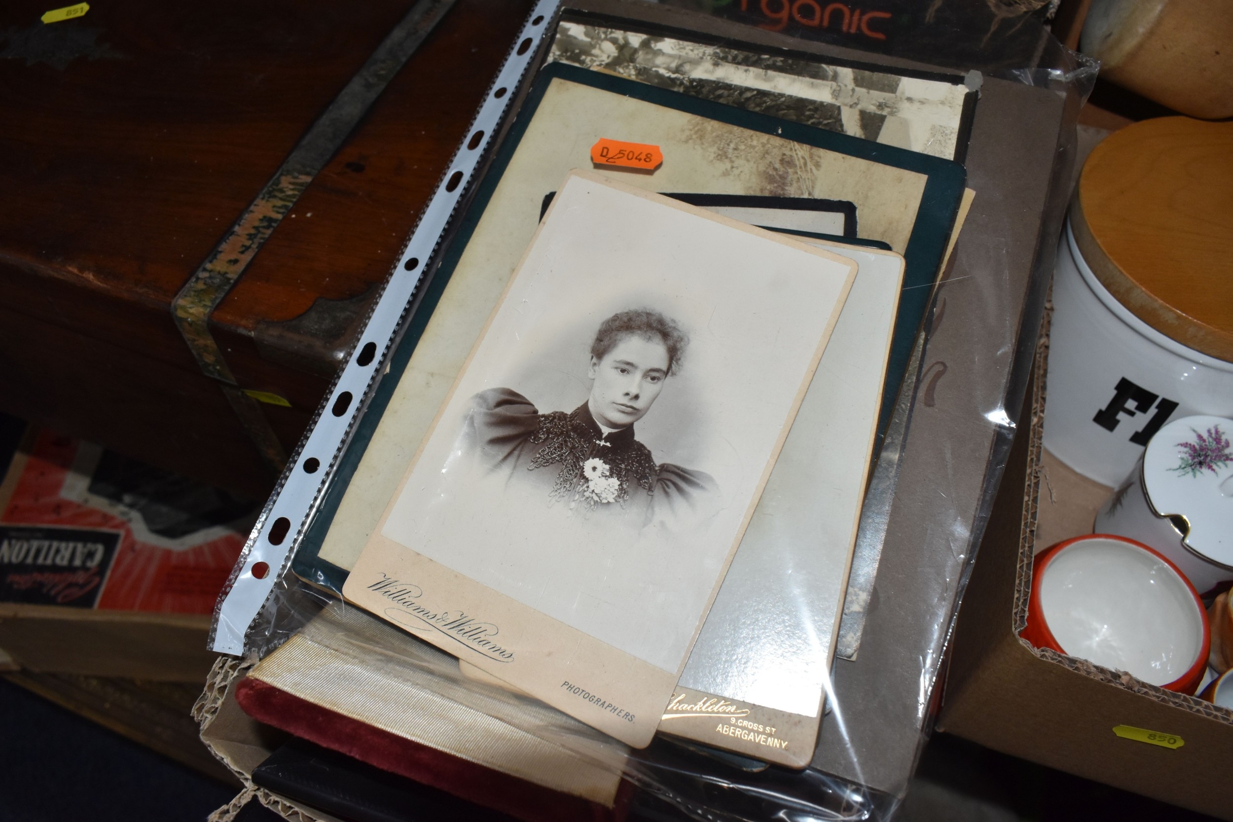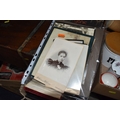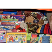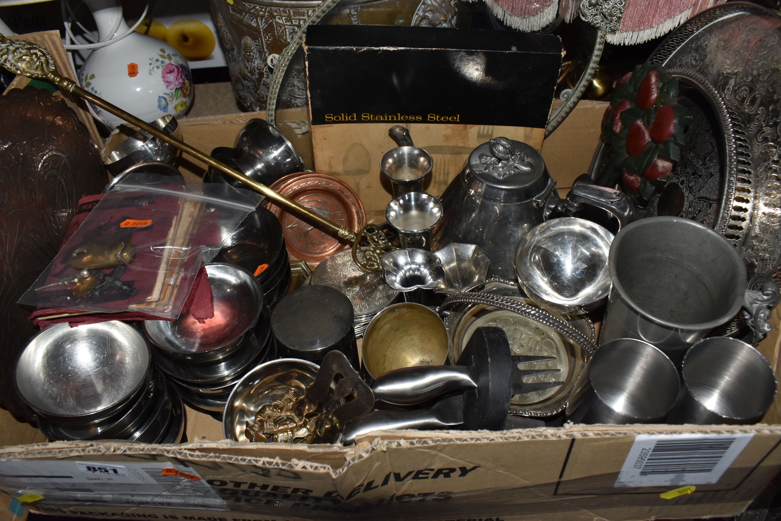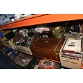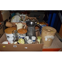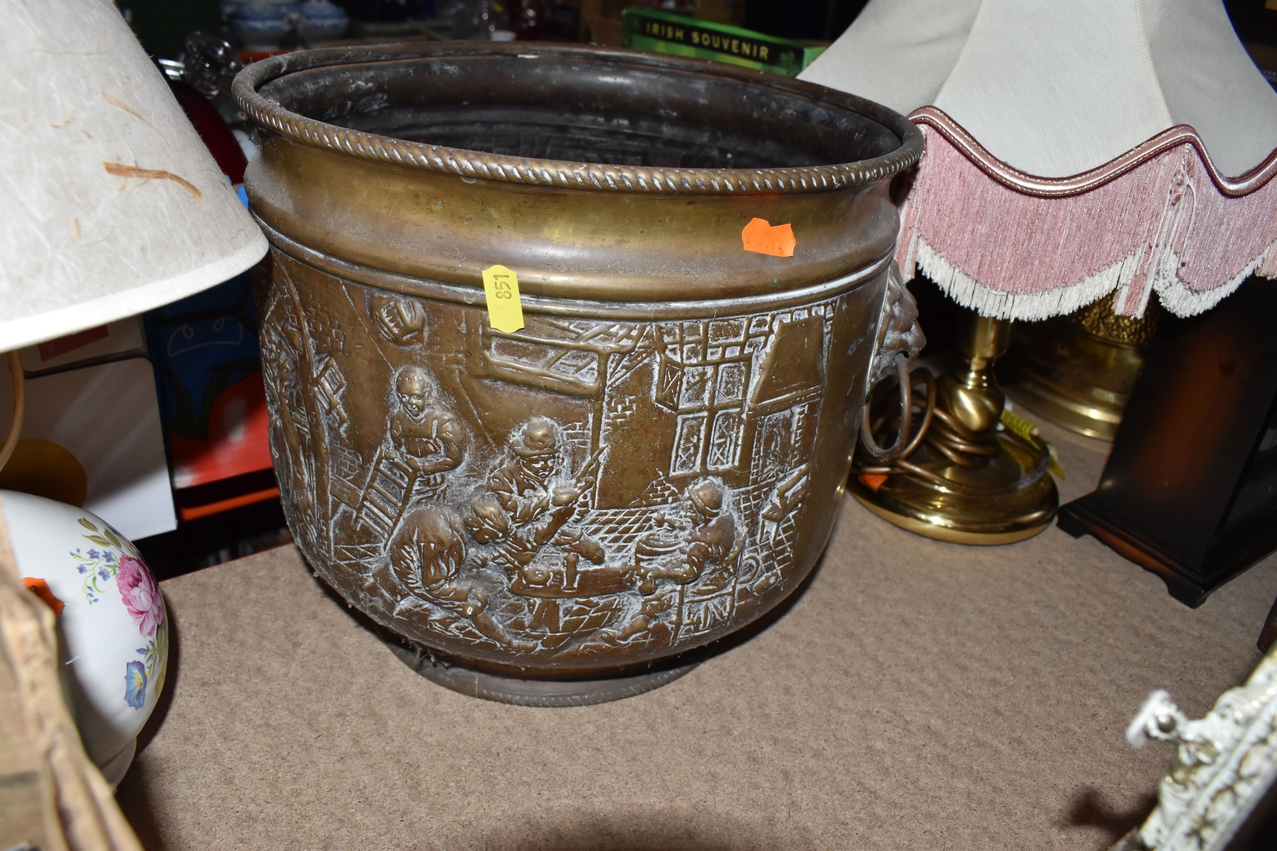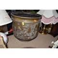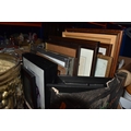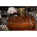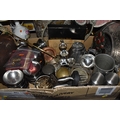 FOUR BOXES AND LOOSE ASSORTED MISCELLANEOUS ITEMS to include two boxes of assorted picture frames etc, a vintage writing slopes (loss, a/f), a small group of vintage photograph portraits, two repousse brass coal scuttles in differing styles, a small group of assorted table lamps, a vintage carriage lamp, a boxed gas mask, assorted stainless steel and pewter dishes and cups, assorted VHS cassettes and CDs, a copper tray bearing the name of Allah in Arabic, etc (4 boxes and loose) (s.d)