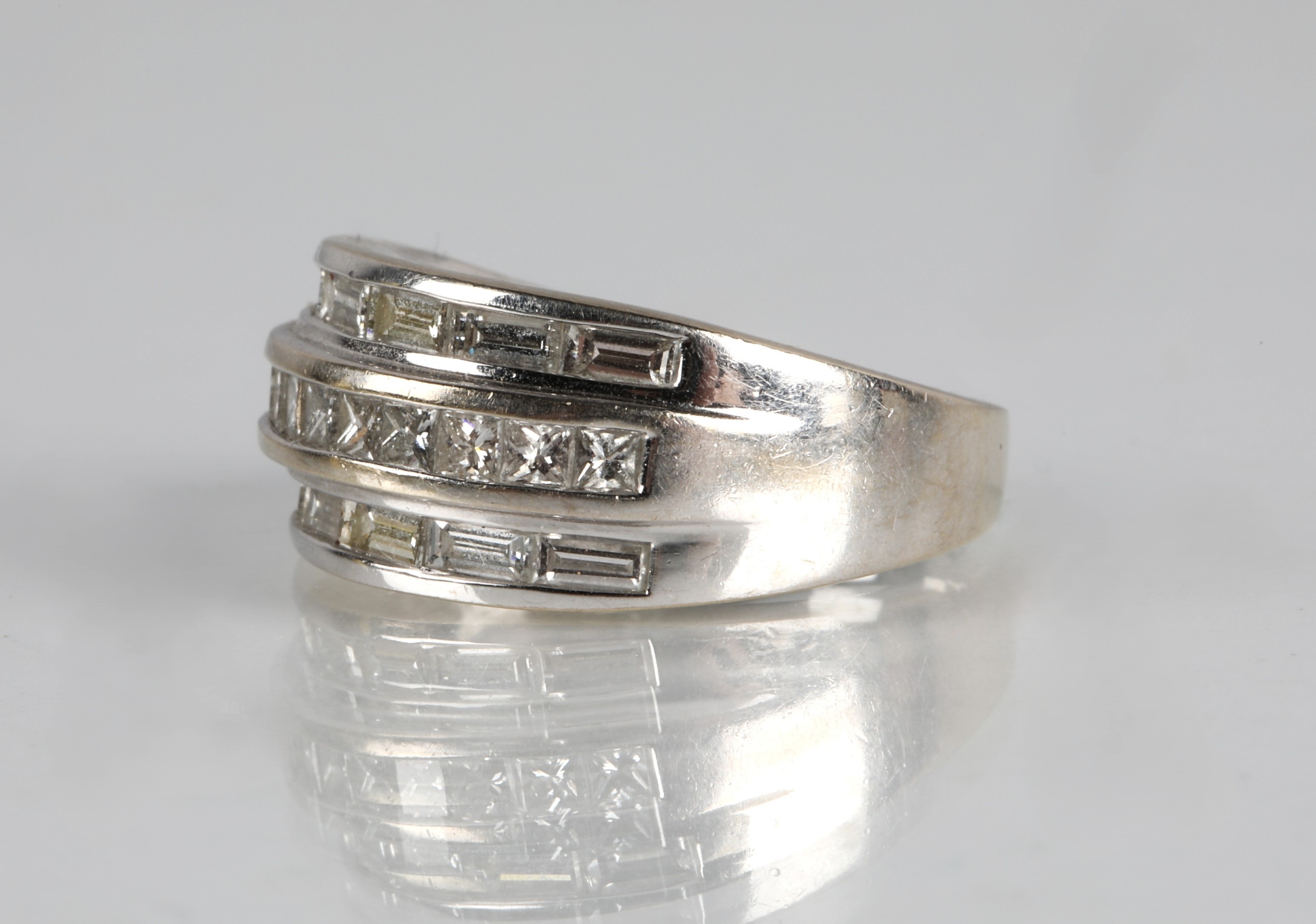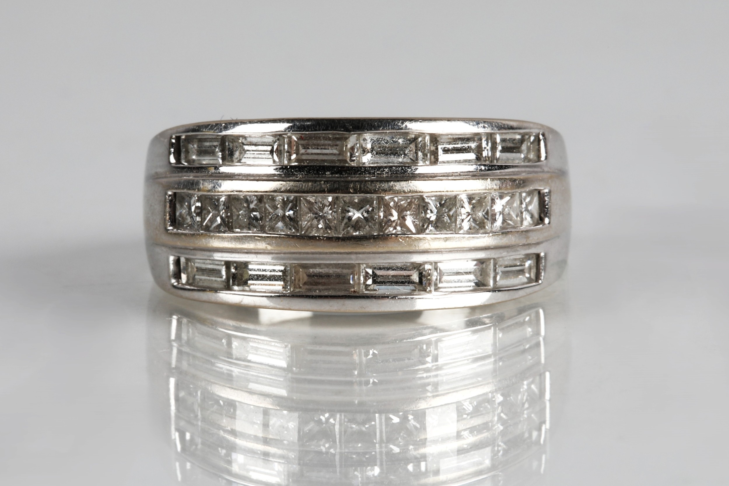 14K white gold ring set with square and baguette cut diamonds, ring size P, 7.5g