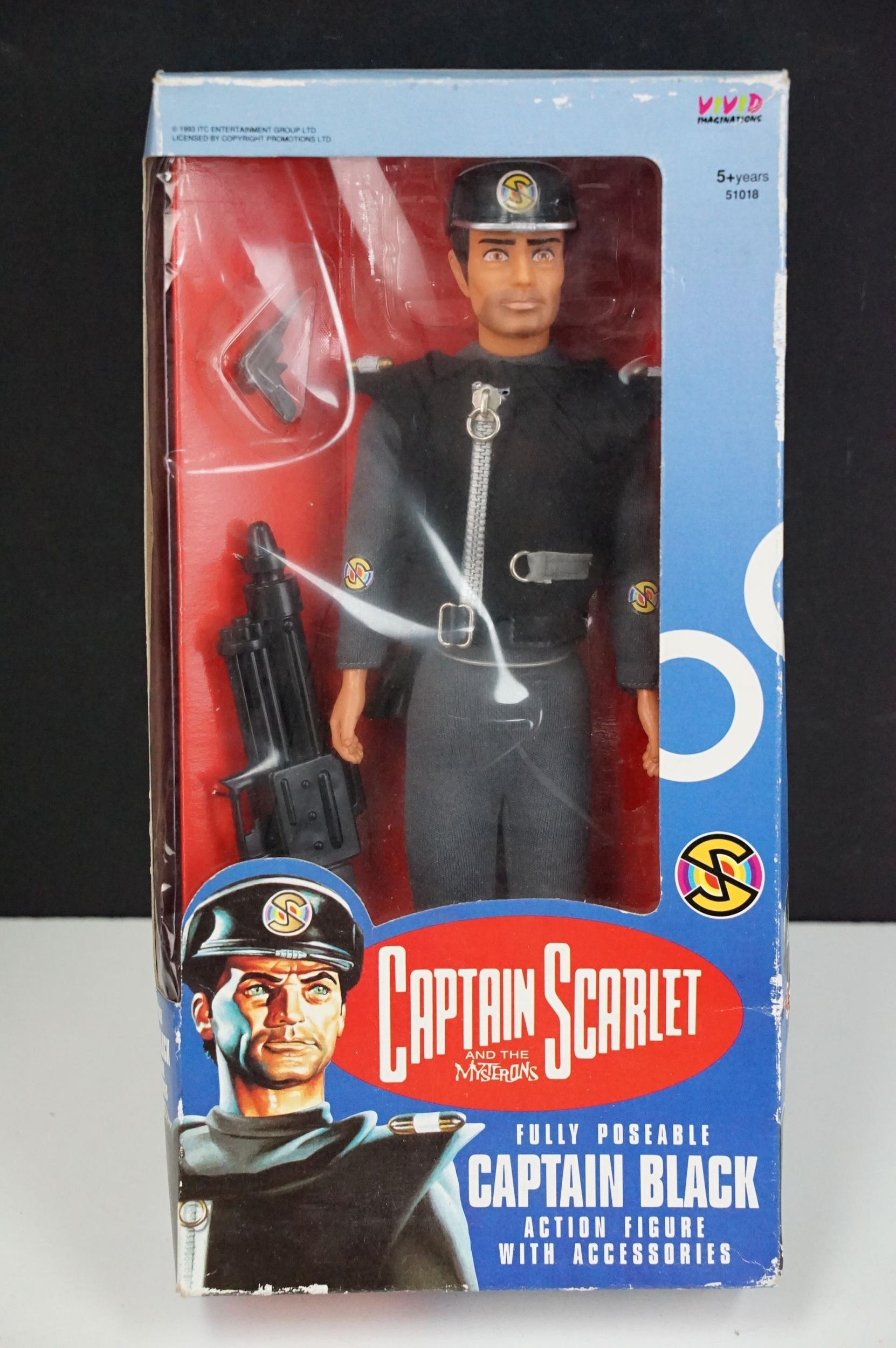 Five boxed Vivid Imaginations Captain Scarlet action figures to include Captain Black Talking Action Figure, Captain Scarlet Talking Action Figure, Captain Blue Talking Action Figure, Captain Scarlet Fully Poseable Action Figure and Captain Black Fully Poseable Action Figure, all ex, boxes showing some squash and wear in places but gd-vg overall