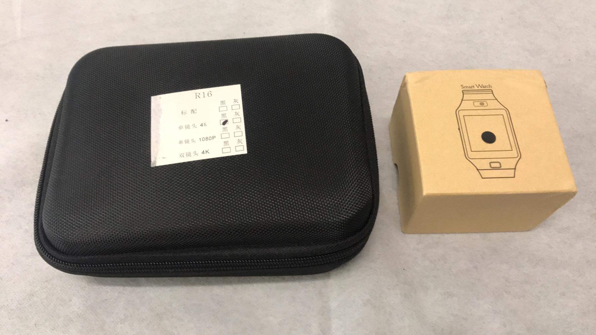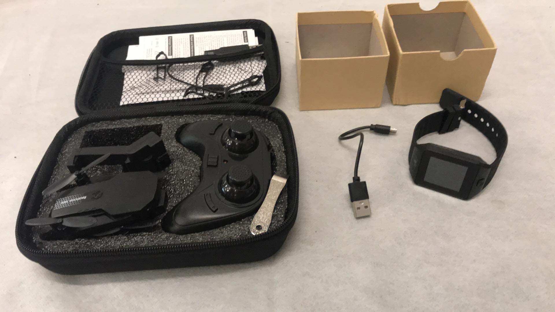 Rear horse mini drone in its protective case with control and instructions plus a smart watch