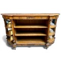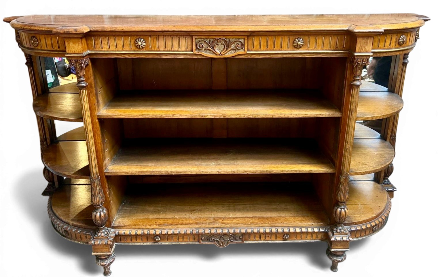 A good quality D ended oak credenza with gilded highlights, mirrored backed shelves to sides. Stamped Howard & Sons, Berners Street. 167.5 cm w x 97.5cm h x 43cm d.