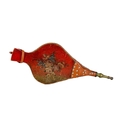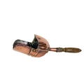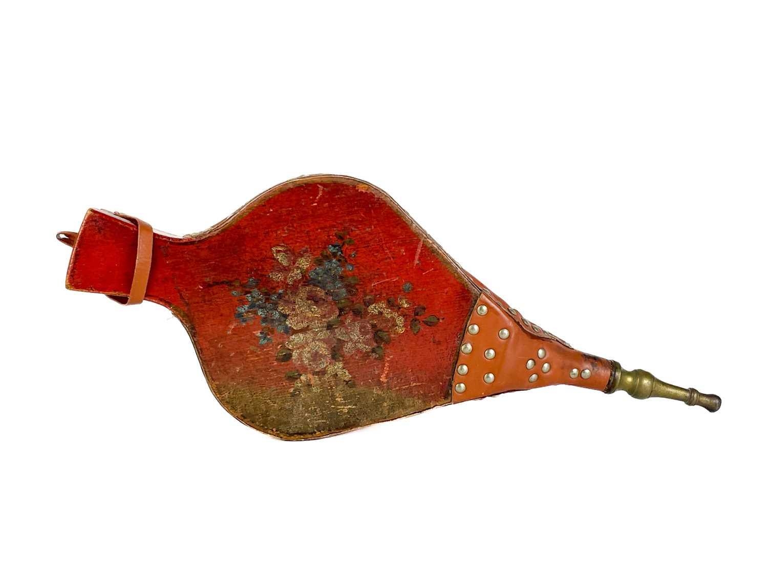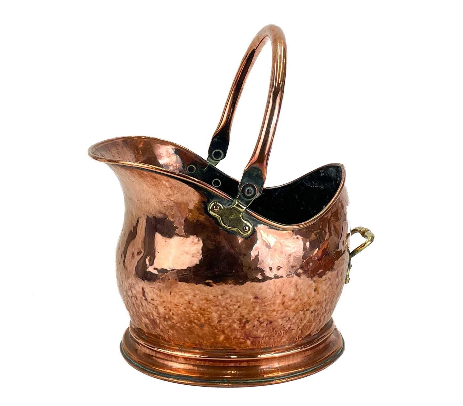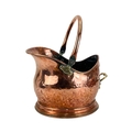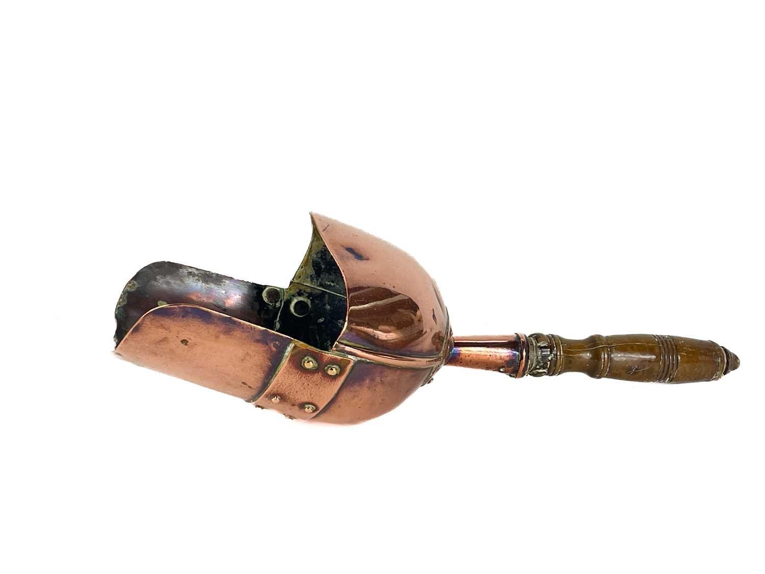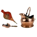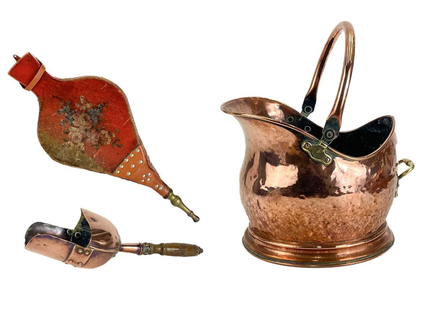 A Victorian copper coal helmet. Height including handle 37.5cm, together with scoop, and a pair of bellows hand painted with a spray of roses (3).
