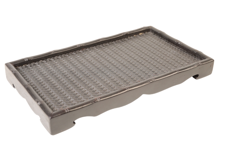 A CHINESE "ZITAN" TRAY carved to simulate a rattan panel within a bamboo frame, on shaped feet, Qing or later, 32cm x 18cm