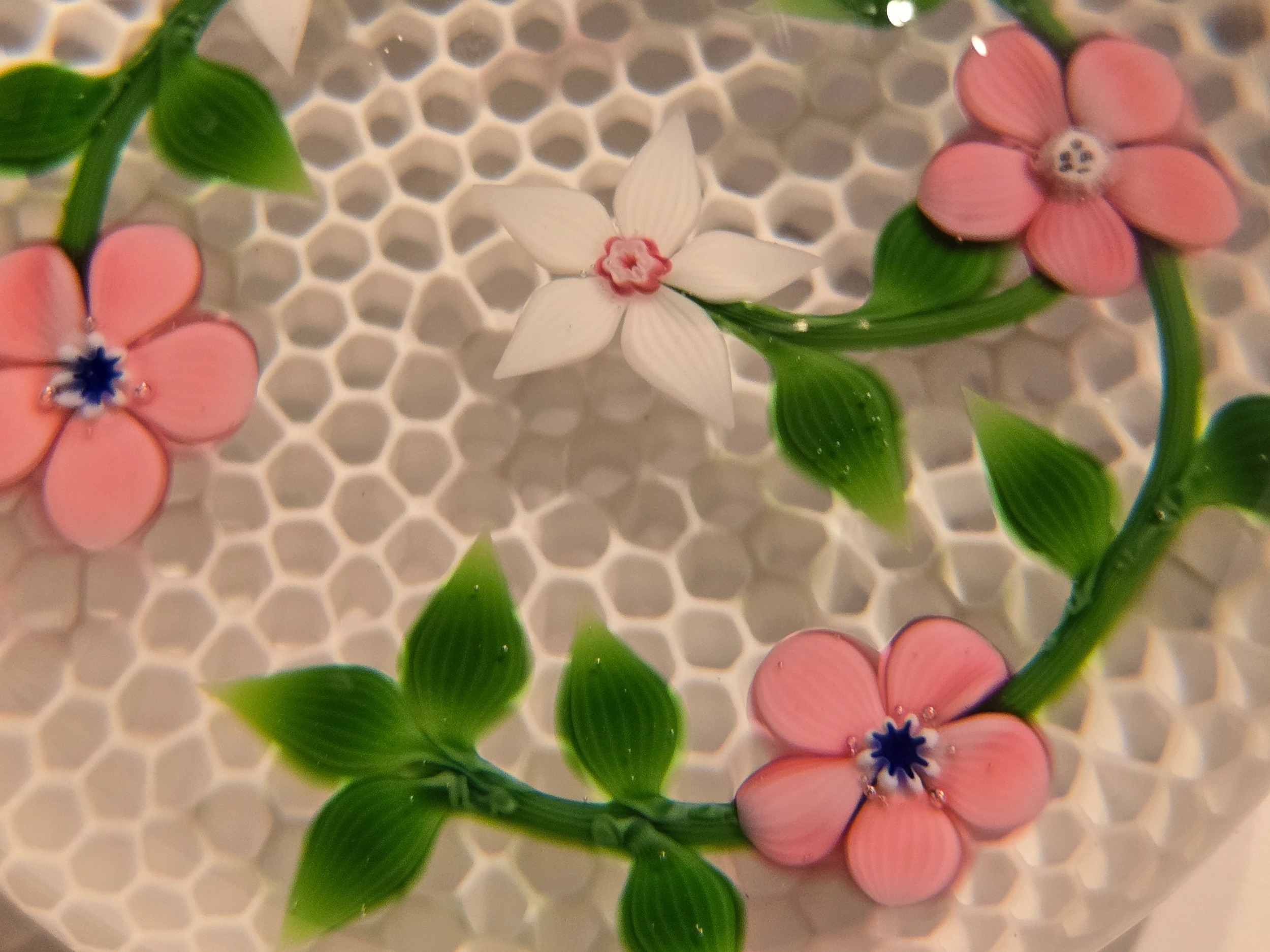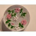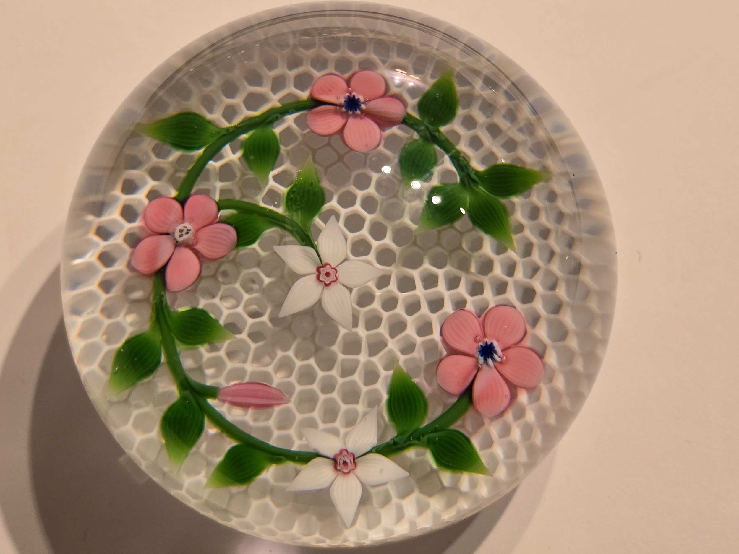 Valentines Gift: Baccarat (Fr) Paperweight - Garland of pink & white flowers on Honeycombe. From 1986. Excellent condition. 79mm diam