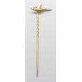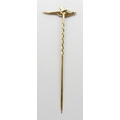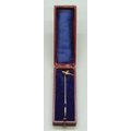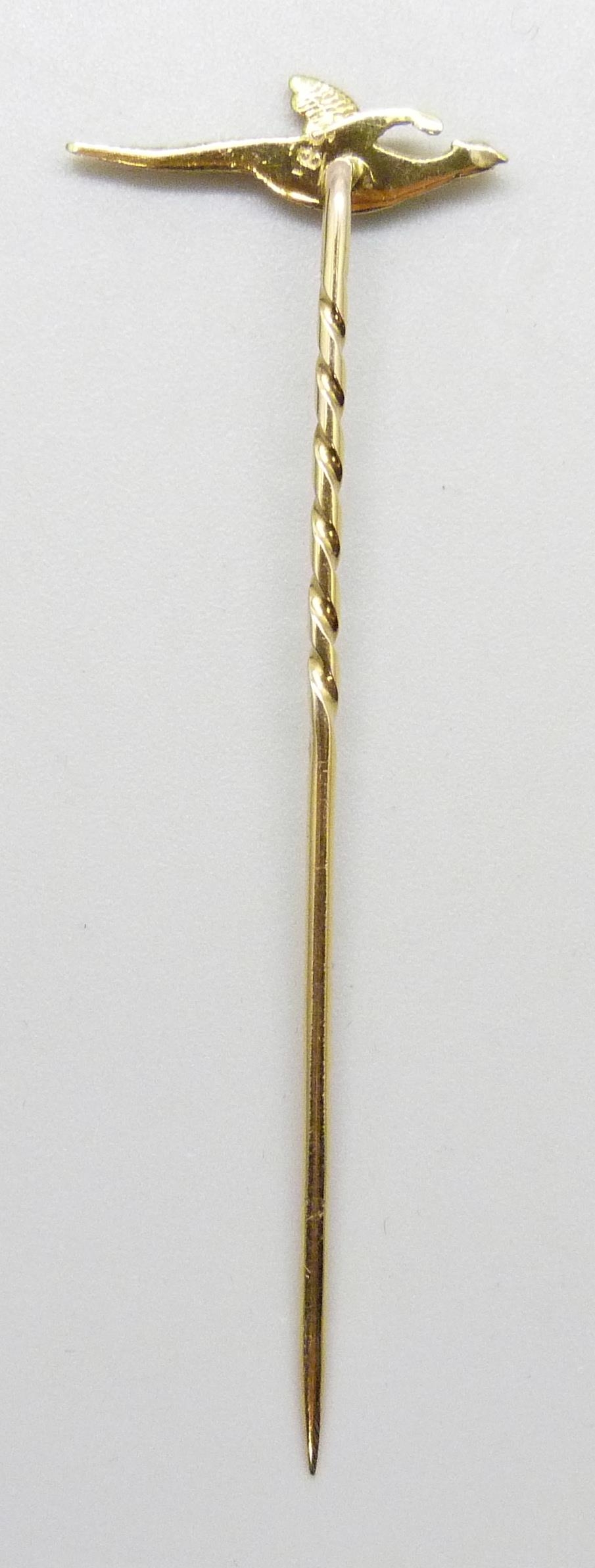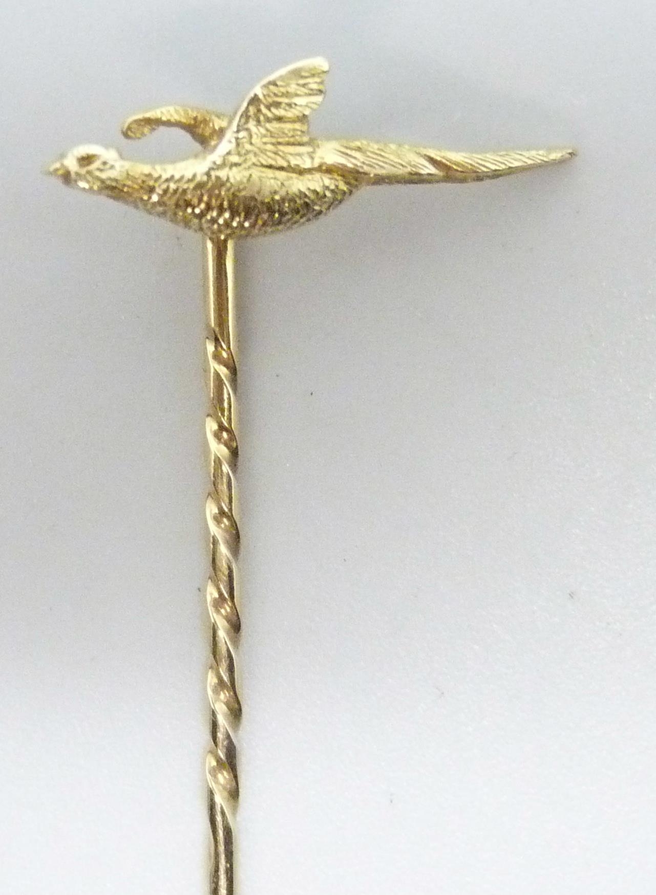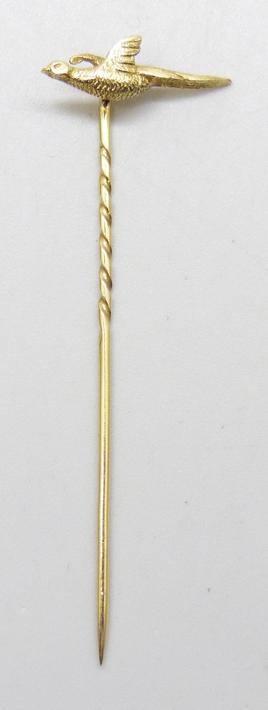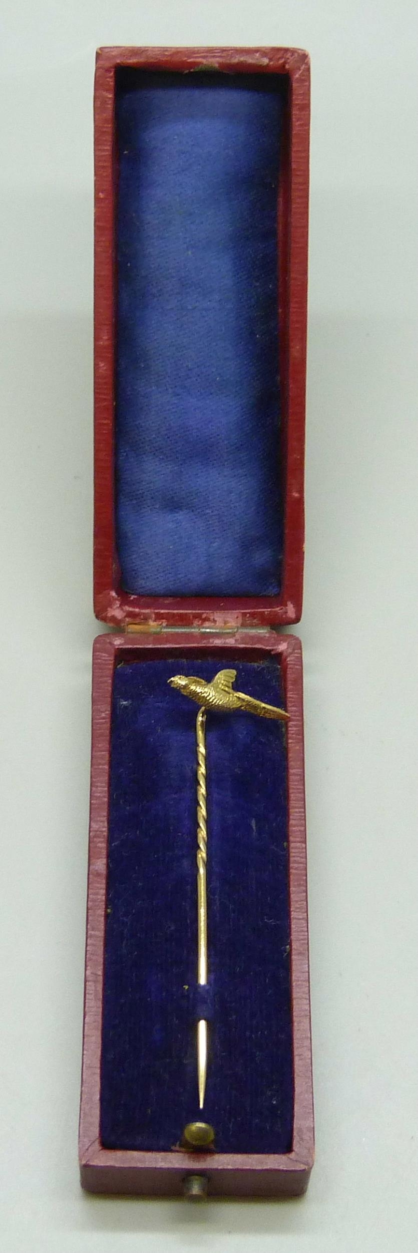 A yellow metal pheasant stick pin marked 18, 1.9g, 6.2cm, in a vintage box
