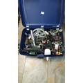 A quantity of bicycle components and spares, including chainrings, cranks, pedals, derailleur parts, chains, cables and assorted fittings, housed in a blue plastic lidded storage trunk.