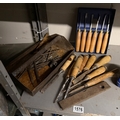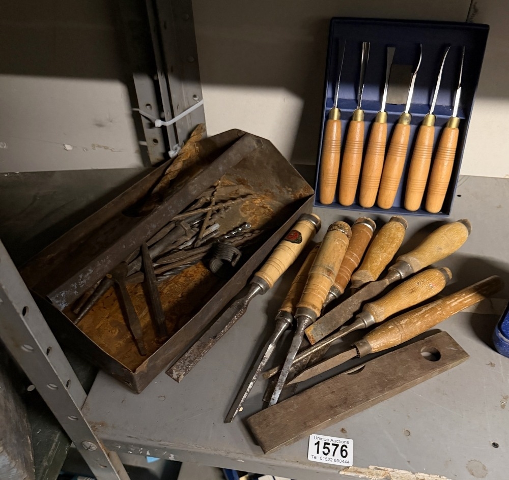 A selection of wood chisels, drill bits etc