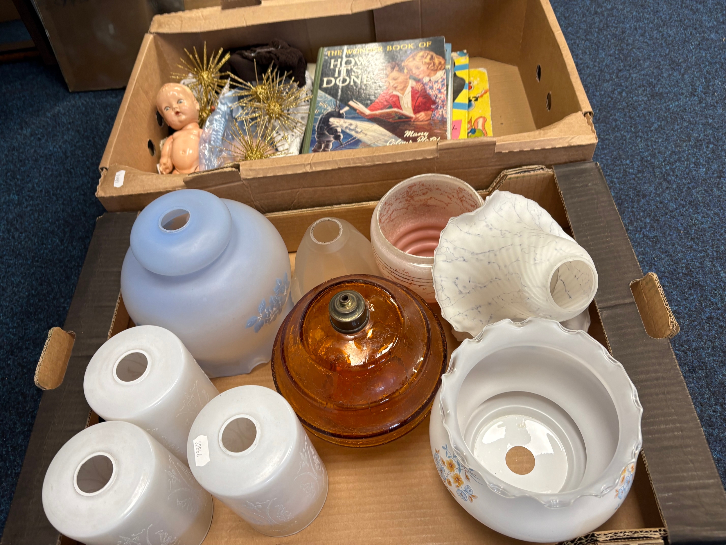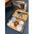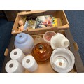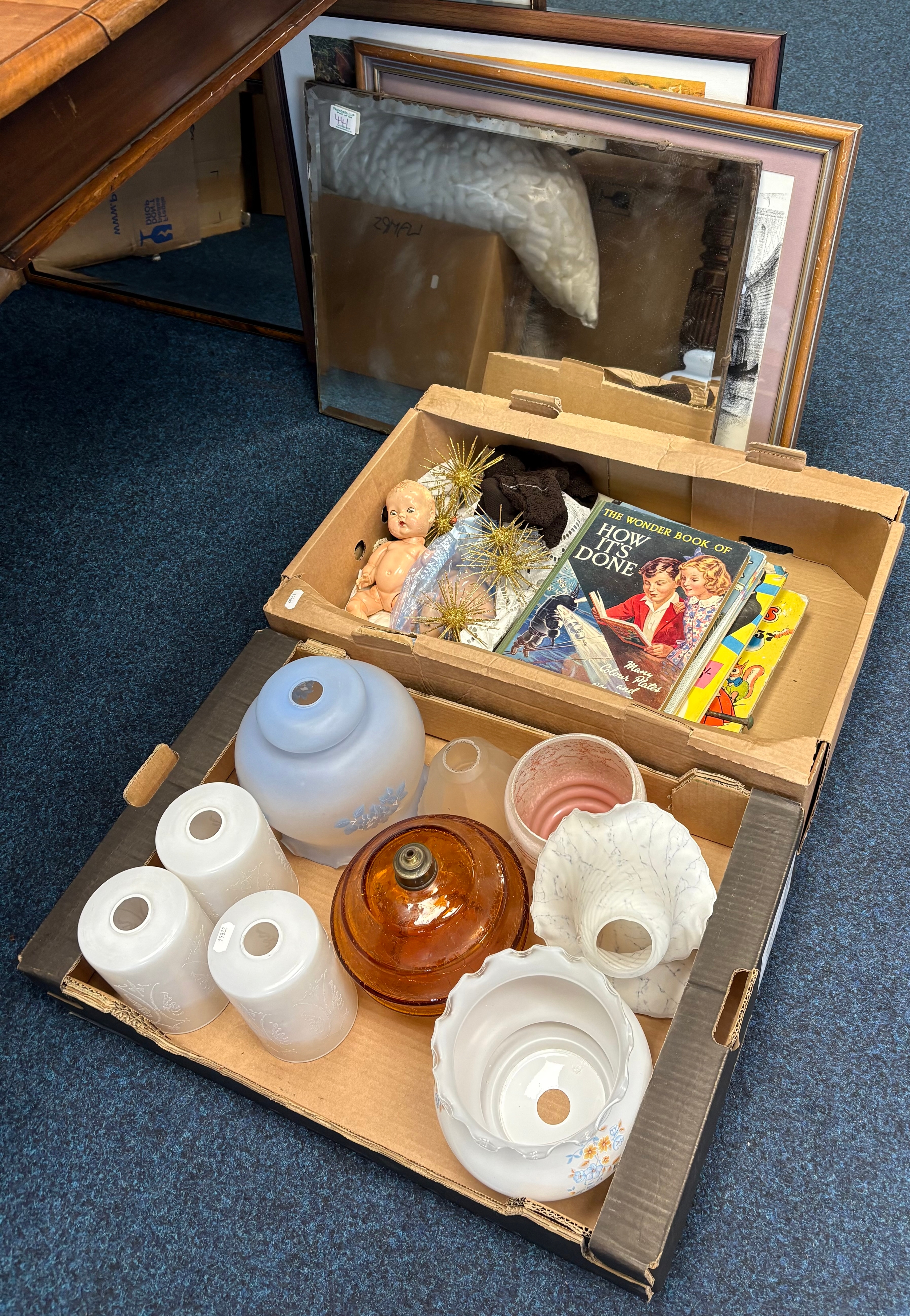A qty of glass lamp shades, frameless mirror, prints etc