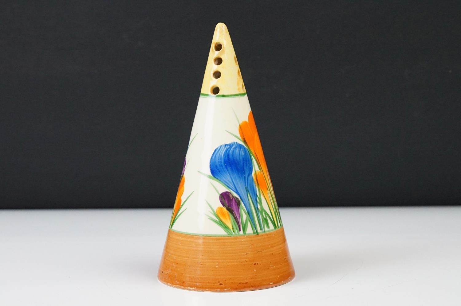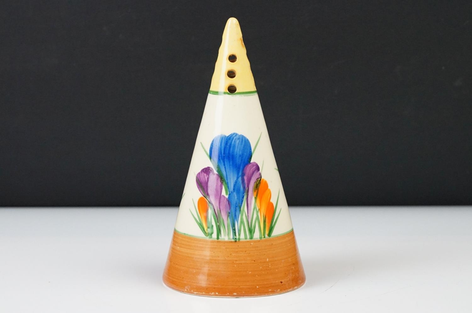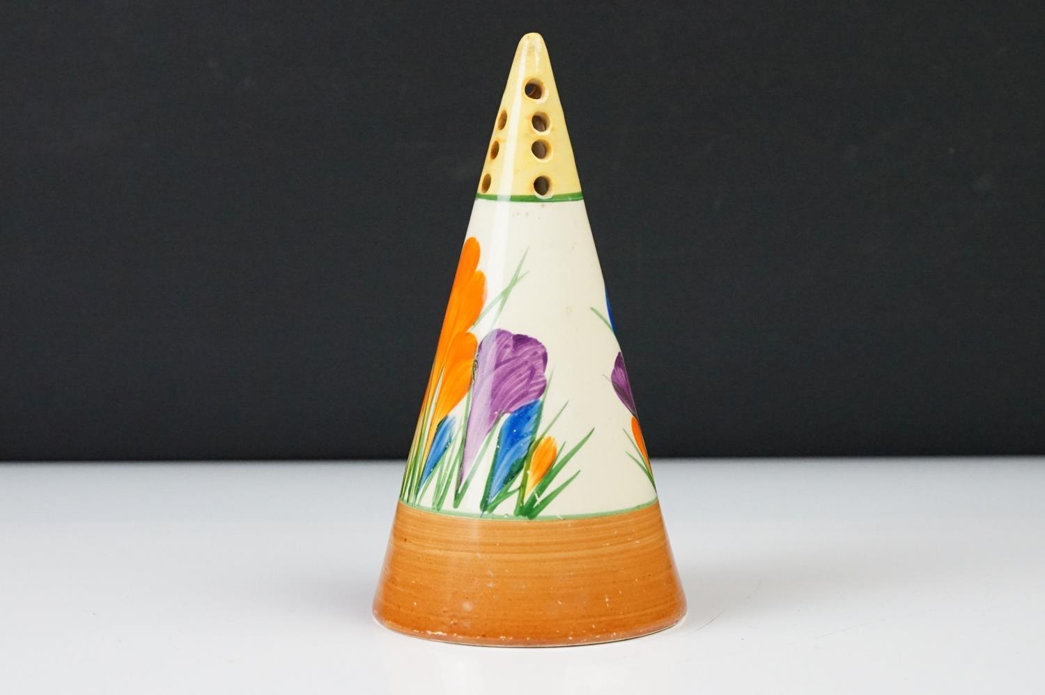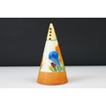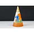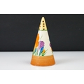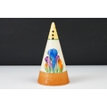 Clarice Cliff Pottery Bizarre Conical Sugar Shaker in the crocus pattern, 14cm high