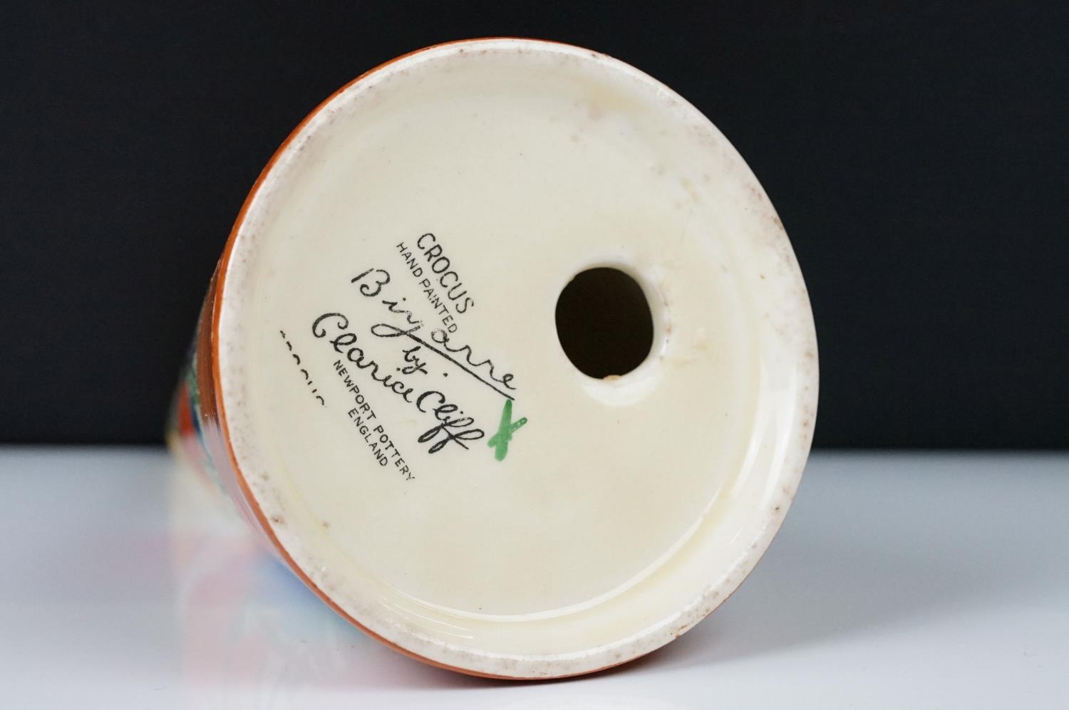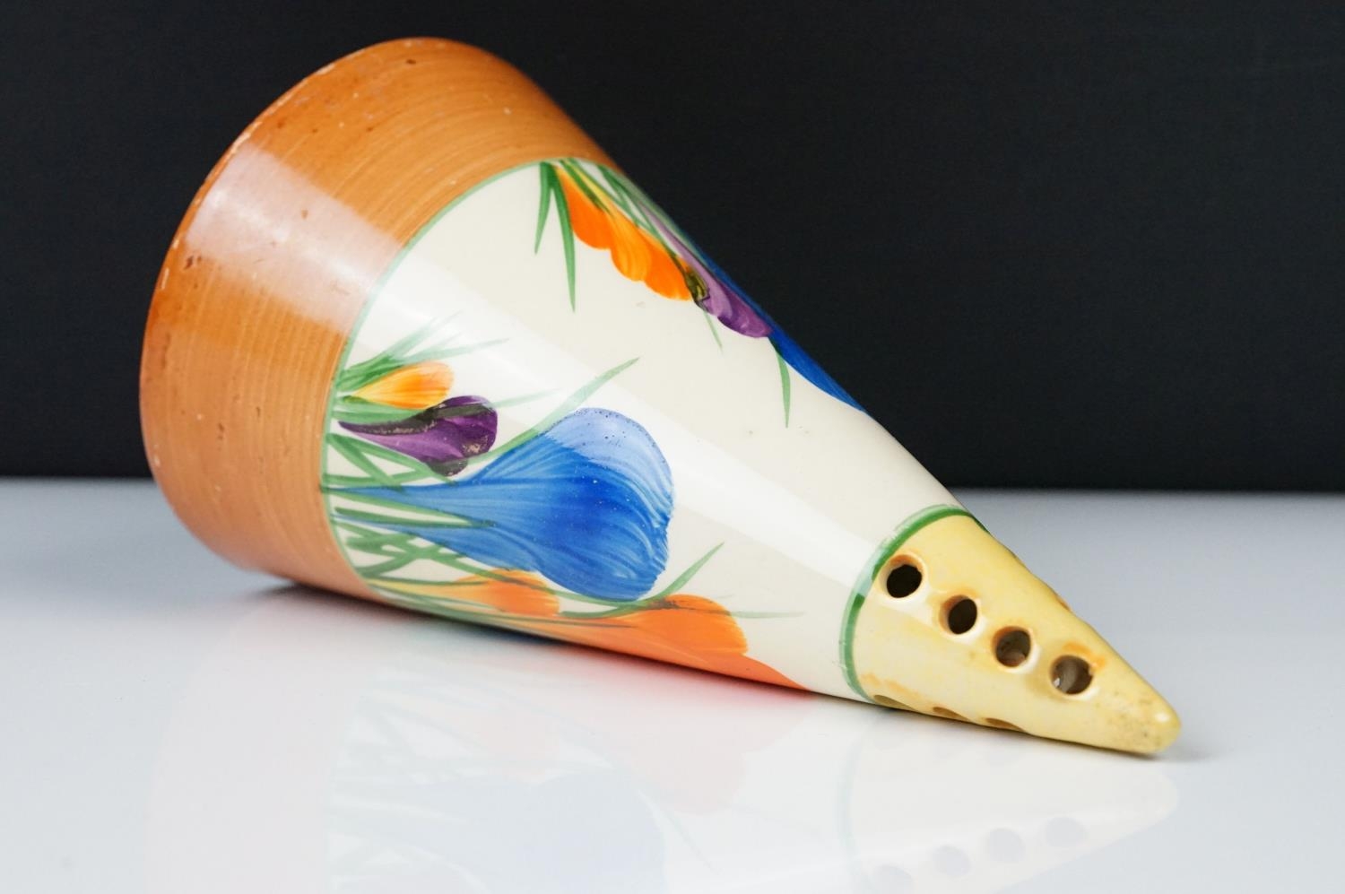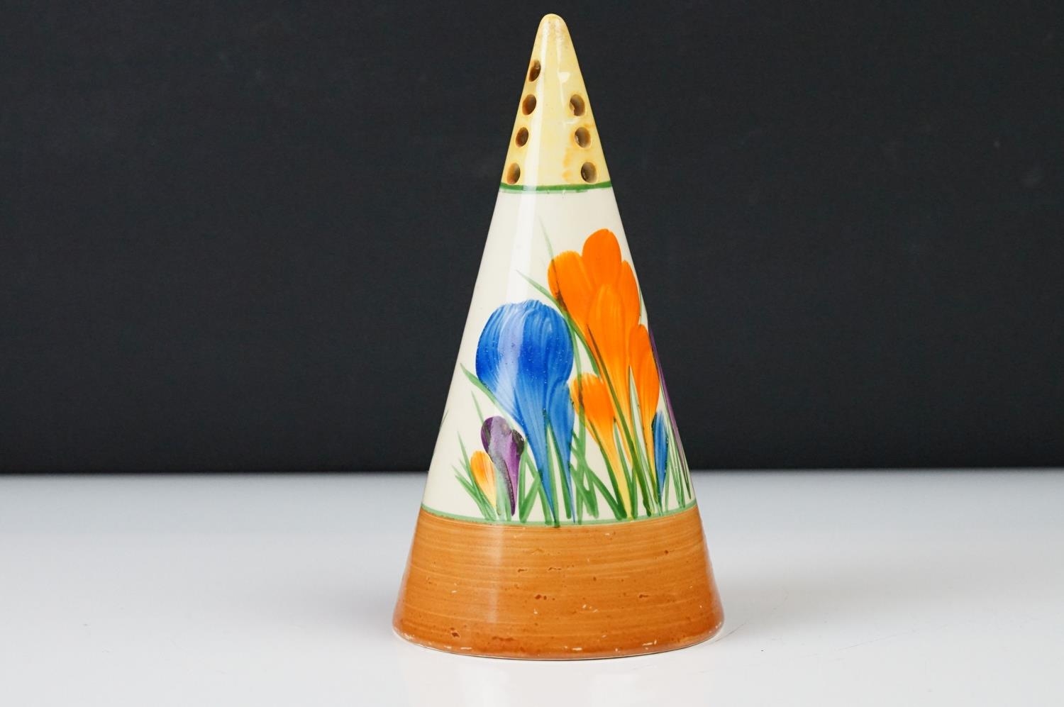Clarice Cliff Pottery Bizarre Conical Sugar Shaker in the crocus pattern, 14cm high