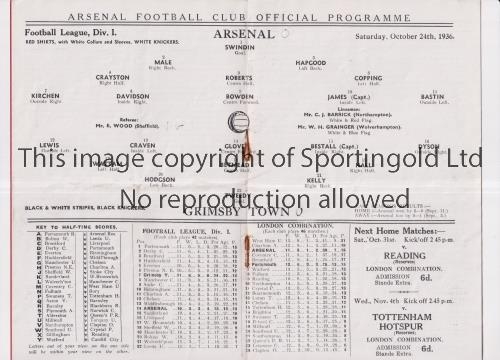 ARSENAL / INAUGURATION OF THE EAST STAND AT HIGHBURY Programme for the home league match v Grimsby Town 24/10/1936 including the opening of the new East Stand, slight horizontal crease, scores entered and rusty staples. Generally good
