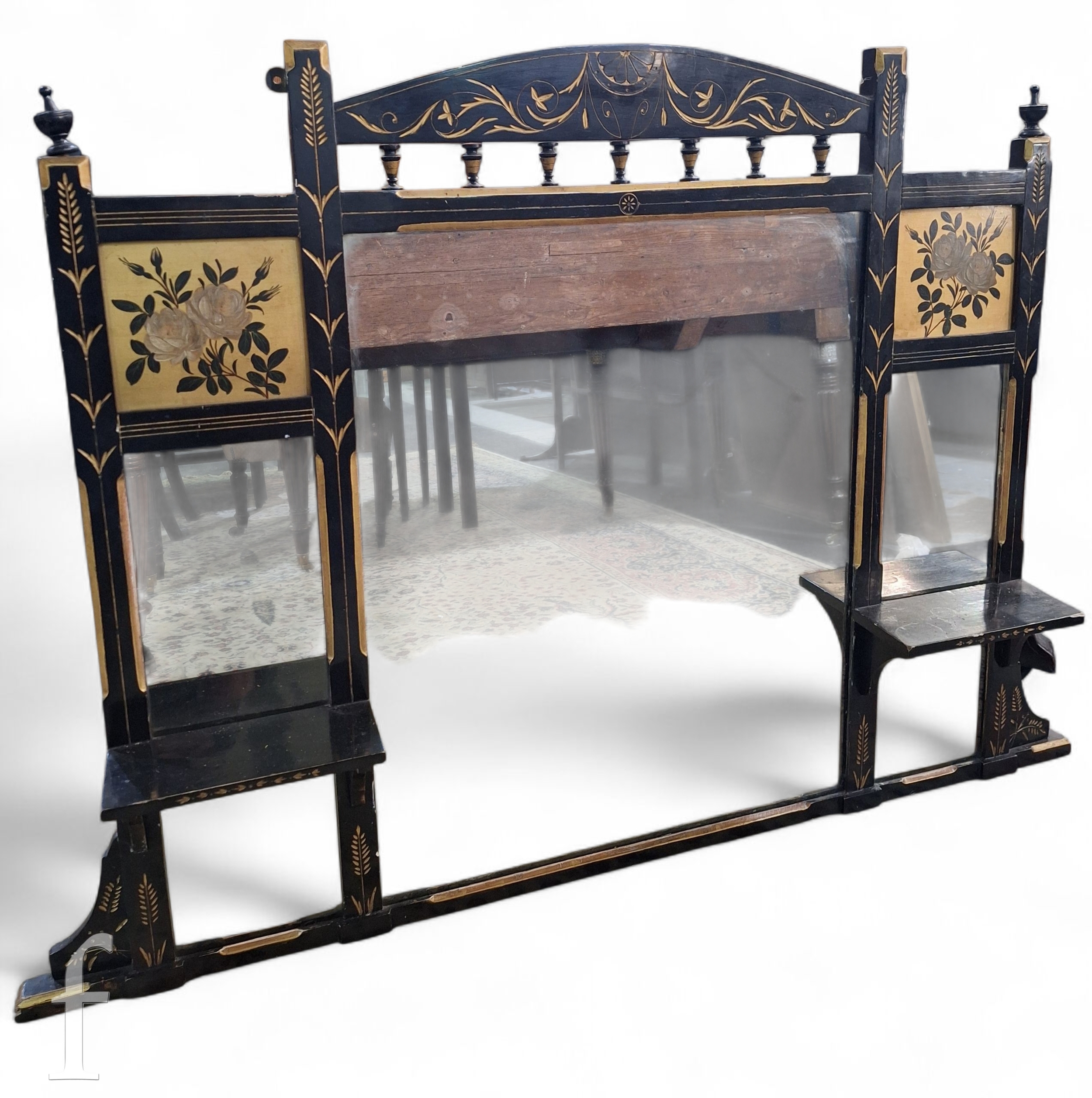 A Victorian ebonised and parcel gilt over mantle mirror in the aesthetic style, painted panels of white roses and leaves, 89cm x 104cm.