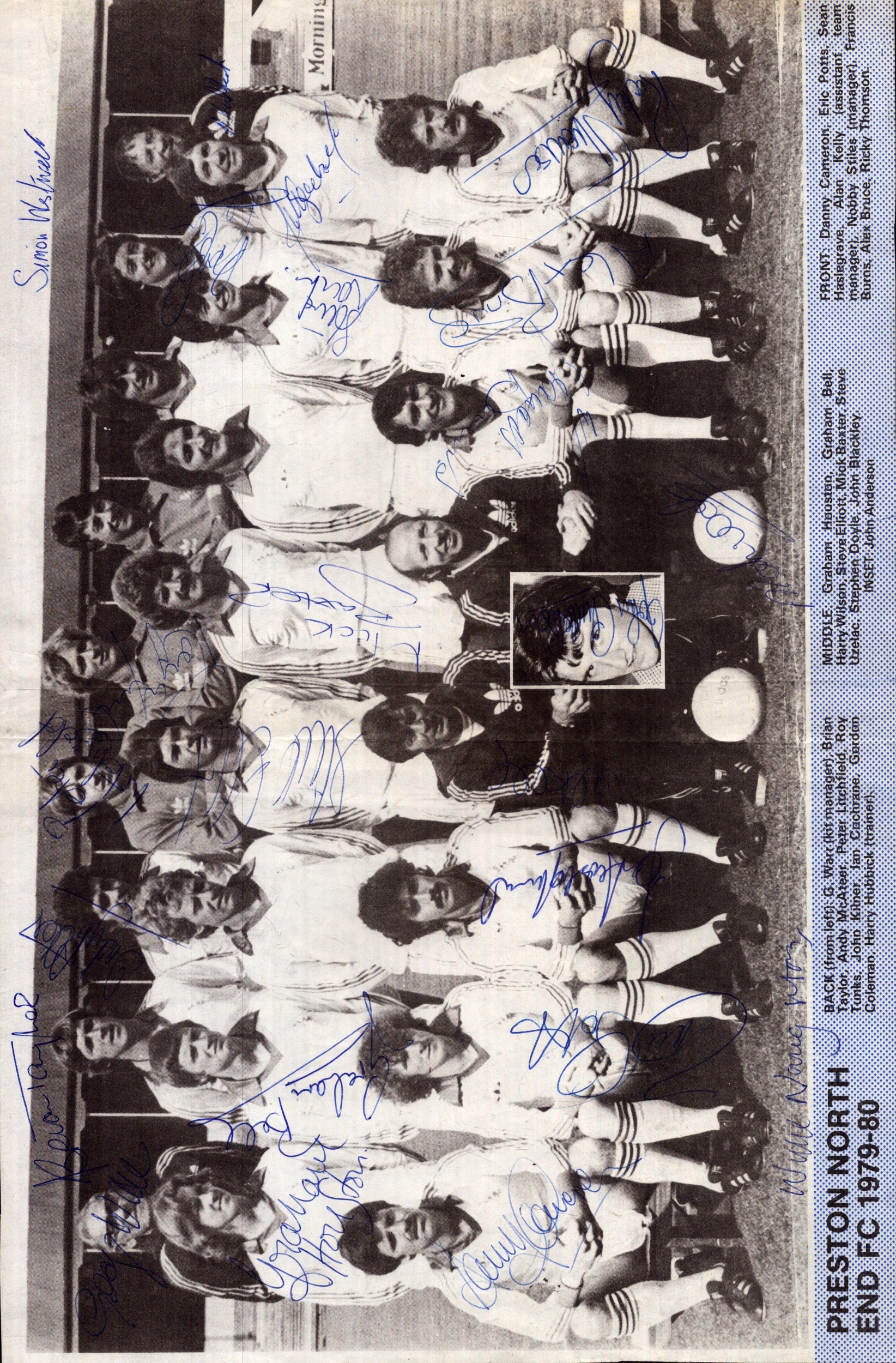 Brian Taylor, Graham Bell, Eric Potts and others signed Preston North End FC 1979-80 magazine page.