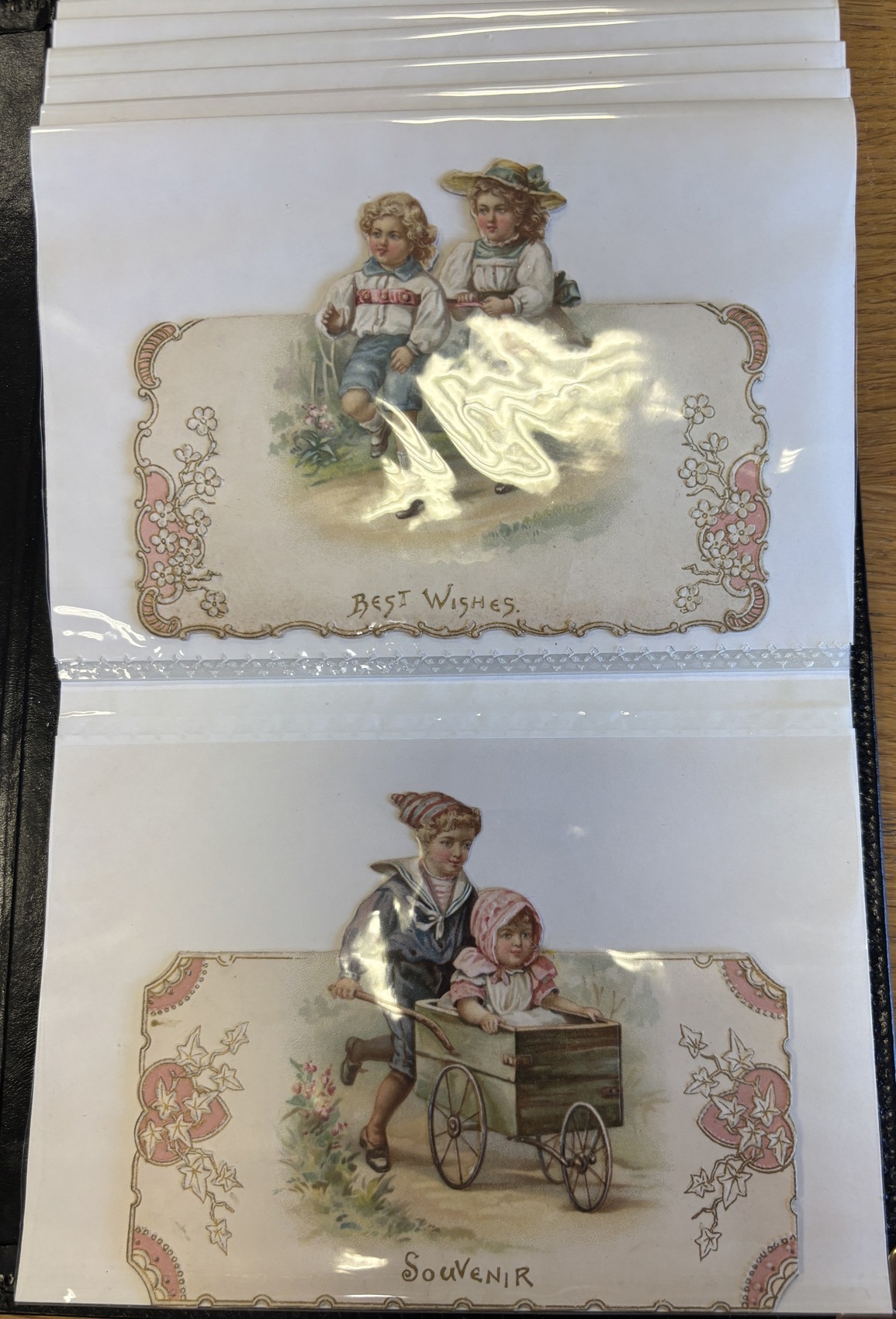 Greetings. Coln. in 9 albums of mostly QV-KEVII cards, incl. artist drawn Birthdays, Christmas, New Years, strong ranges of embossed cards with flowers, birds, playing cards and artists with Harry B. Nielsen. Qty. approx. 150+. (B)